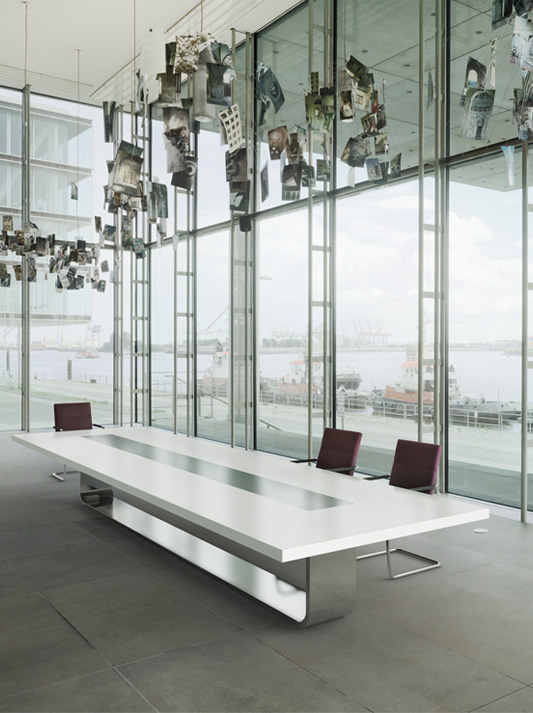 太空中的雕塑:建筑师哈迪·德黑兰尼的会议桌系统S 8000将高功能与完美的质量和视觉轻盈相结合。像丝带一样,优雅的金属底座支架继续在桌面表面,在那里它成为一个功能表面 - 中央元素。多媒体模块可以单独集成。电缆在支撑基结构中无形中运行。