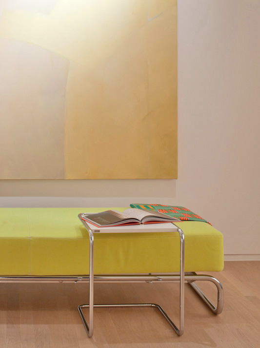 优雅、灵活,适合各种用途。在尺寸上,表集B 97让人想起马塞尔·布劳尔的筑巢表B 9。然而,它改变的结构提供了一个实际的优势:由于一侧的开口,桌子可以拉过沙发、扶手椅或床边。它们也可以方便地相互推入。1933 年 Thonet 设计是管状钢制家具的经典之一。