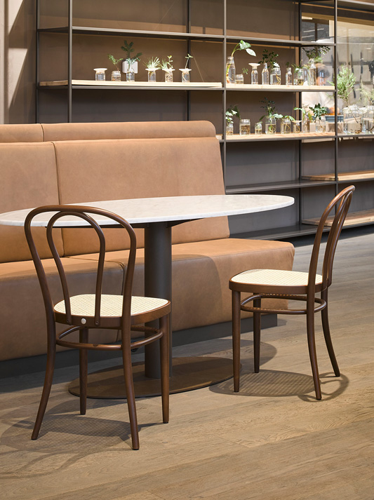 首次制造于1876年,模型18与惊人的"发夹"在其背靠背返回到Thhonet组合与清晰和减少美学为218。除了14号和56号椅子,18号椅子也是Thonet生产的畅销机型之一。它被称为格布吕德·托内特的"出口椅",经常在餐馆和咖啡馆出售,尤其是在南美洲。拆解成单独的部分,36把椅子适合在海箱,使大量的椅子很容易被发送长途旅行。No. 18 - 现在与型号 218 - 再次在弗兰肯伯格生产。