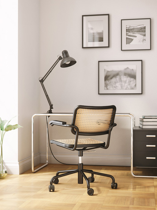在管状钢制家具车型中,悬臂椅S 32特别多功能。它在各种设计世界中处于家居,与毫不妥协的现代室内设计以及多样化的组合相得合一,为不同的时代和风格提供空间。悬臂椅S 32和版本S 64与扶手是最有名的管状钢经典。新旧结合的吸引力促成了它们的流行:Thonet 的传统是生产具有维也纳柳条厂特色的弯曲木家具,这与管状钢的革命性使用形成鲜明对比。座椅和靠背由弯曲的实木制成,带柳条代表传统,框架代表现在和未来。凭借其多功能性,他们成为畅销的悬臂椅,现在仍然。马塞尔·布劳尔在1928年柏林期间设计了S32和S64。自1930年以来,Thonet一直在生产这两款车型。由于其美学的减少和清晰度,加上通风的柳条,经典适合最多样化的环境,从会议室和候诊区到餐厅和私人住宅。