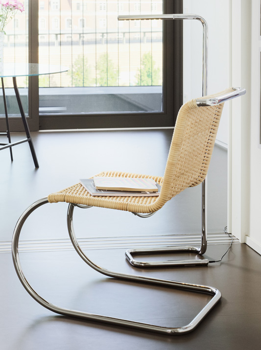 技术变成家具:一项引人注目的发明成为优雅的室内设计对象。路德维希·米斯·范德罗赫是第一个为悬臂椅提供美感轻盈,并将其与弯曲线条的环境联系起来的人。在他组织的魏森霍夫庄园展览的运行前,米斯·范德罗赫熟悉了悬臂椅的原则,这要归功于马特·斯塔姆。尽管这种方法可能很新,但米斯·范德罗赫对斯塔姆的首次实施并没有留下深刻的印象。他立即用他自己的审美解决方案回答了技术创新问题,他于1927年提出了这一解决方案。S 533 是最早的悬臂椅之一,它以其大而优雅的弧形管状钢结构定义了周围的环境。S 533 的特点是有意限制所用材料、线条的优雅性和效果的透明度。它之所以特别舒适,是因为它能够通过弯曲不断调整到位置。虽然大多数20世纪20年代初的设计都强调功能方面,强调简单,但这款扶手椅带有建筑师的特色感:Mies van der Rohe 的奢华设计结合了功能、舒适性和永恒的美学。S 533 代表对质量的改变看法。