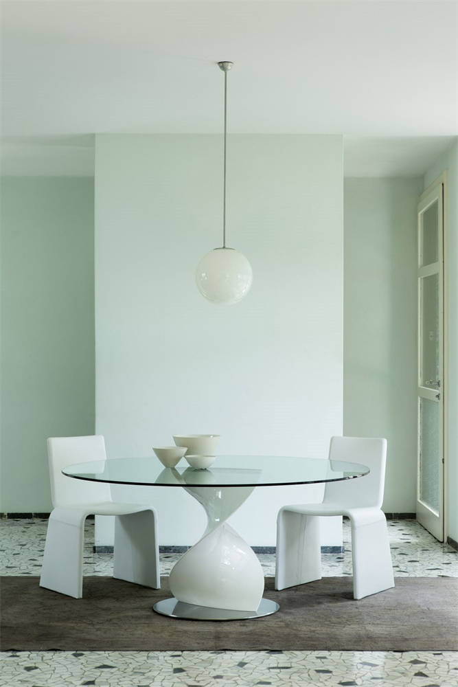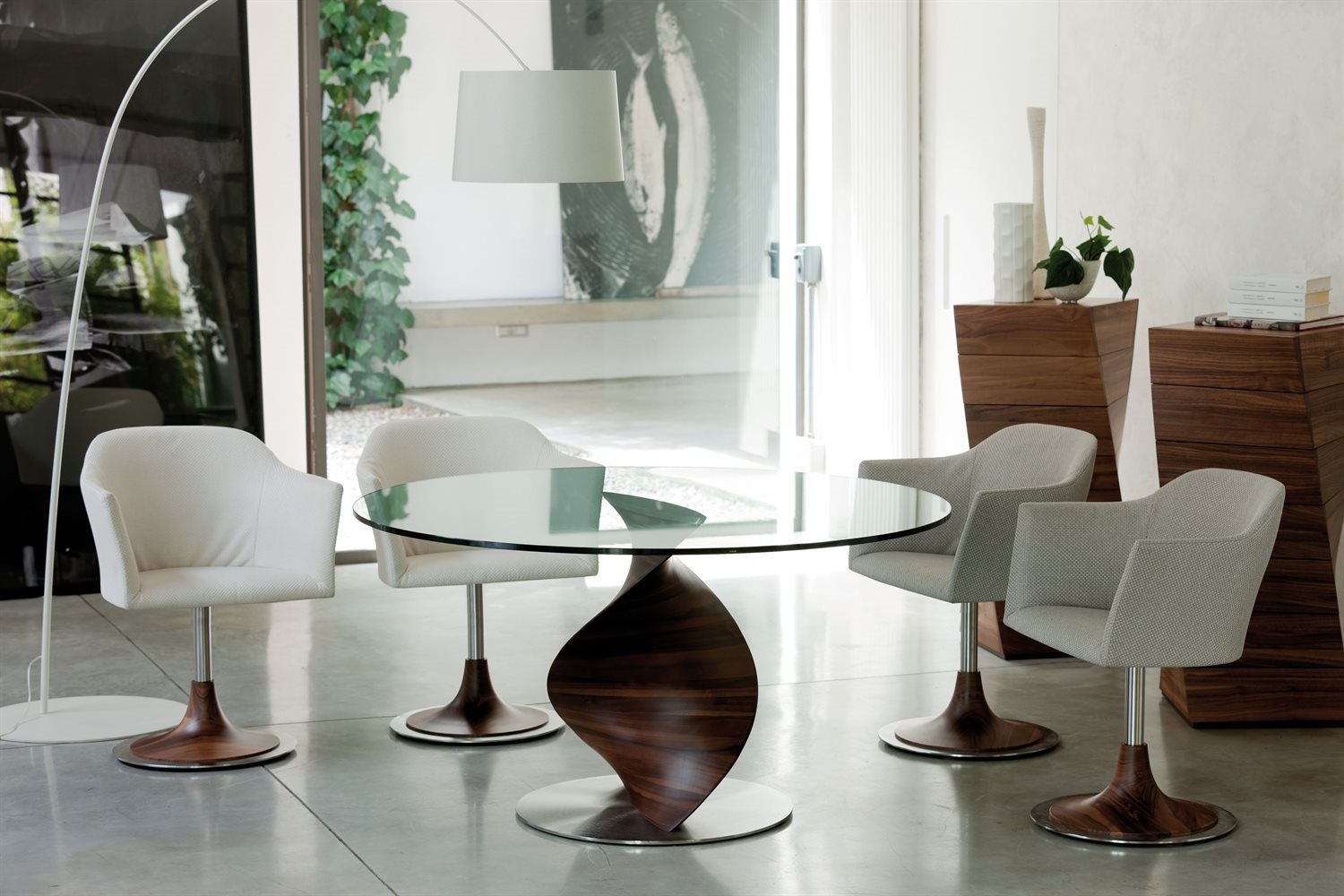 餐桌上有结构技术聚合物、固体孔榴核桃或安装在金属板上的灰烬和钢化玻璃顶部(厚度 mm. 12)。