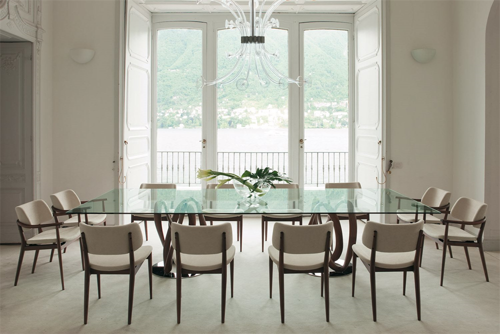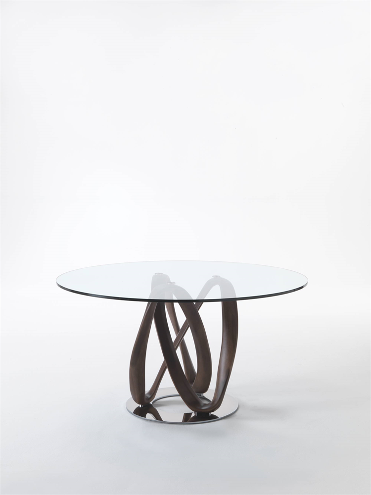 餐桌上有固体运河核桃底座,安装在金属板和钢化玻璃顶部(厚度毫米12)。