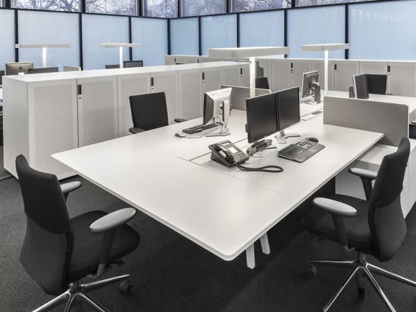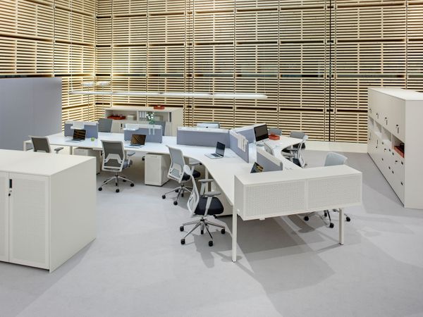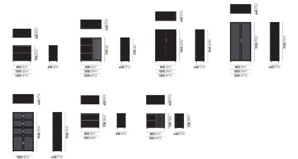 储物柜系列 – 配备有搁板、铰链门、抽屉或卷帘百叶窗 – 有多种不同的高度和 80、100 和 120 厘米的宽度。机柜单元可以垂直、水平和背对背连接。