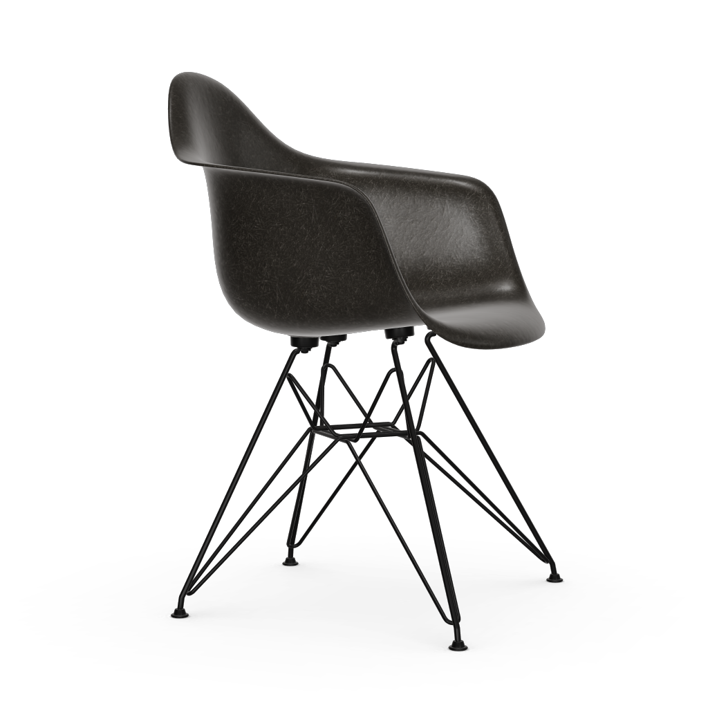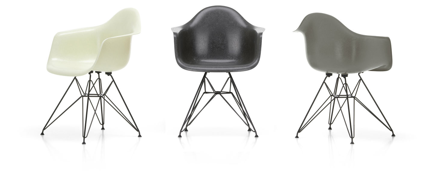 Dining Height 扶手椅杆底座 (DAR) 的所谓埃菲尔铁塔框架是一种由钢丝制成的金银丝结构,结合了结构稳定性和形式上的轻盈性。为了获得更好的舒适度,Eames 玻璃纤维椅还提供座垫。