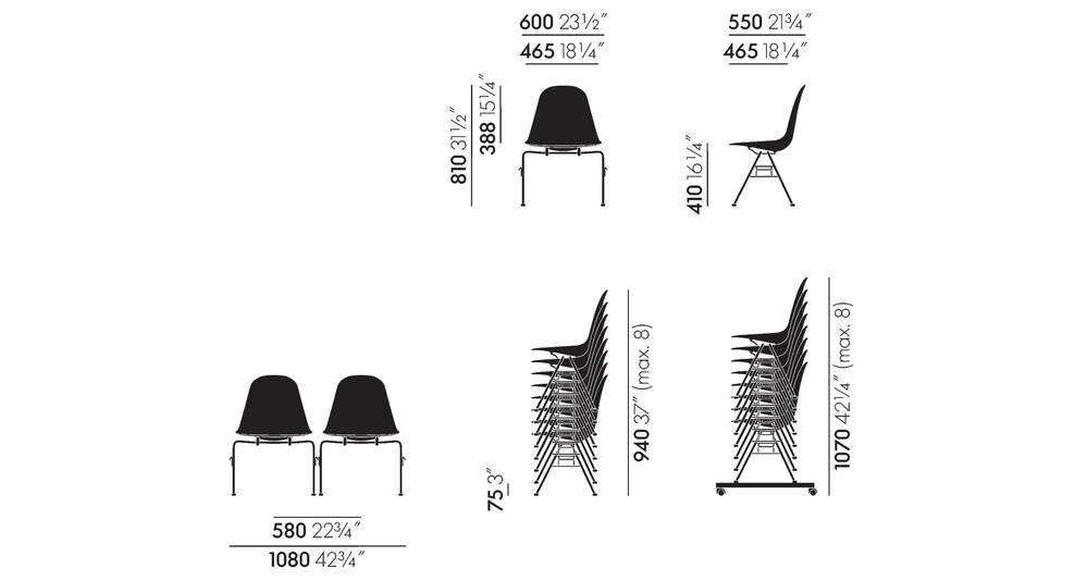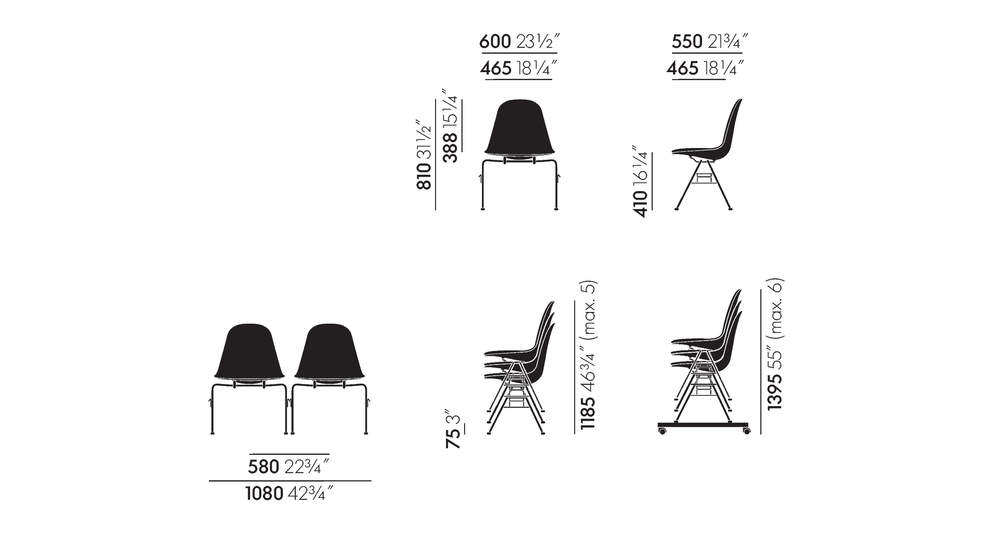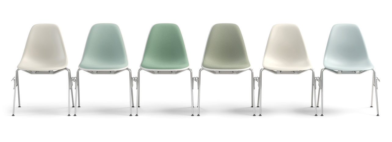 Charles 和 Ray Eames 设计的坚固塑料椅的某些版本特别适合在有大量座位的公共区域使用:用餐高度侧椅堆叠底座 (DSS) 可以堆叠和连接。它还可以提供行编号元素和编号夹。