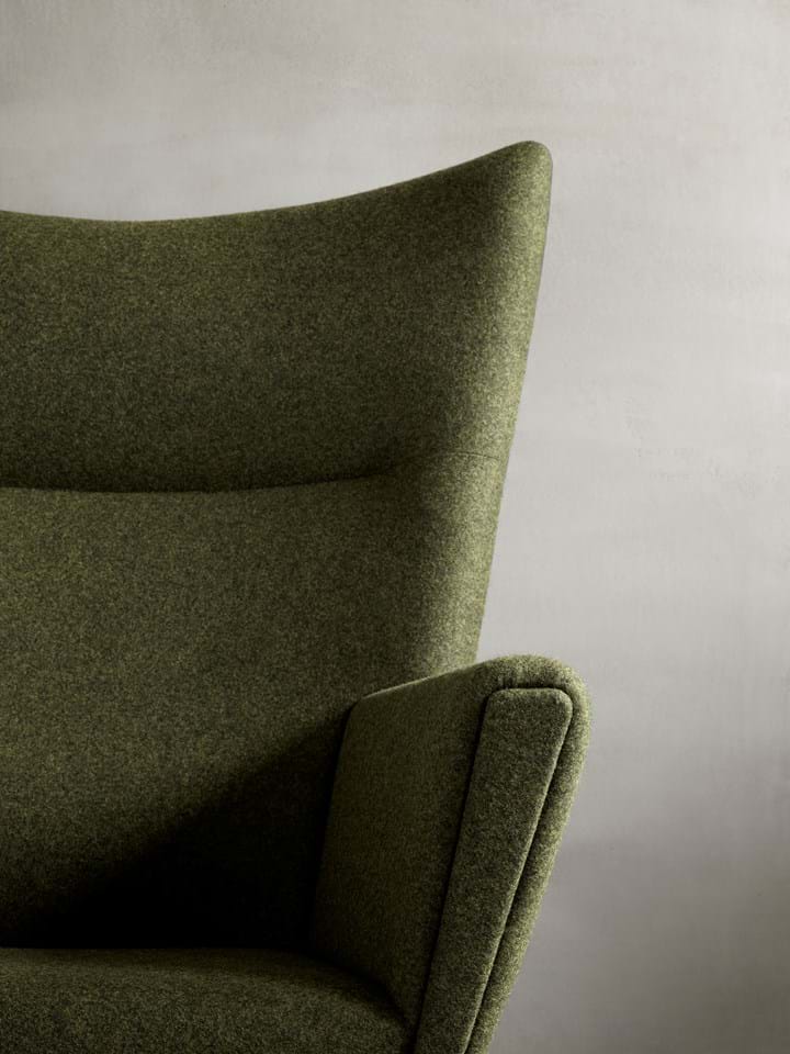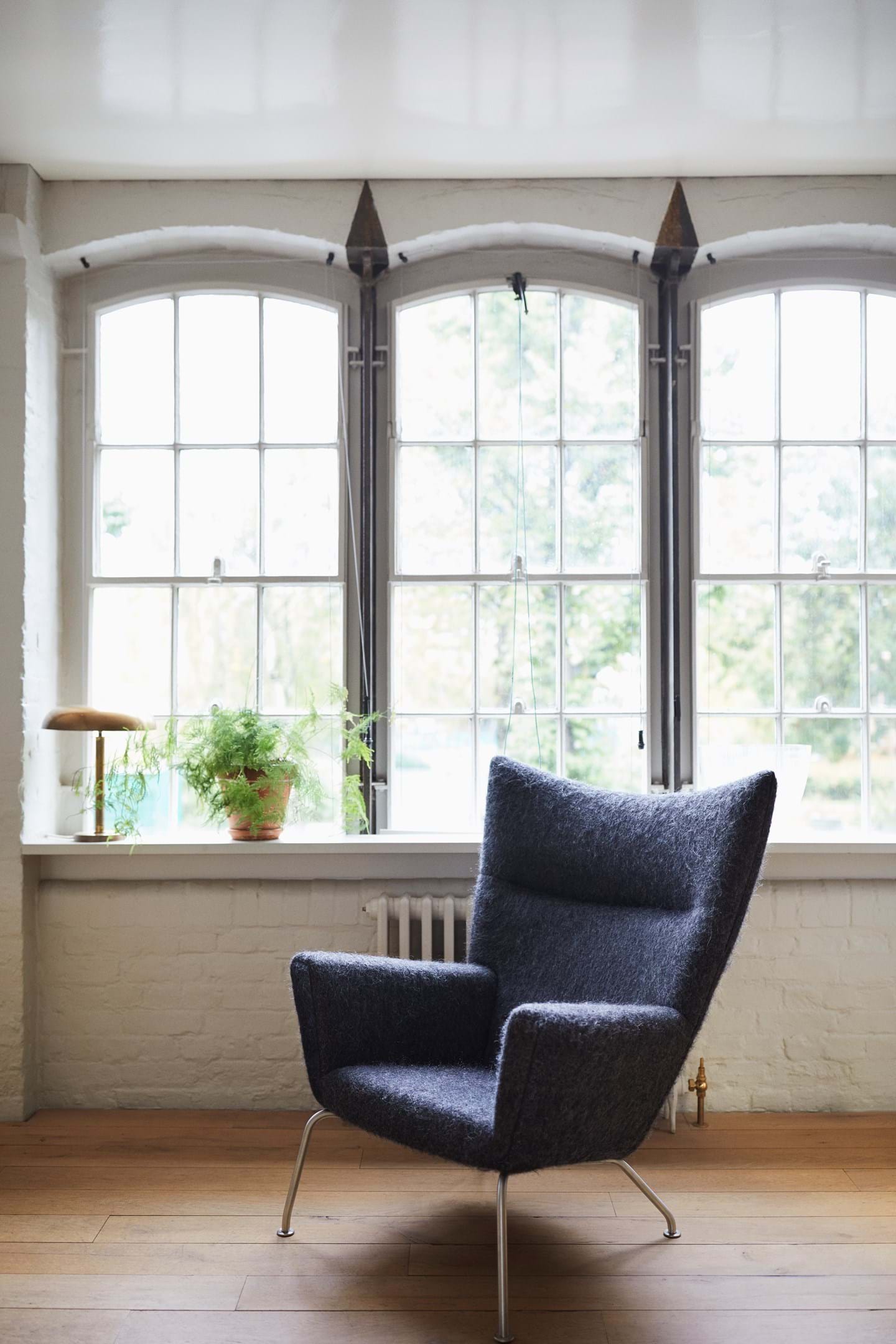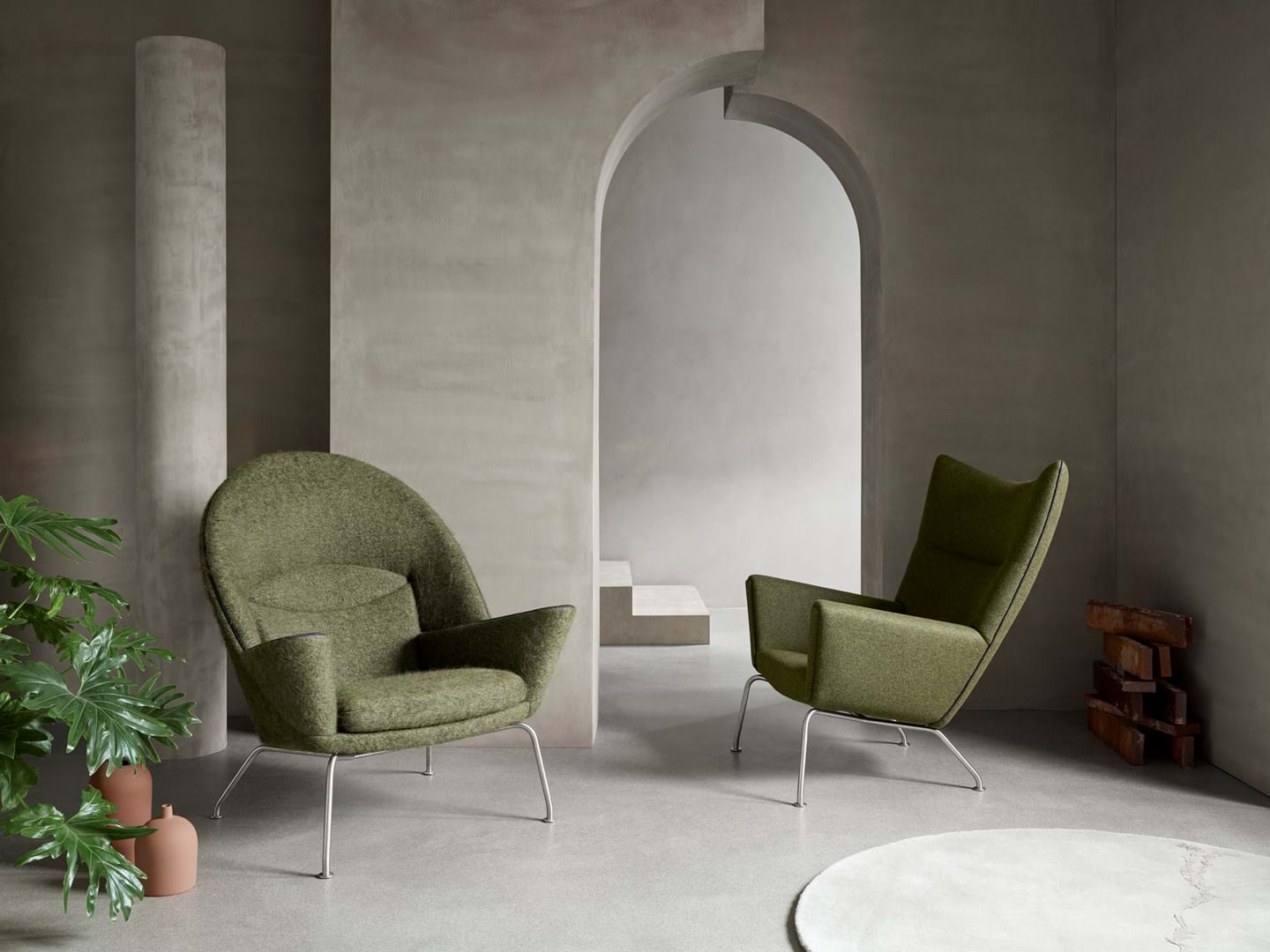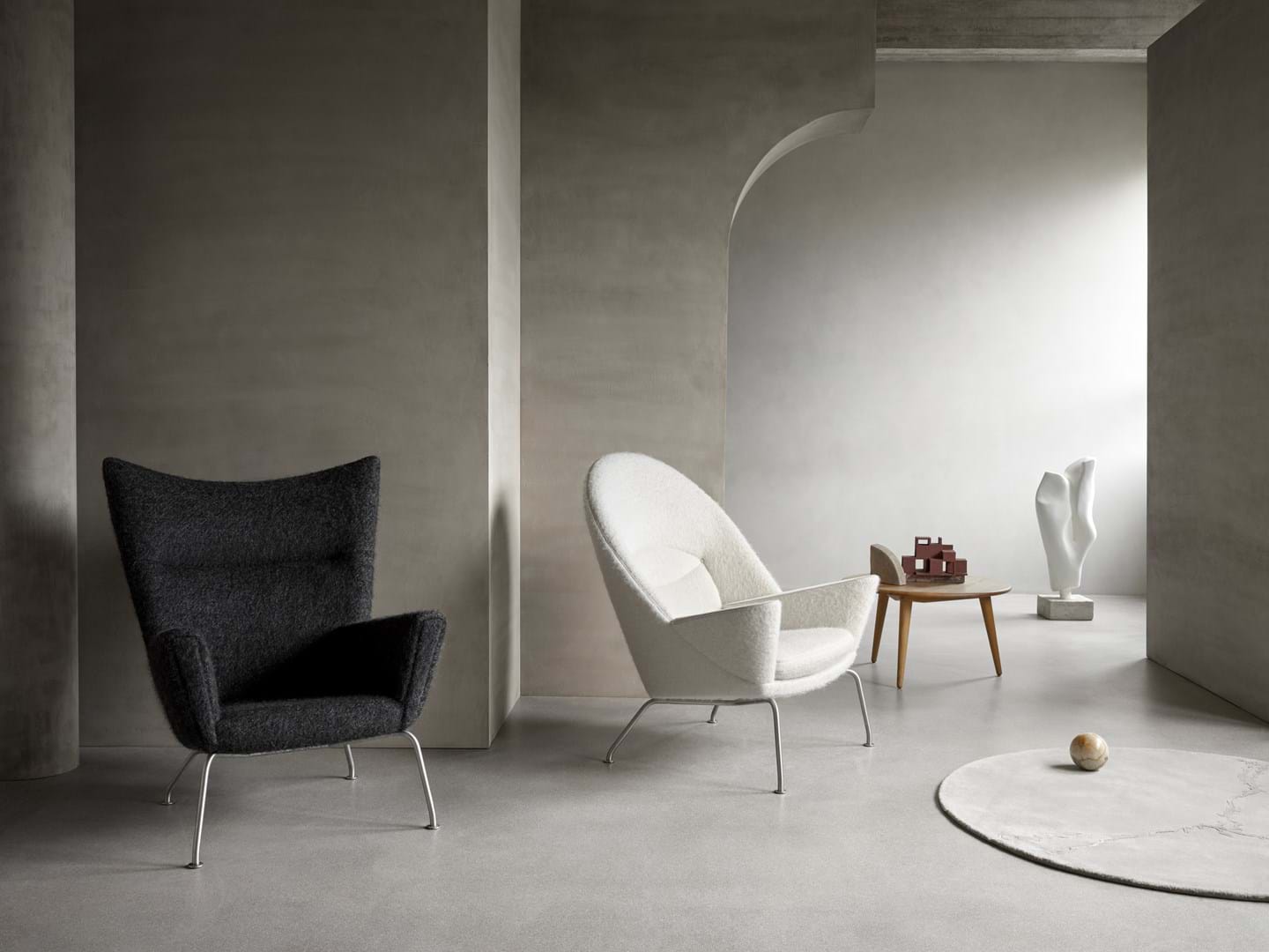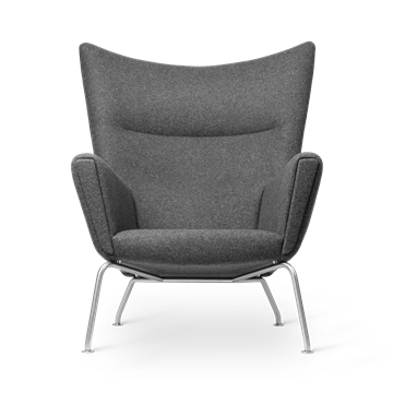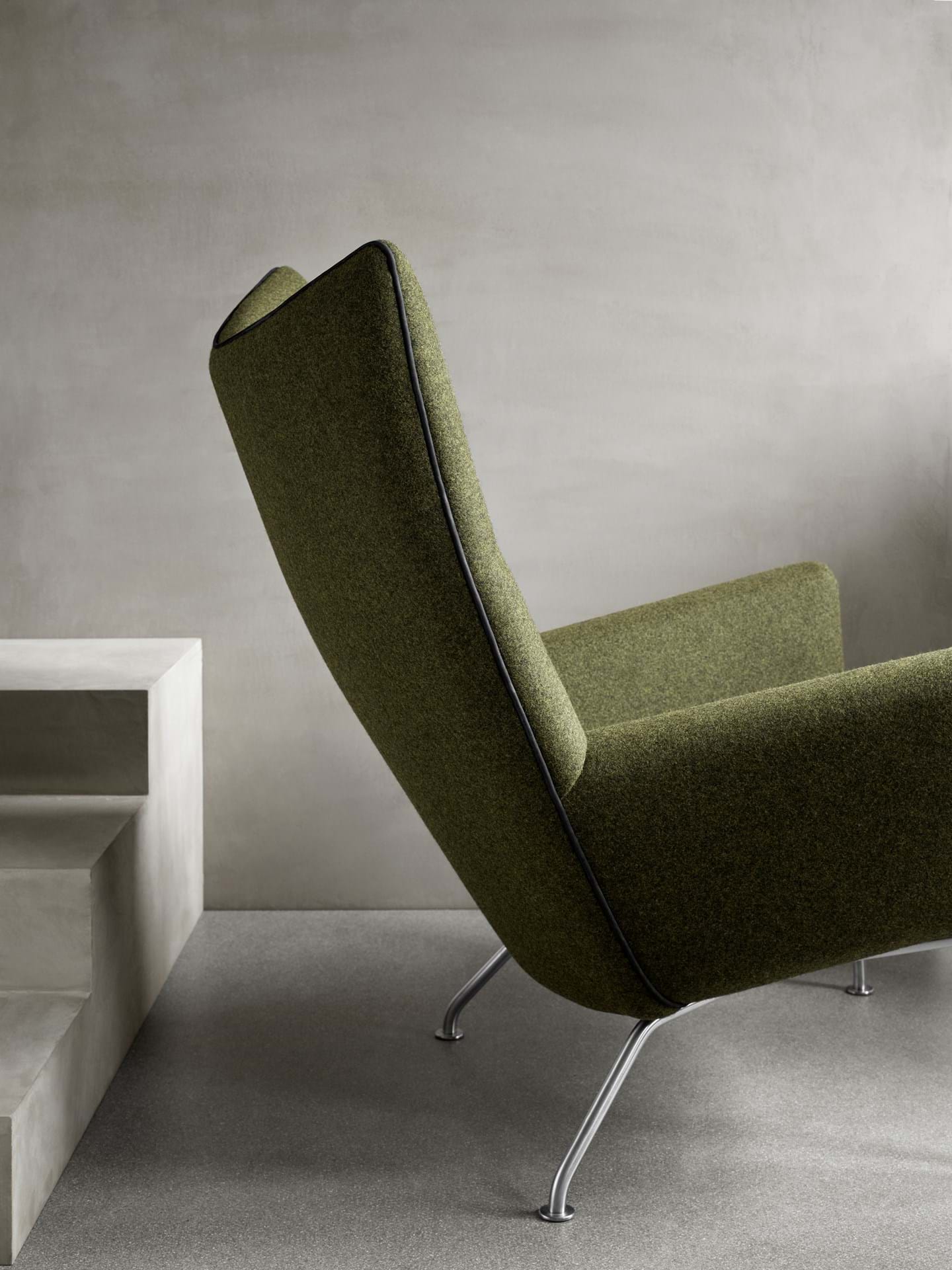 CH445 翼椅是一个高背、软垫扶手椅,配有不锈钢框架。汉斯·韦格纳在雕塑设计方面的专业知识和对高质量工艺的需求,在这个戏剧性的椅子上清晰地表达了出来。