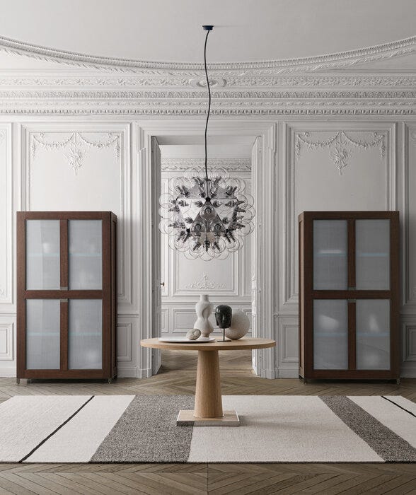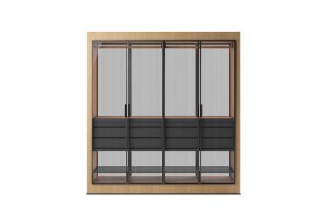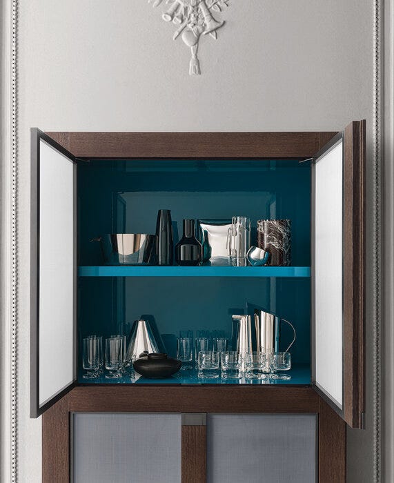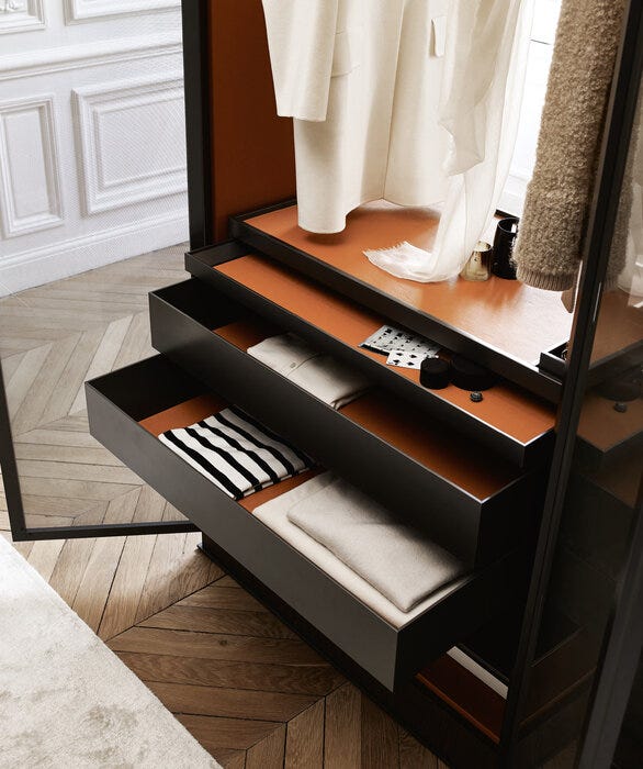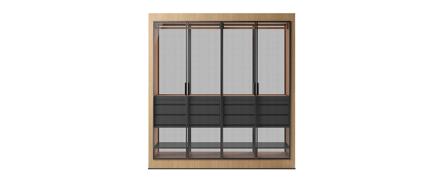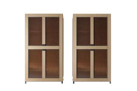 用于睡眠区的 Eracle 储物单元采用严谨、均衡的比例。它还提供双面版本,其特点是体积、门和背面采用透明玻璃(内部衬有高科技织物)和金属型材。珍贵材料的使用确保了简约、精致的美学:木制框架采用目录中的所有精华,而内部衬有三聚氰胺饰面殖民地皮革,并配有一个抽屉柜。殖民时期皮革制成的托盘和挂衣杆以及全套配件提供广泛的定制解决方案。位于储物单元内的灯提供了精致的复古细节,与 1950 年代的显示单元相呼应。