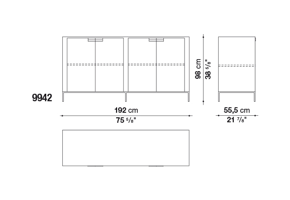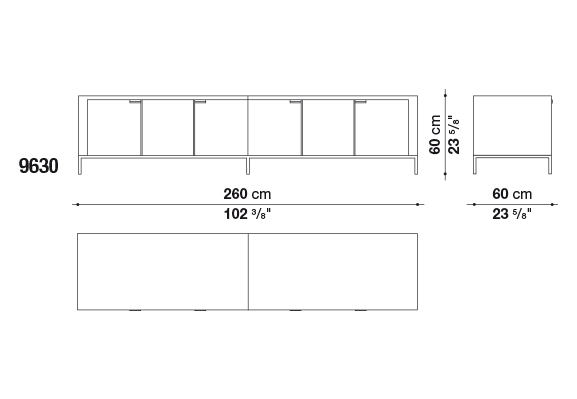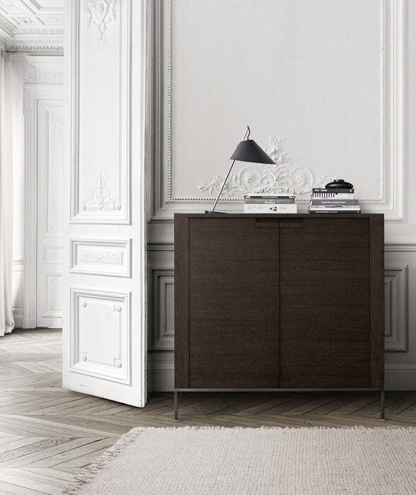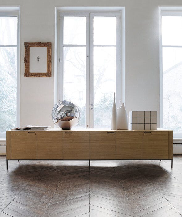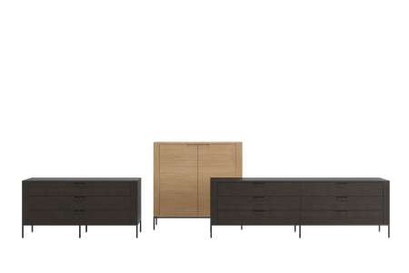 起居区的一系列储物单元,对传统餐具柜进行了现代诠释。从六抽屉版本到三抽屉版本,从折叠门与铰链门交替的变体到带有两个、四个或六个铰链门的单件。所有的 Titanes 存储单元都放置在金属框架上,并且它们都是木结构的。