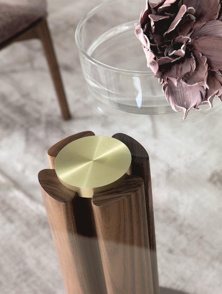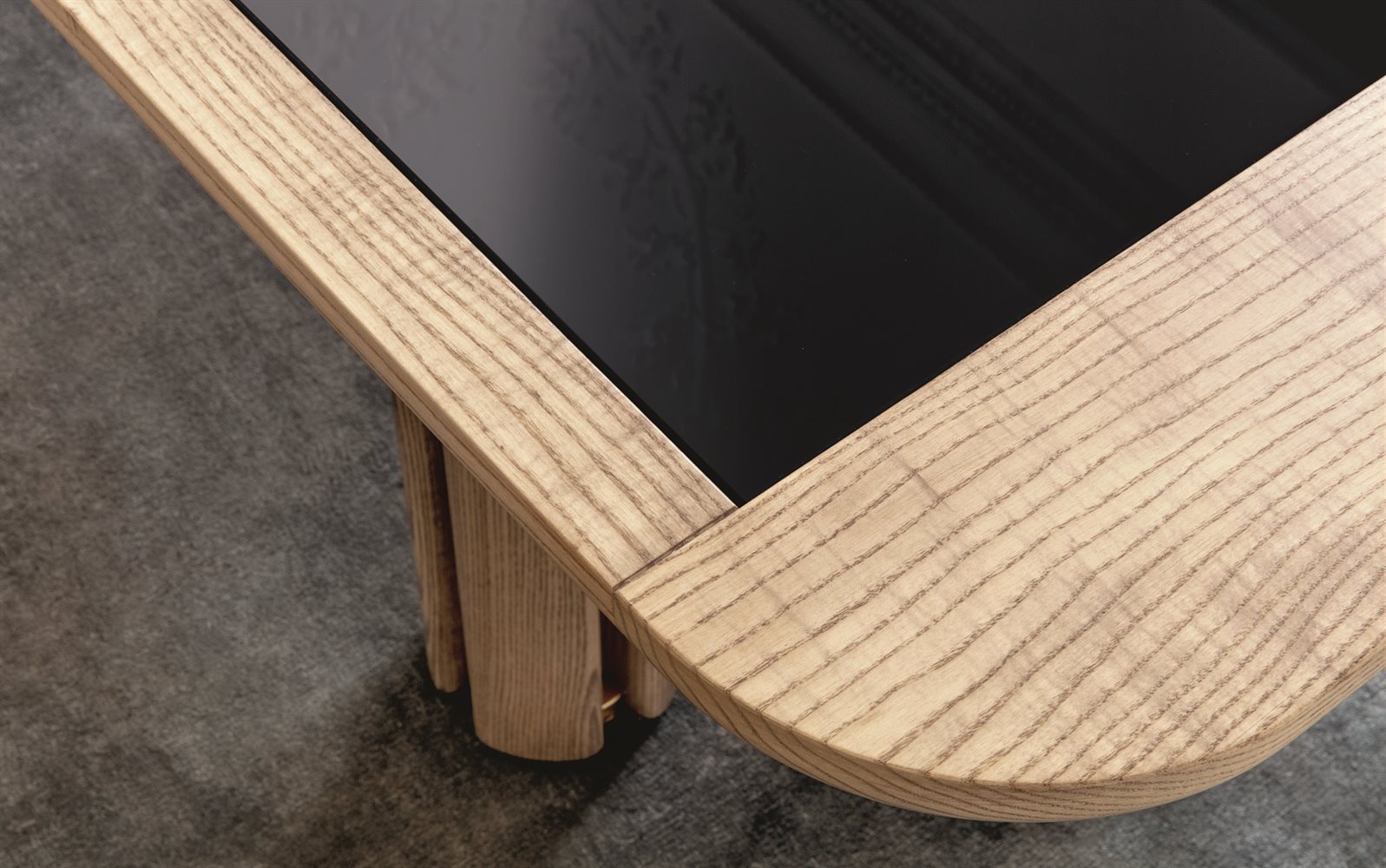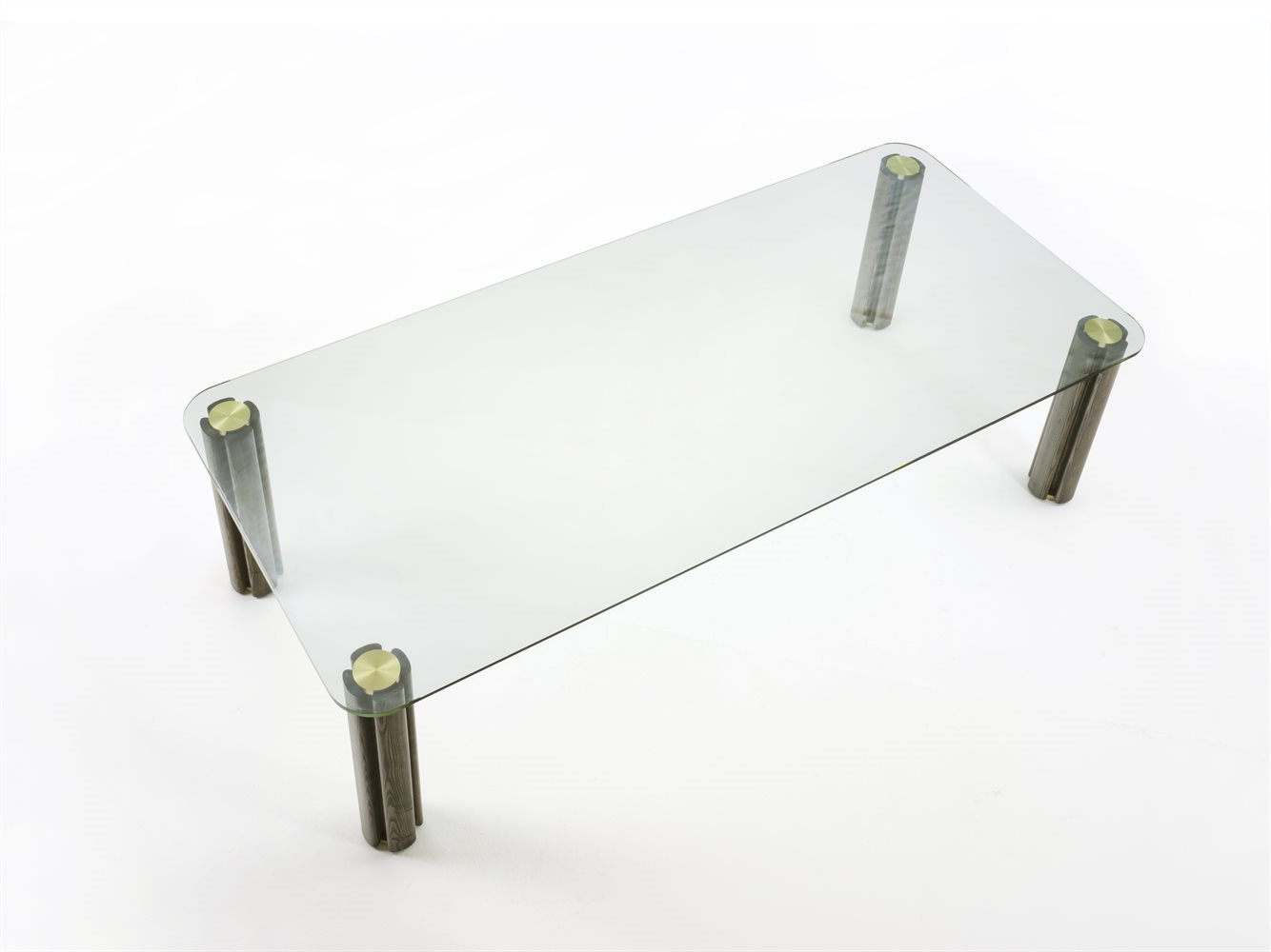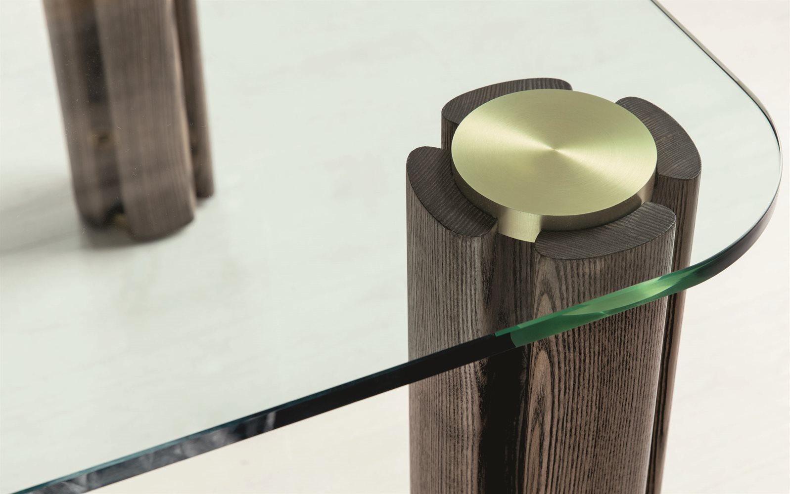 餐桌上腿部有实心灰,顶部框架有实心灰,顶部插入背漆玻璃,灰烬或岩石或顶部为透明玻璃。刷黄铜脚。