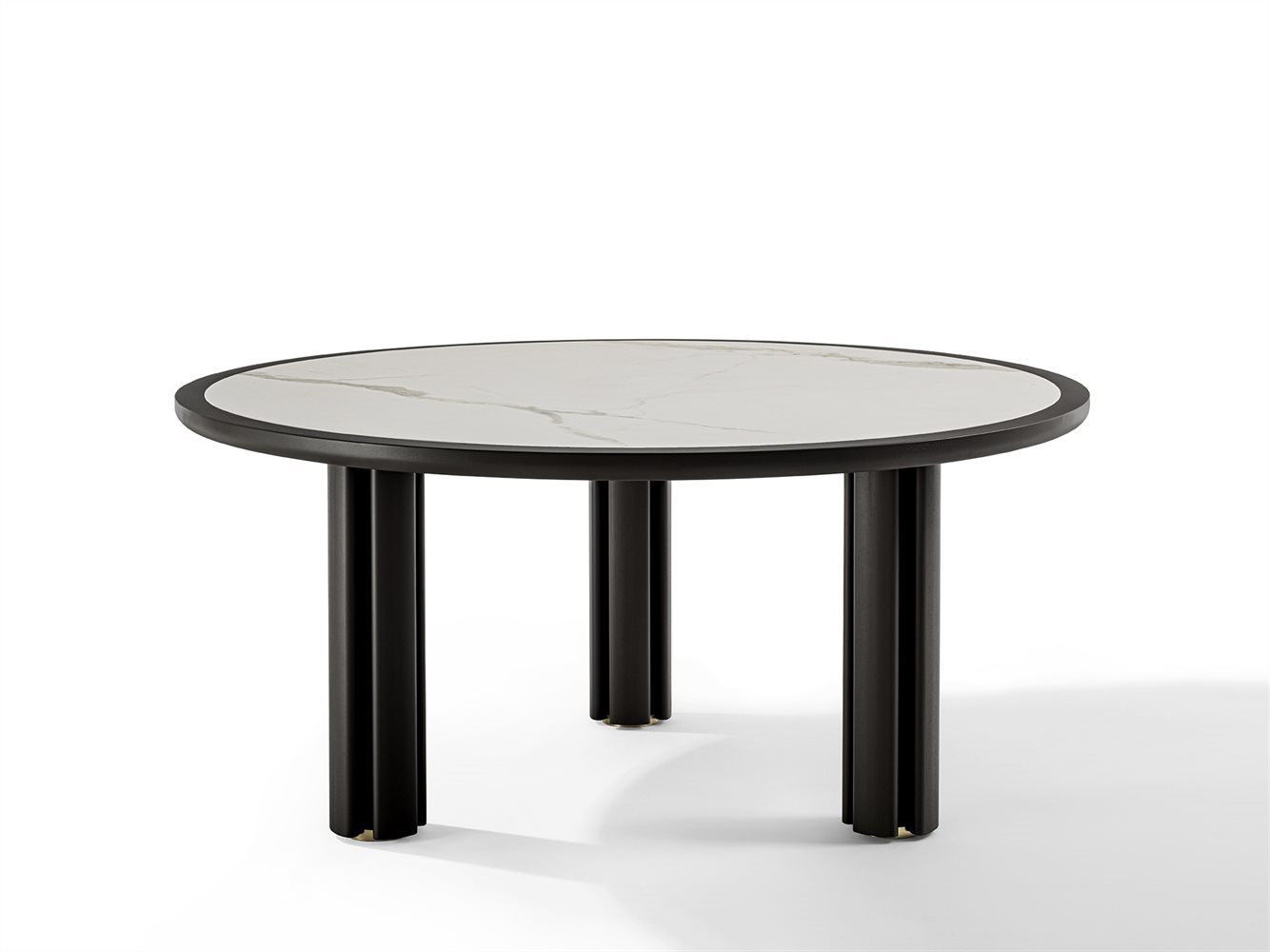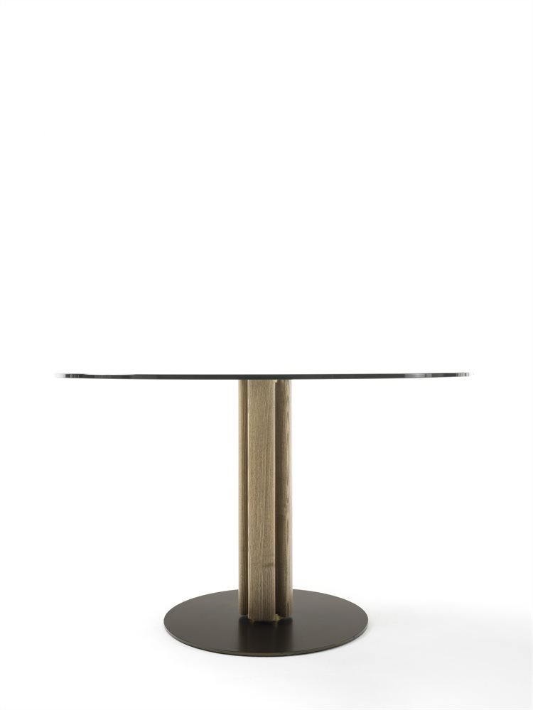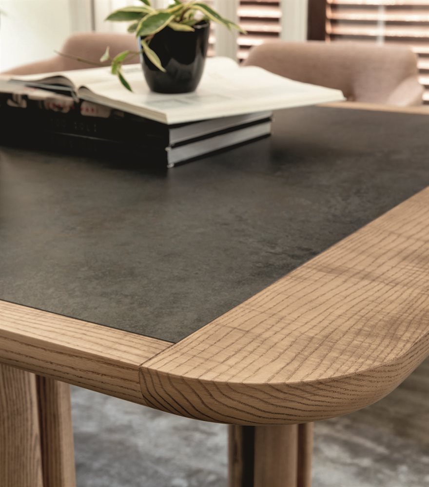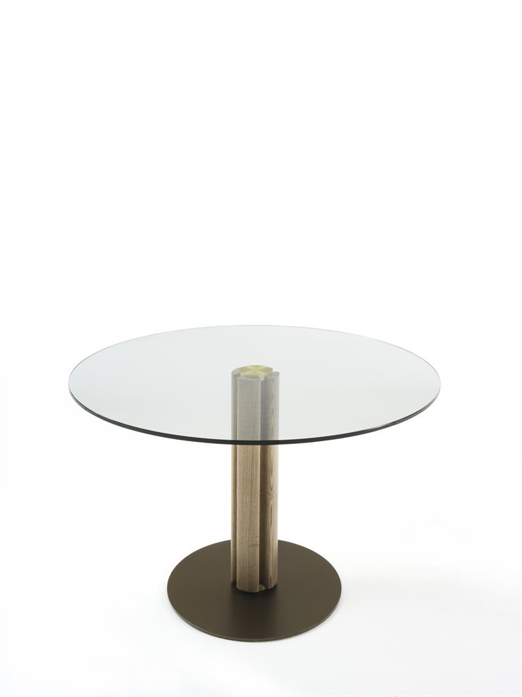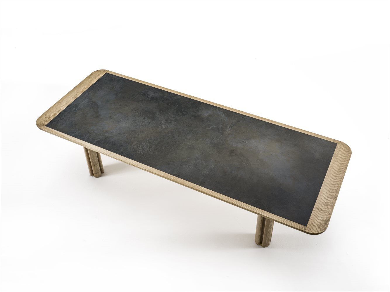餐桌上腿部有实心灰,顶部框架有实心灰,顶部插入背漆玻璃,灰烬或岩石或顶部为透明玻璃。刷黄铜脚。