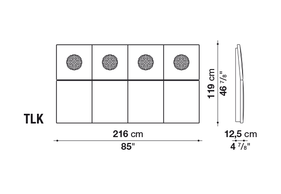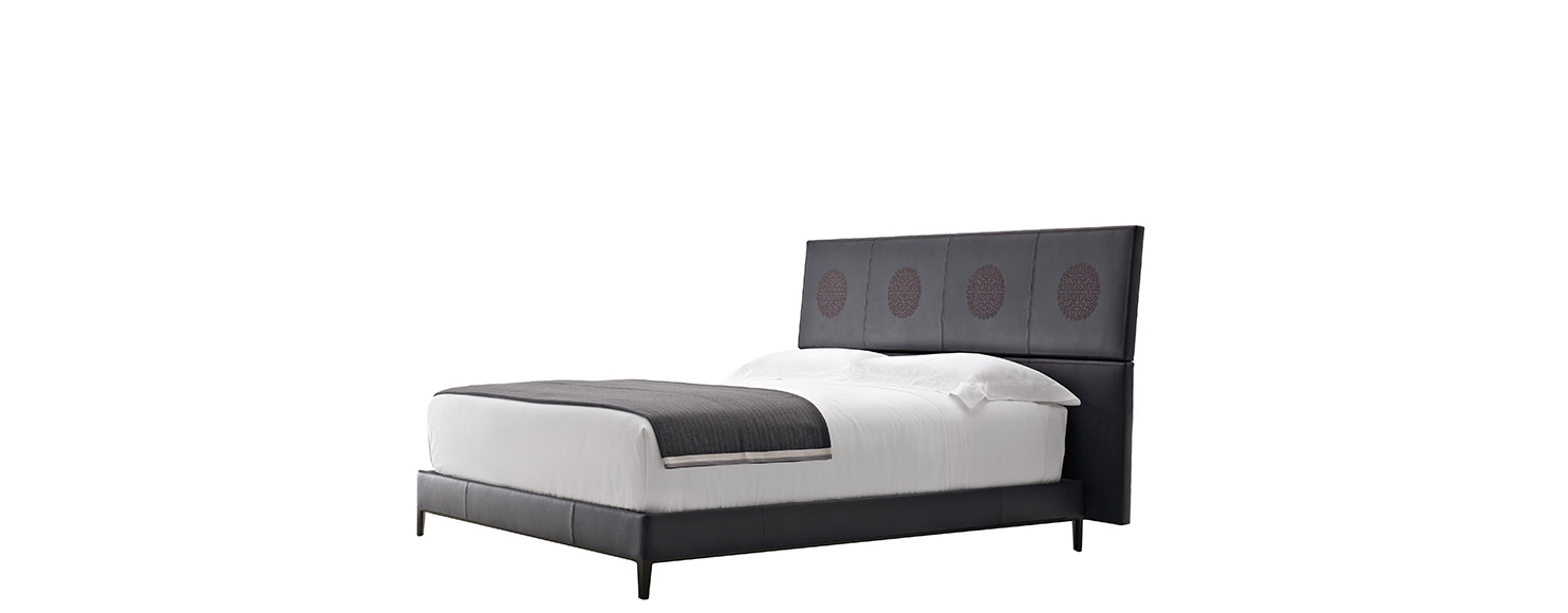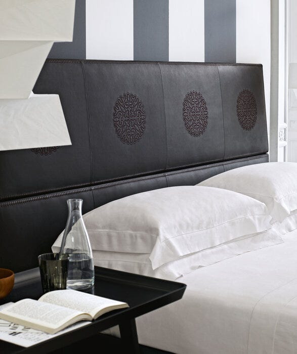 Erik 床头板(安装在不同高度的墙壁)由两个面板组成。顶部面板略微倾斜,并具有软化基本设计的装饰元素。圆形花边图案重复四次,以匹配的色调或对比色,伴随着床头板上周边周围的毯子针迹边框。这些装饰品让人回想起让 Cantù 以其手工蕾丝而闻名的传统,当时“bisetta”是 Erik 所用蕾丝类型的词(在当地方言中)。