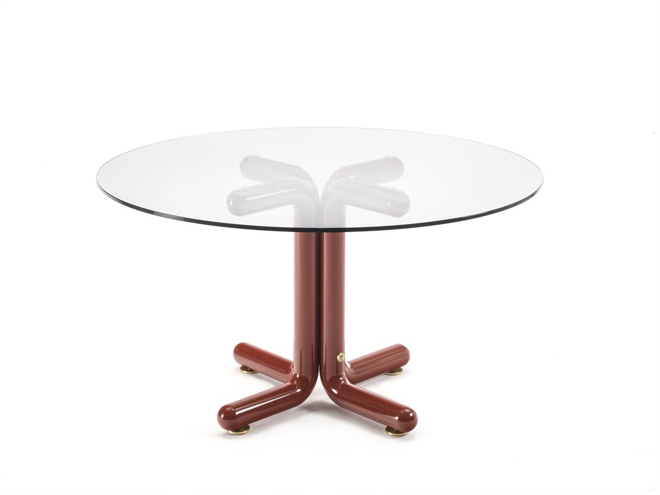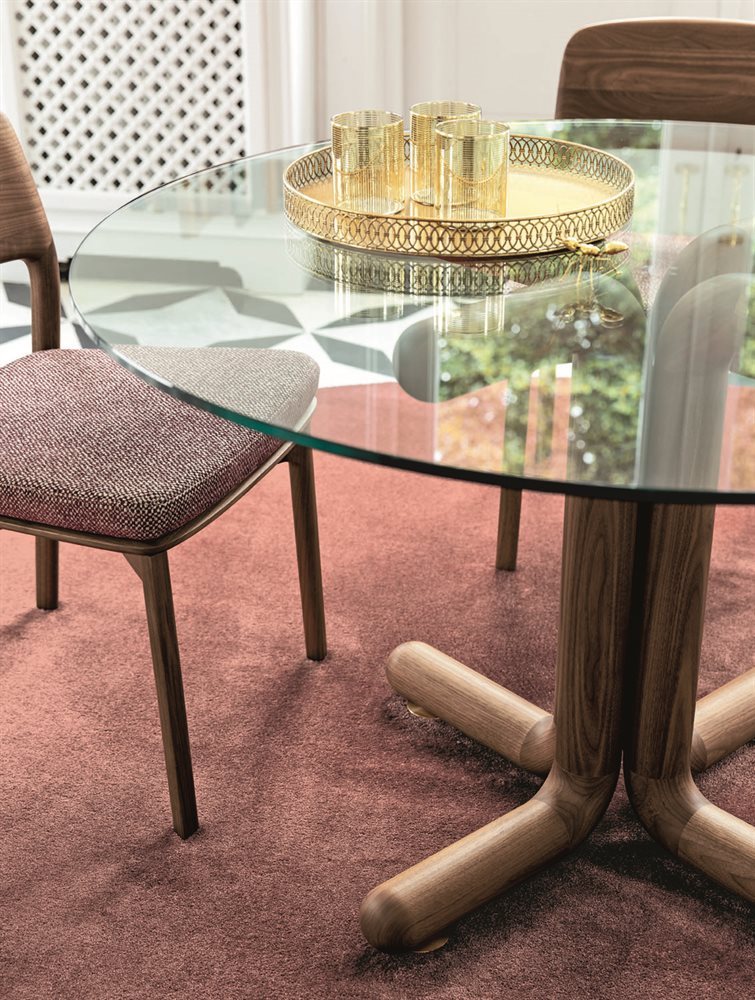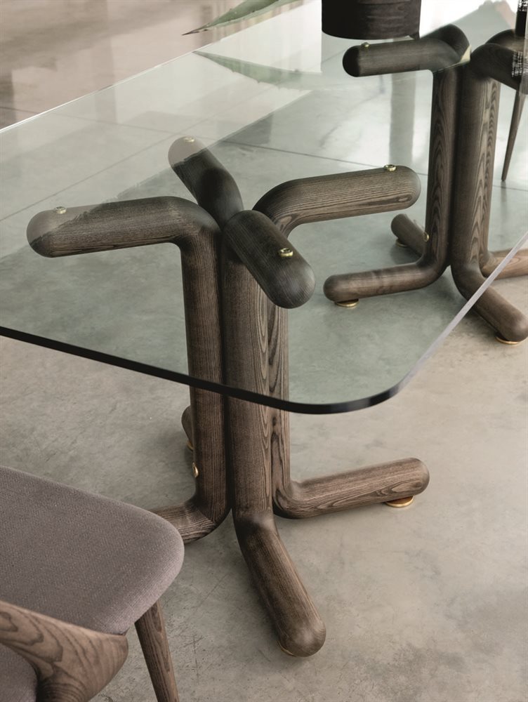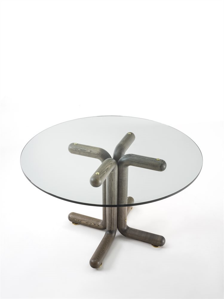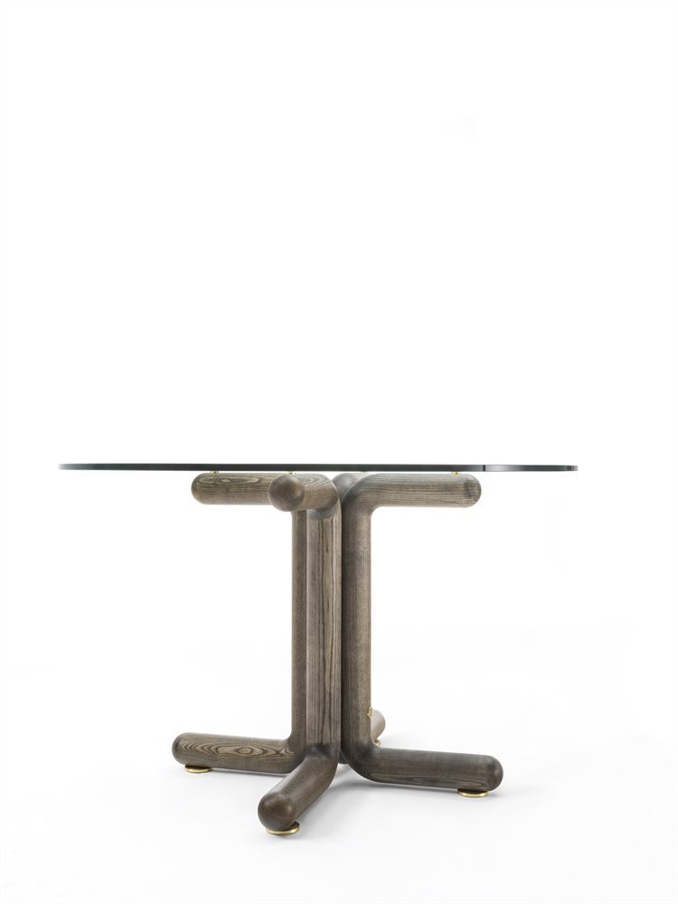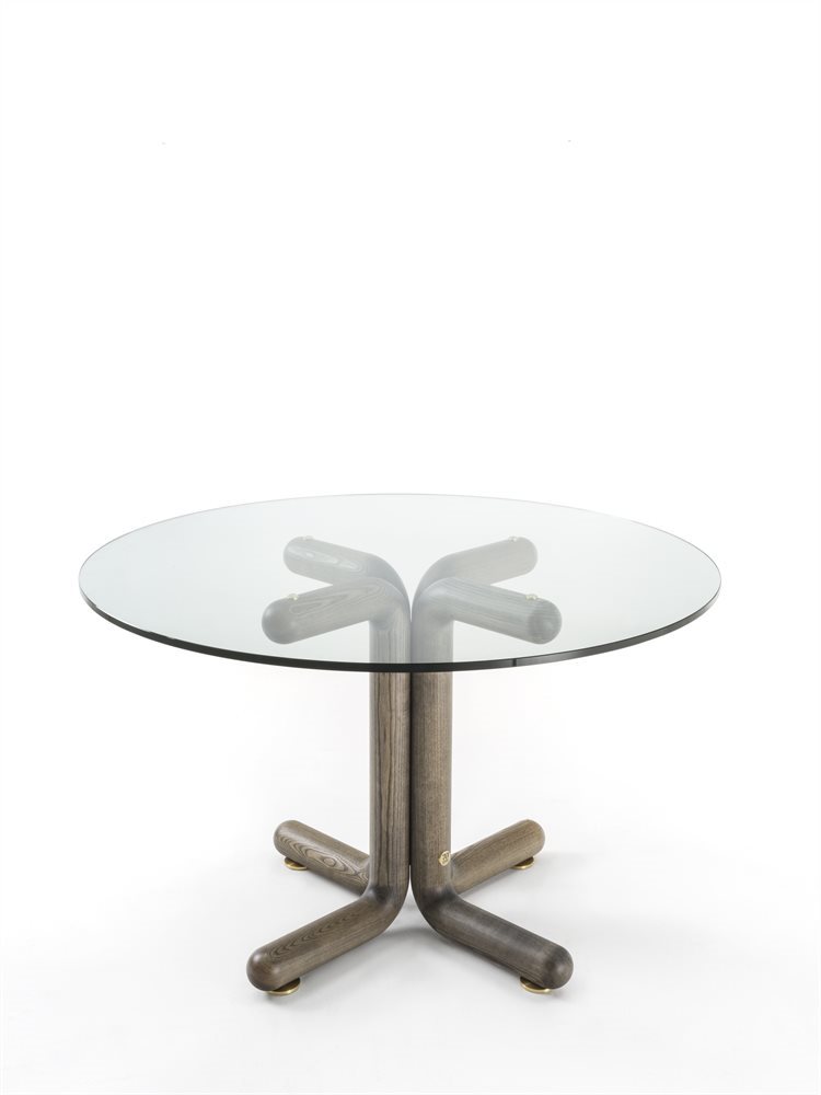 餐桌底部有实心灰或卡纳莱塔核桃或明亮的漆和圆形顶部的钢化透明玻璃。刷黄铜脚。