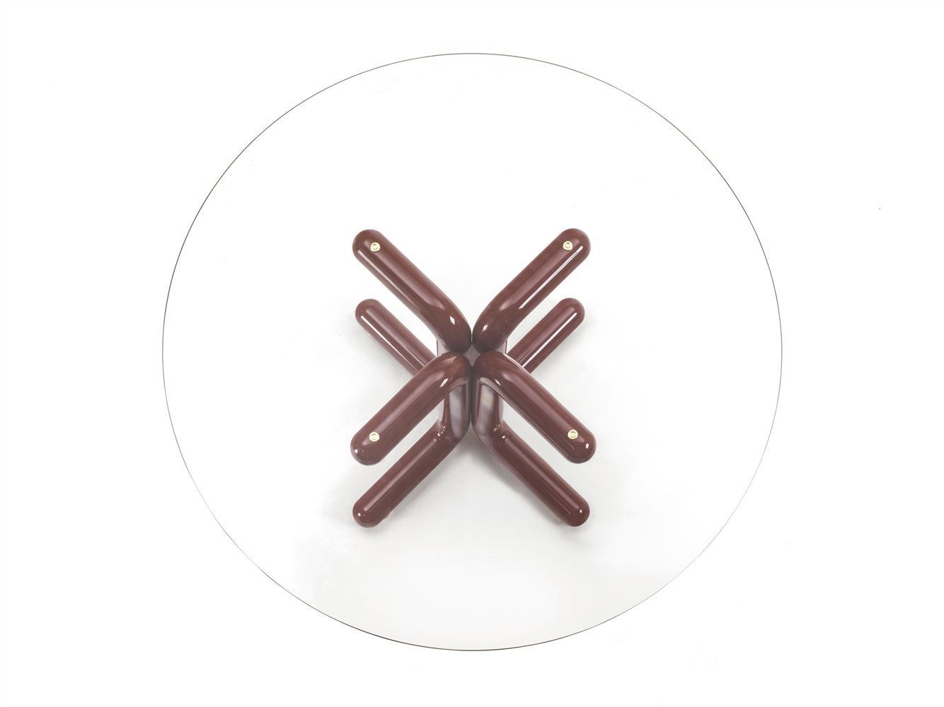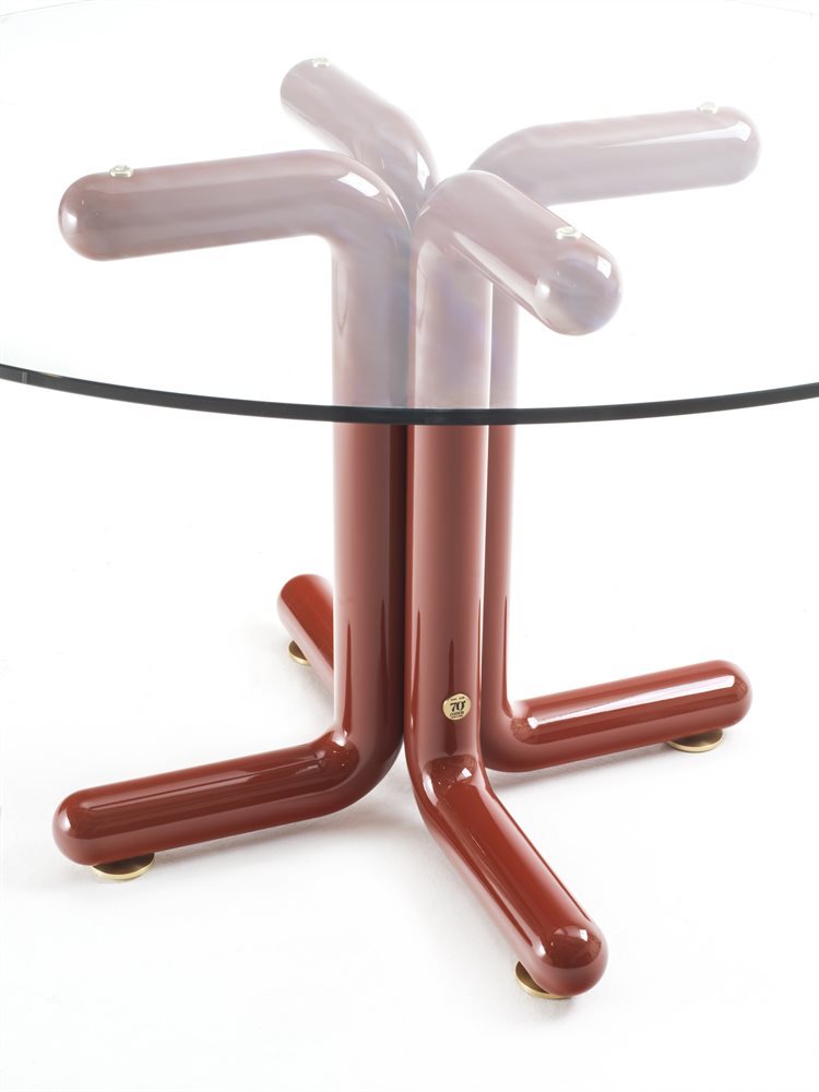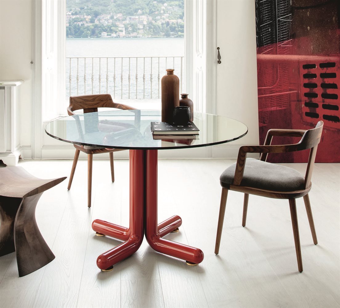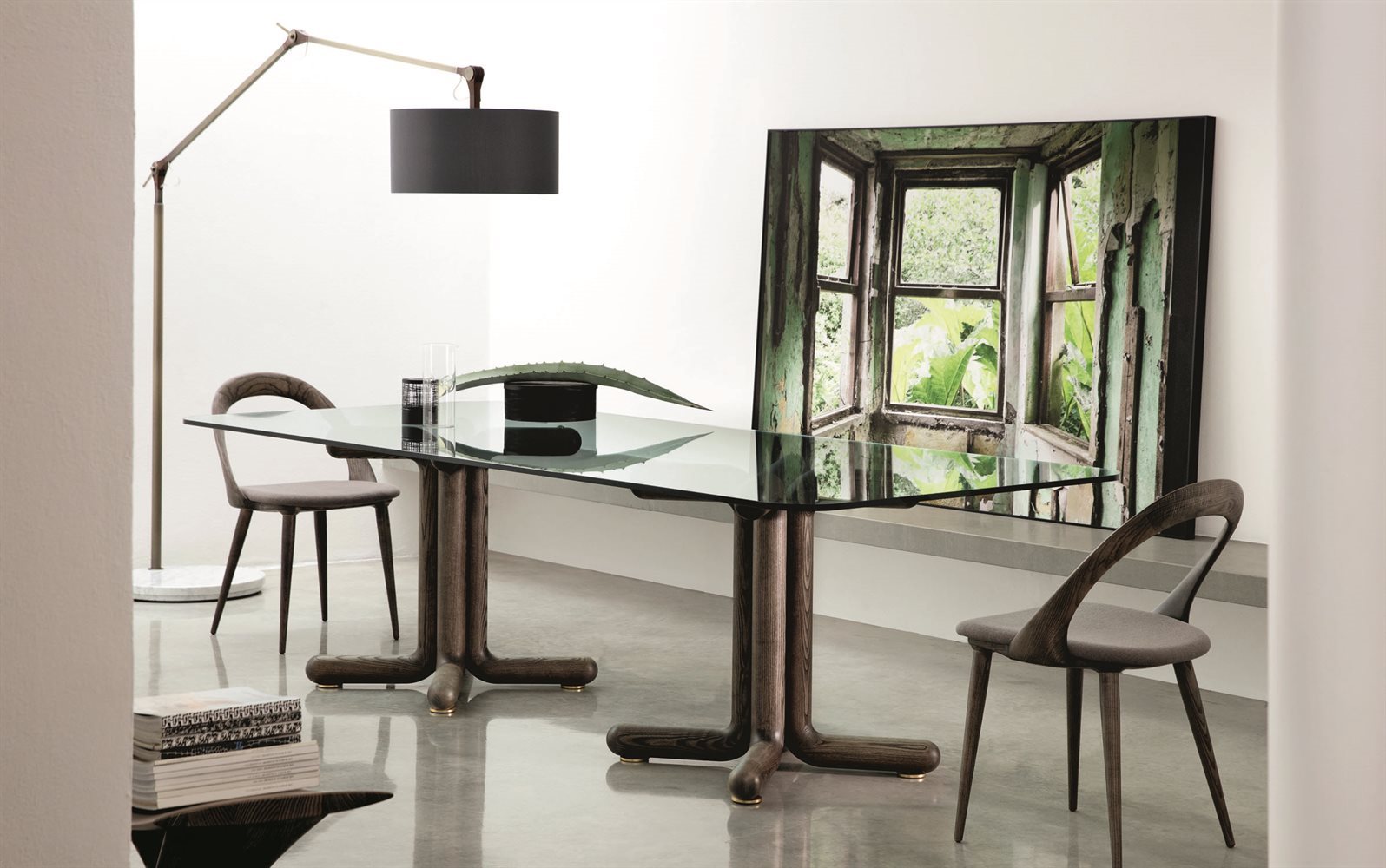 餐桌底部有实心灰或卡纳莱塔核桃或明亮的漆和圆形顶部的钢化透明玻璃。刷黄铜脚。