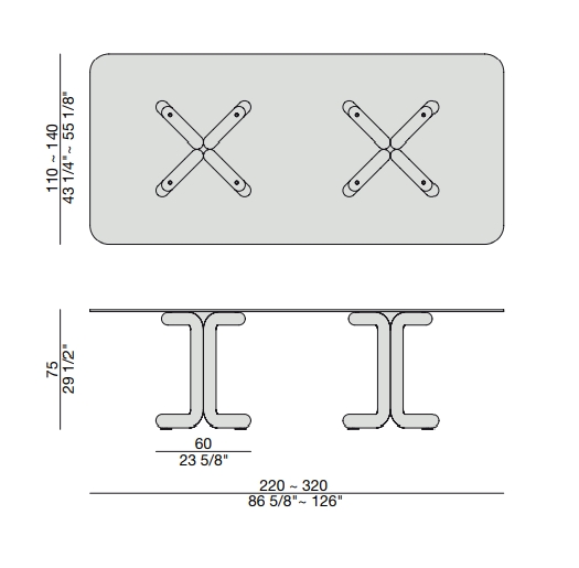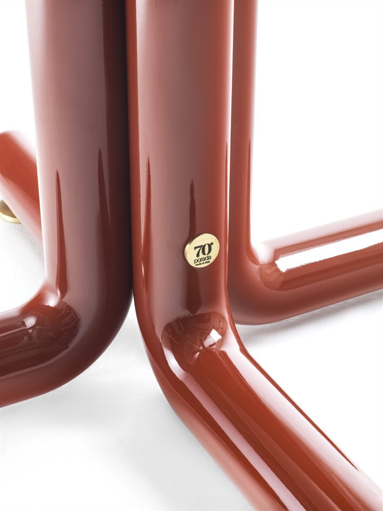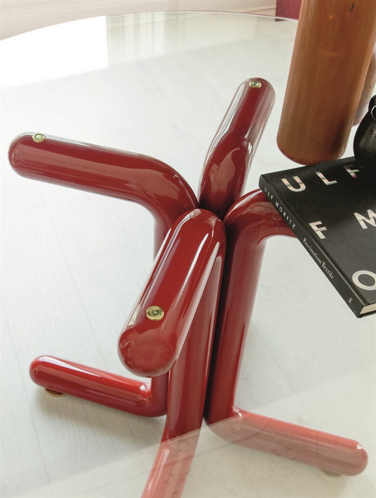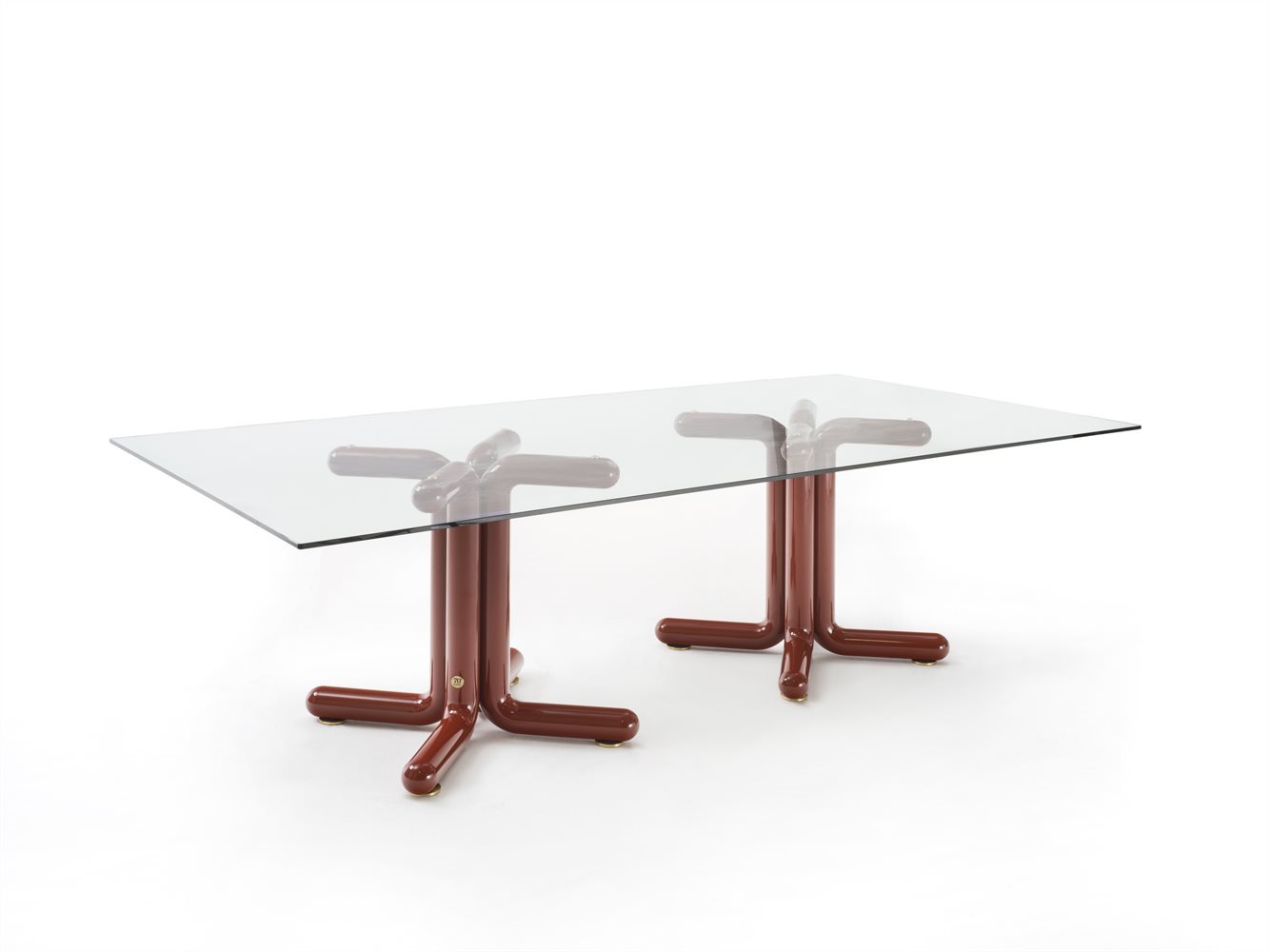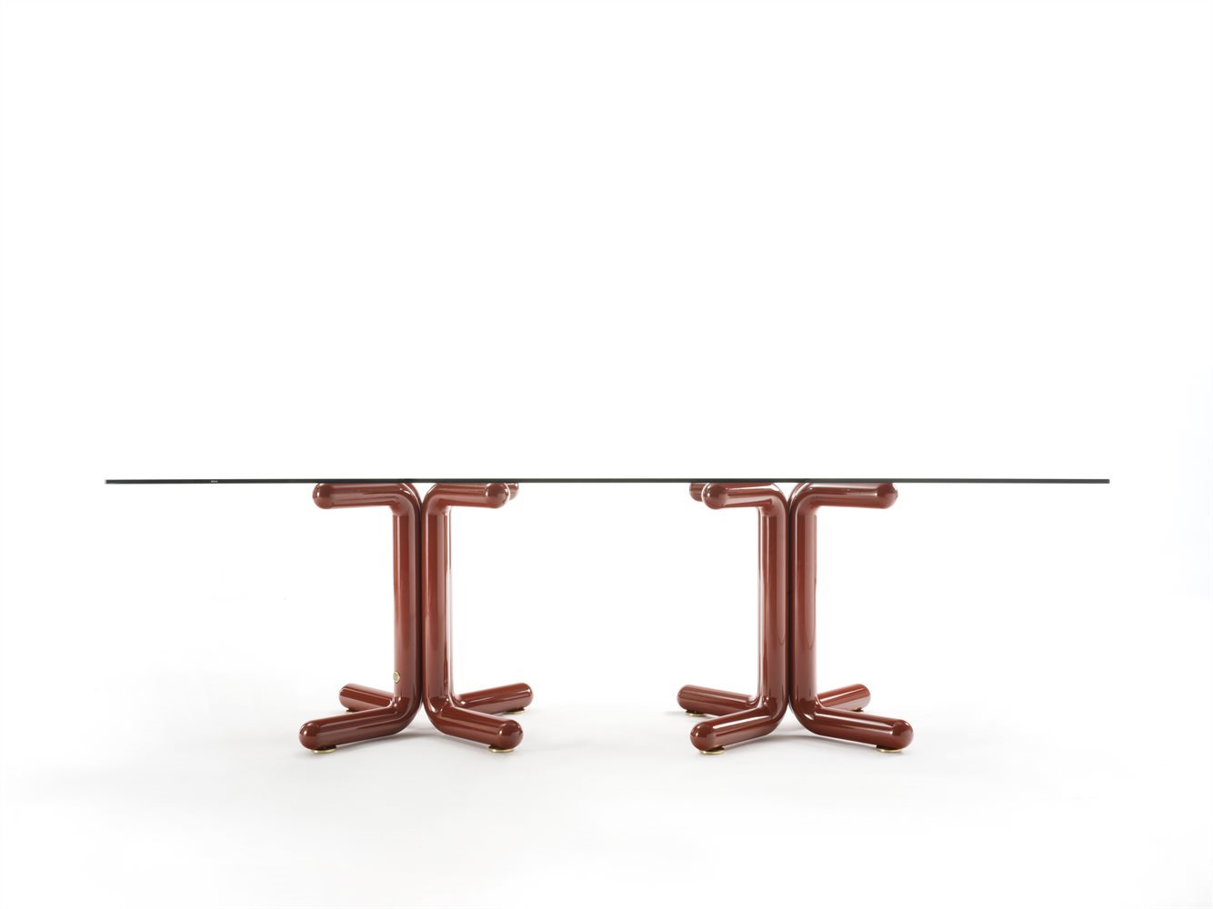 餐桌底部有实心灰或卡纳莱塔核桃或明亮的漆和圆形顶部的钢化透明玻璃。刷黄铜脚。