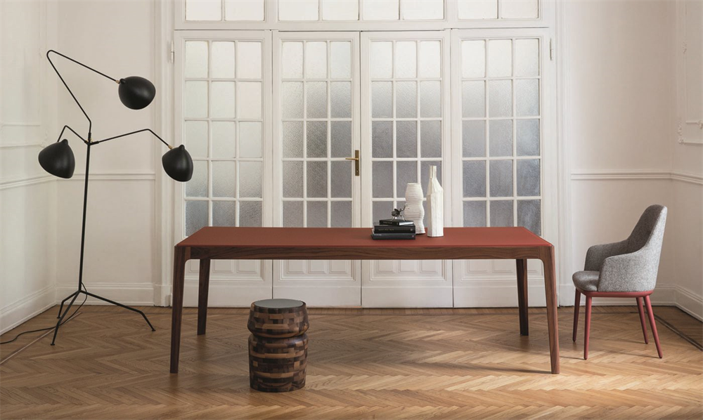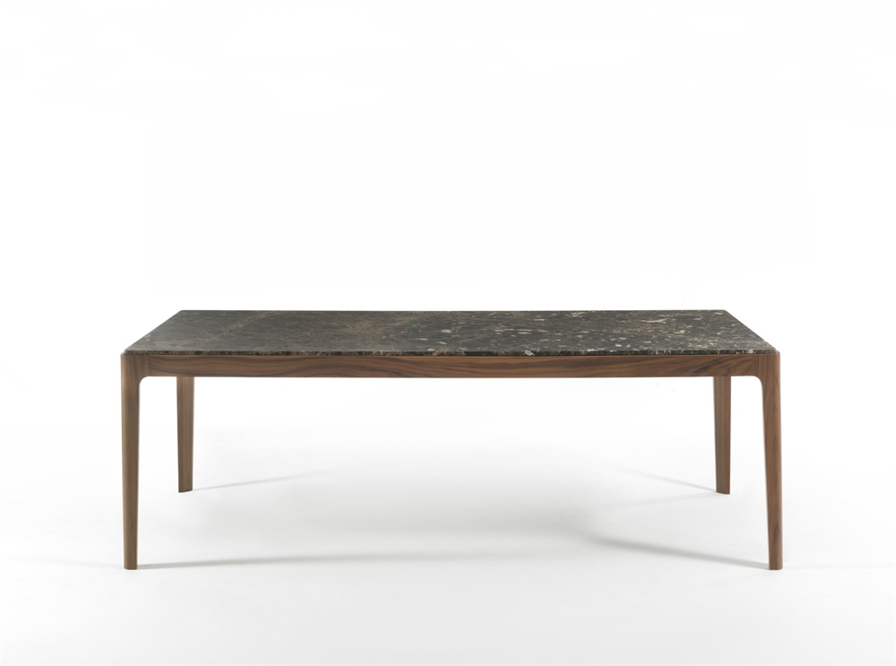 长方形餐桌,结构坚固的 Canaletta 核桃,顶部大理石或背漆蚀刻玻璃。