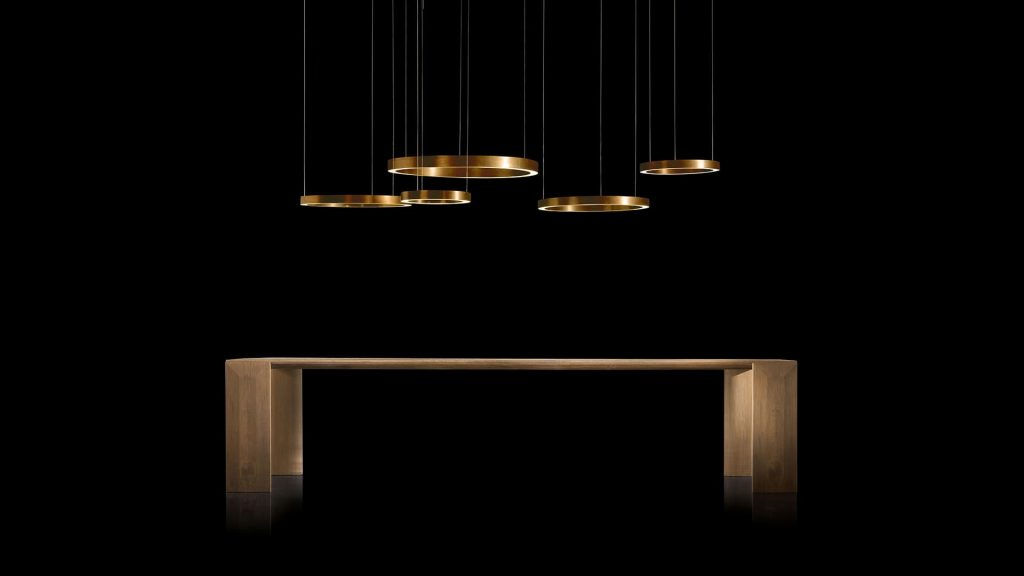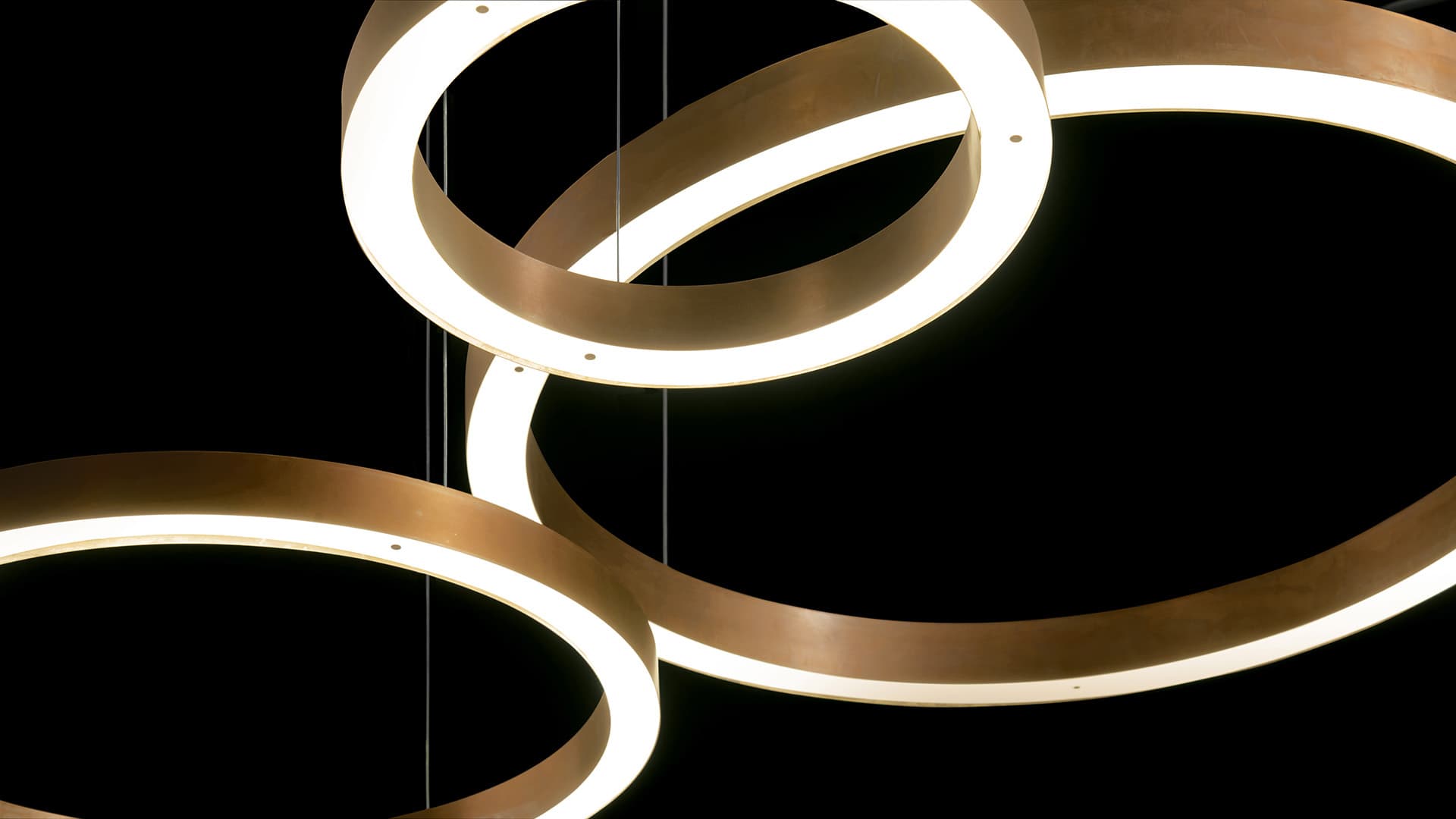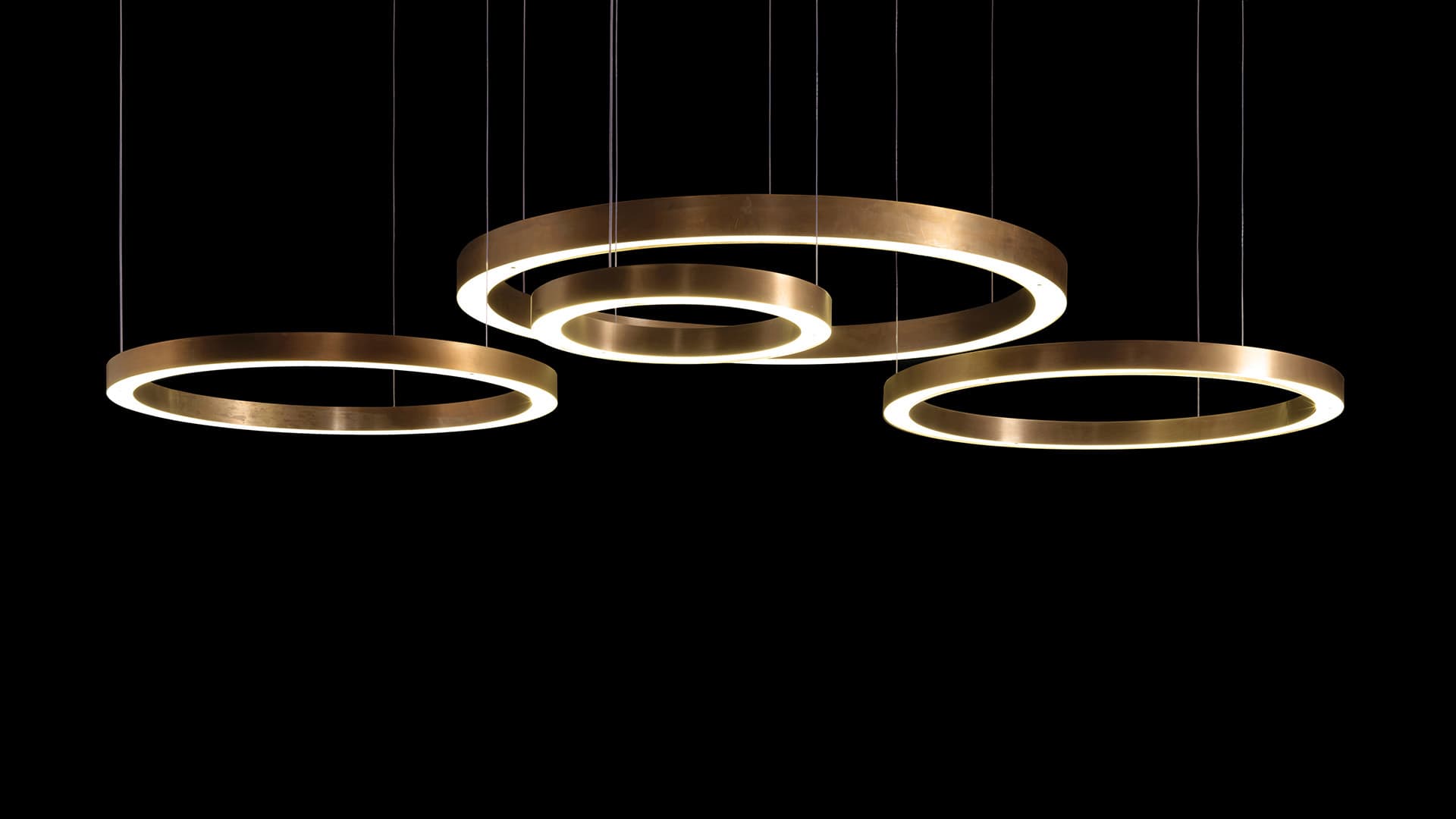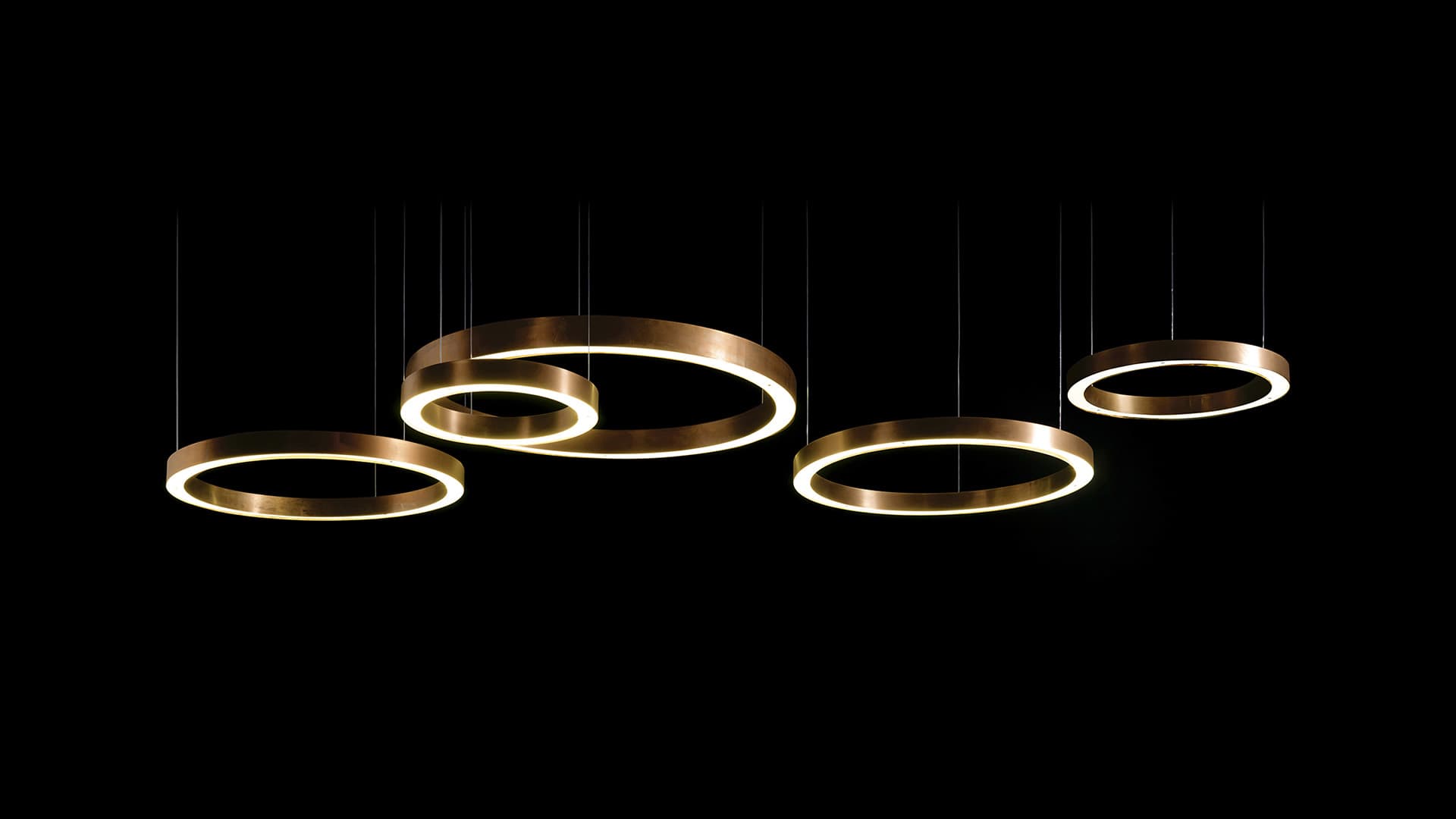 可调光的暖光节能led灯,由不同尺寸和照明类型的圆环组成;变压器采用莲座式吊顶,低压电源通过吊索向吊环供电。可提供带远程变压器的灯的替代固定系统。可提供额外的暖光2700K(无需额外成本)。仅供室内使用。标准整体高度180厘米。