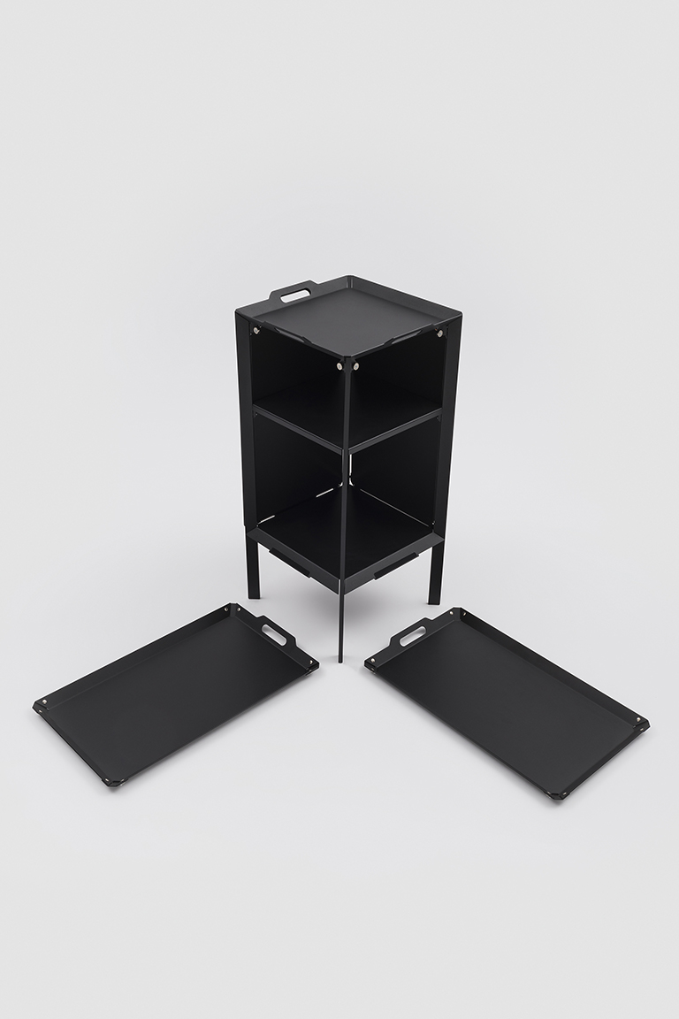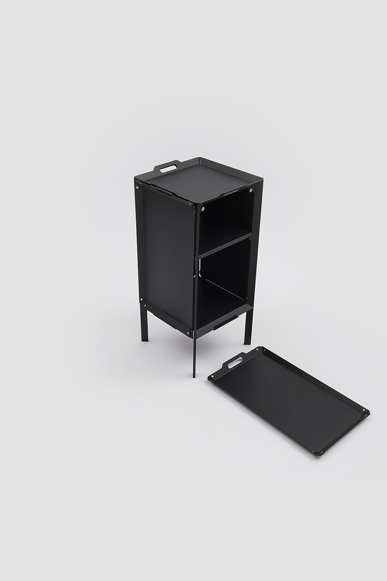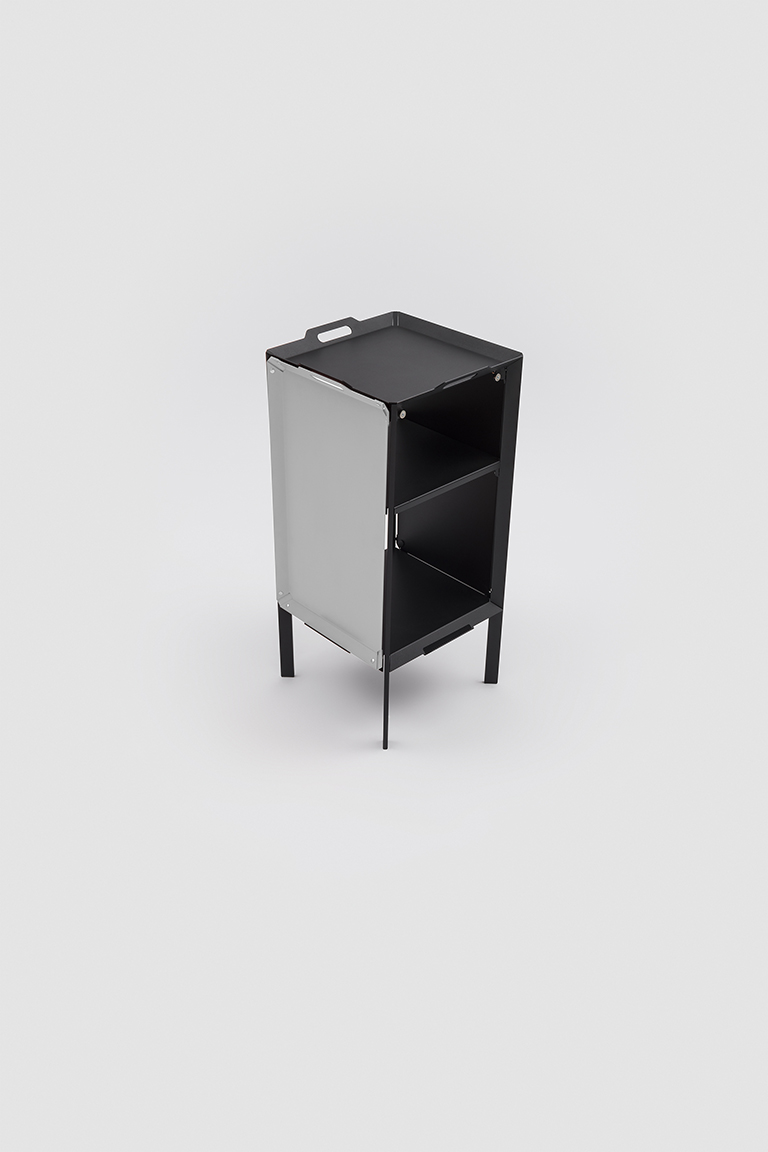 双重生活是一个小型的、可转换的储物柜,可追溯至18世纪的咖啡桌。这是一个简单的结构,有三个架子和一个背面。三个开放面使用铝托盘封闭,铝托盘固定在带磁性扣的结构上,从而能够快速轻松地将其移除和重新定位。