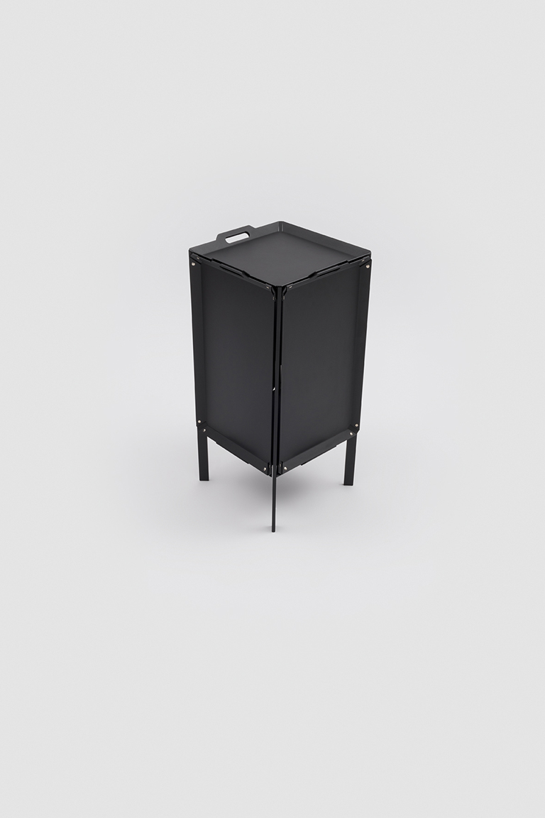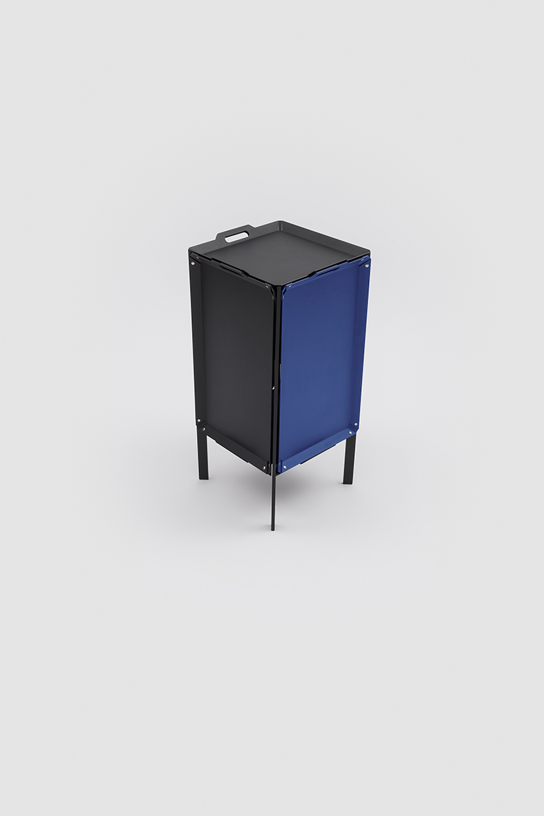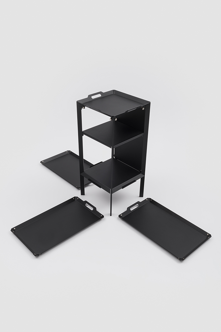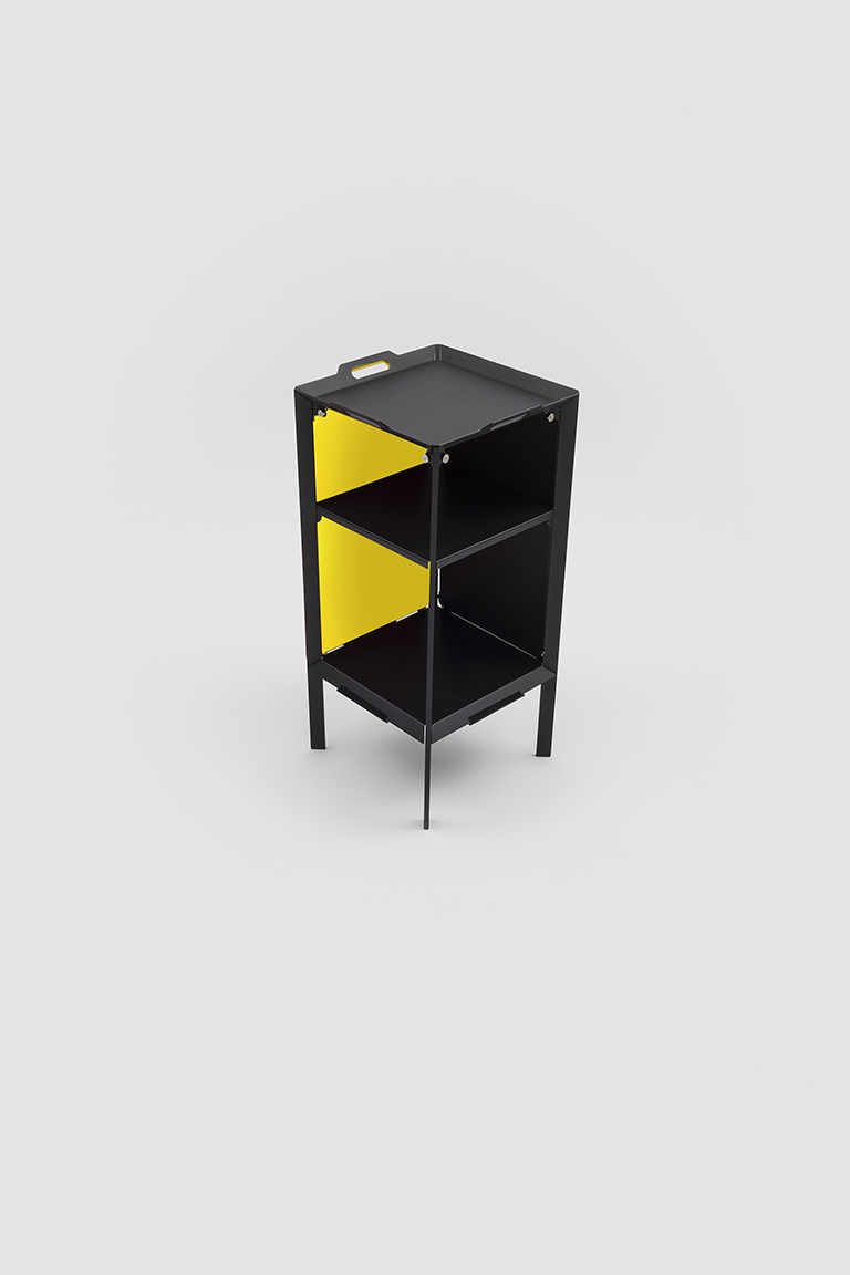 双重生活是一个小型的、可转换的储物柜,可追溯至18世纪的咖啡桌。这是一个简单的结构,有三个架子和一个背面。三个开放面使用铝托盘封闭,铝托盘固定在带磁性扣的结构上,从而能够快速轻松地将其移除和重新定位。