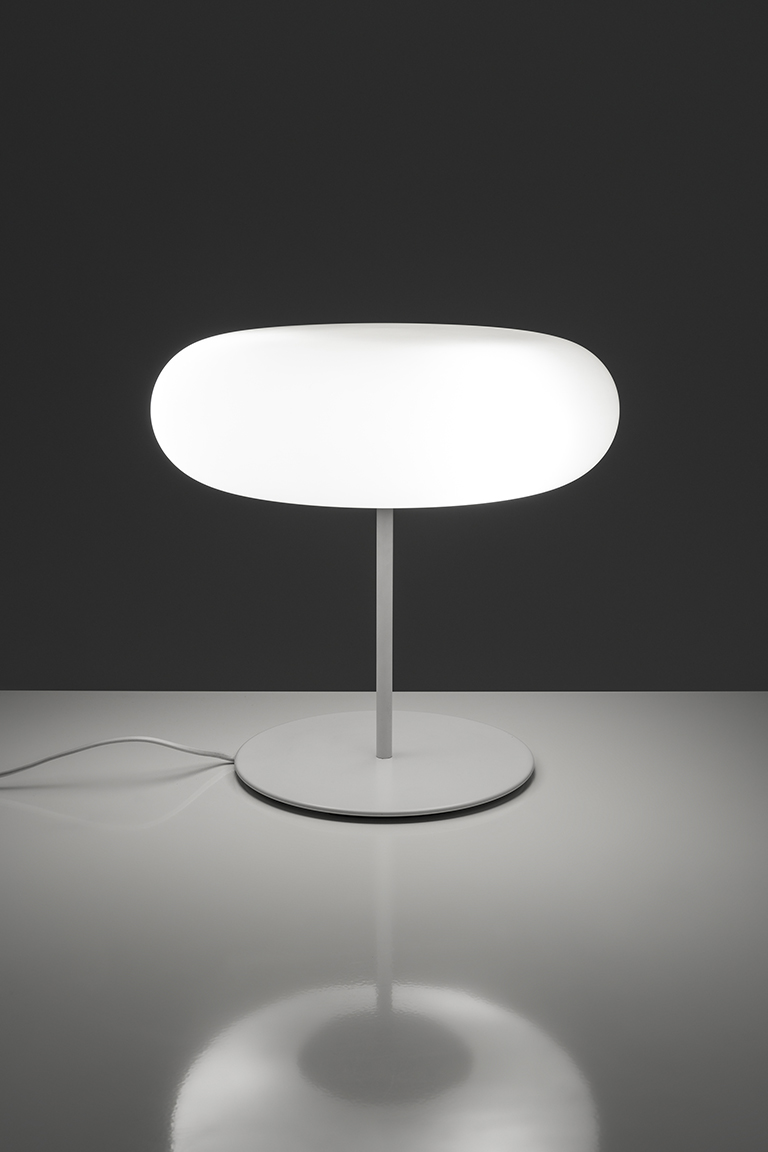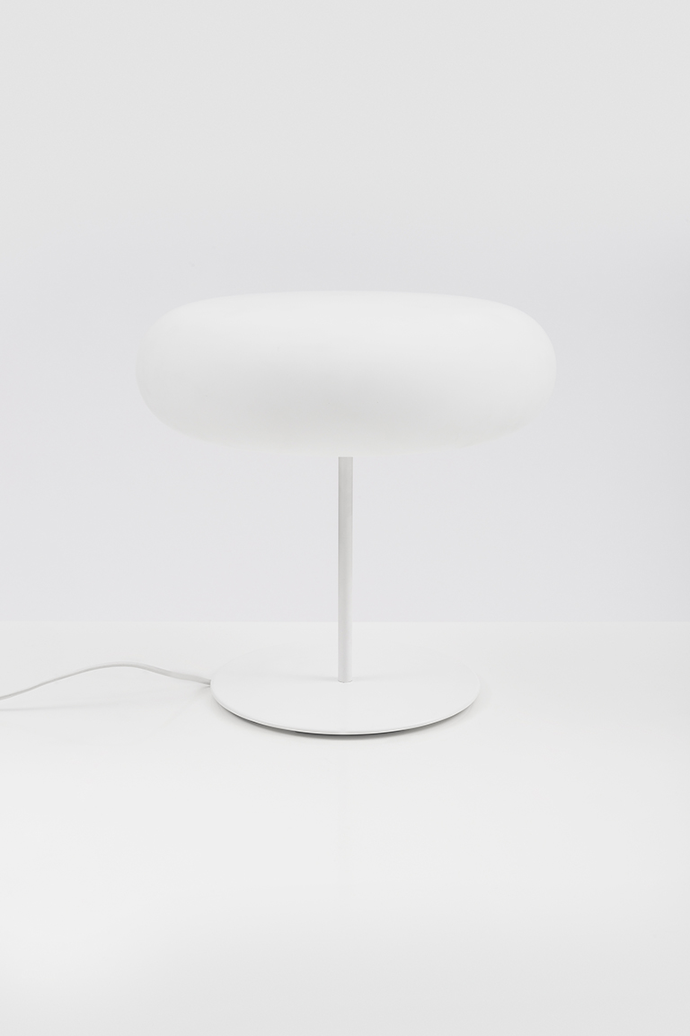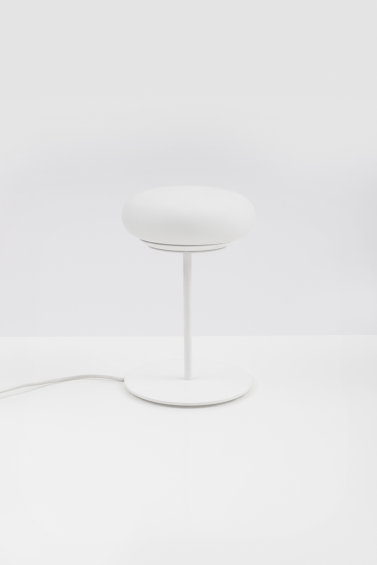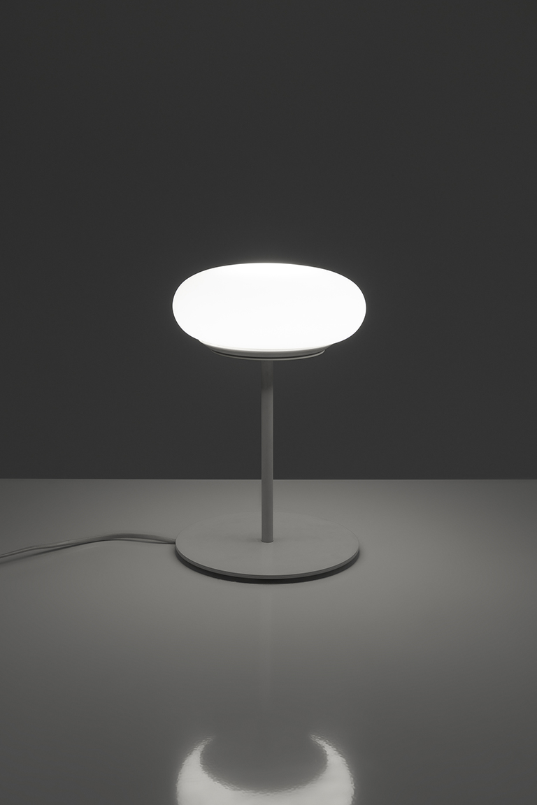 Itka 台茎是一盏台灯,带有一个薄金属茎,支撑着手吹蛋白石磨砂玻璃的扩散器,均匀地分配来自灯的光线。