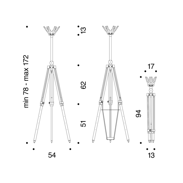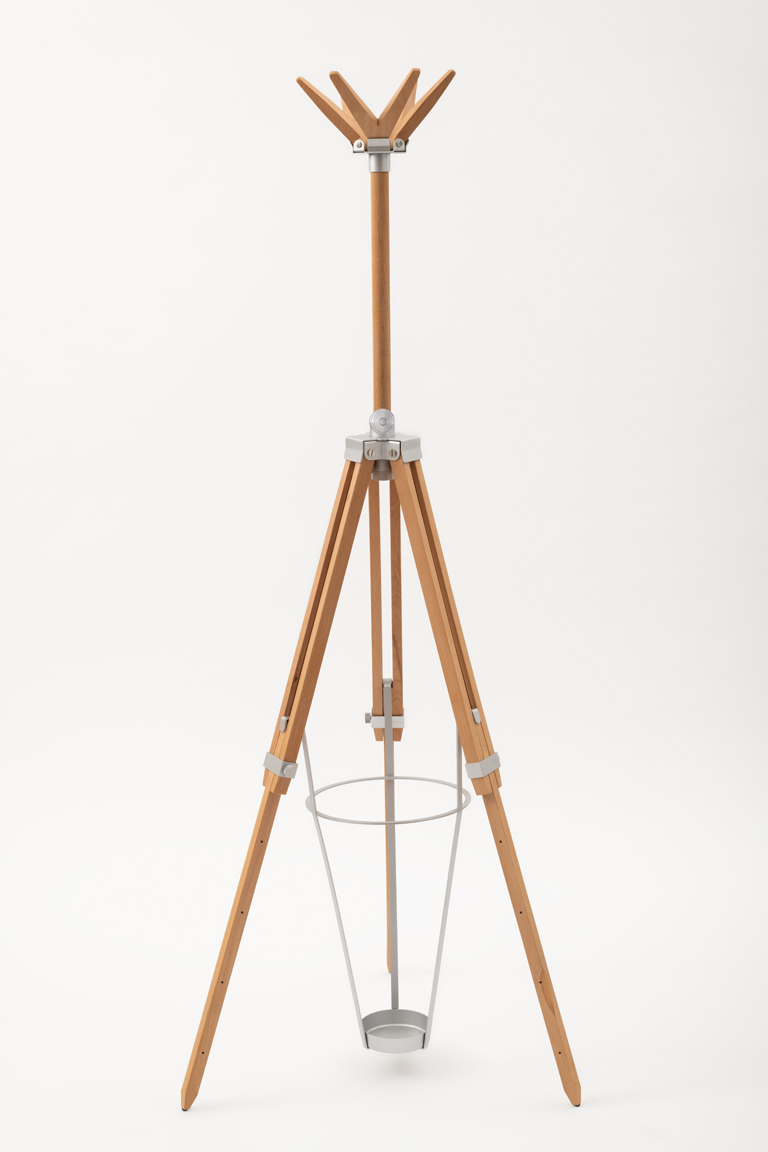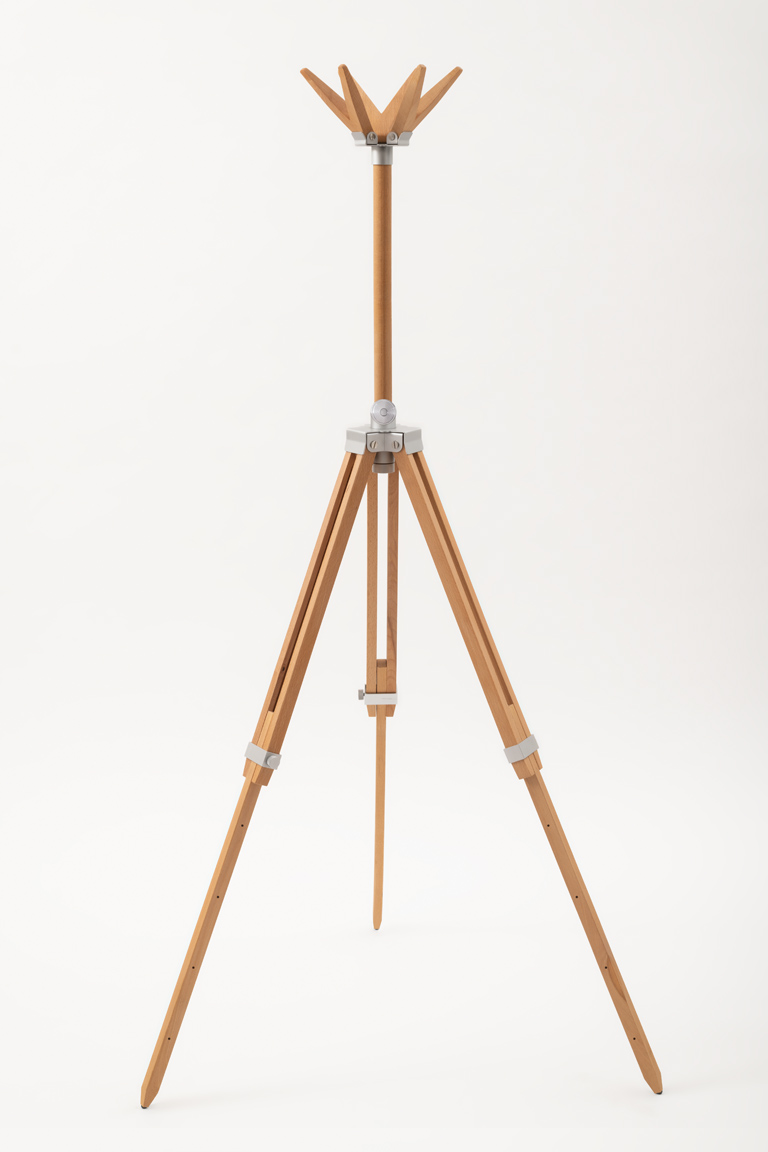 灵感来自艺术家三脚架的木结构支撑着一个顶部,可以是矩形的或圆形的,或者外衣架的主体有六个钩子和一个伞架。提供实用性和使用自由性的五种不同高度:笔记本电脑休息、底座或服务台。