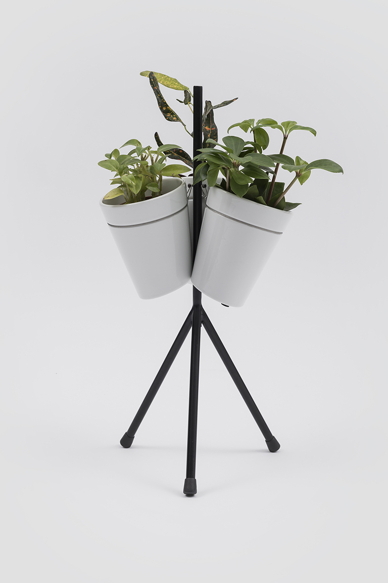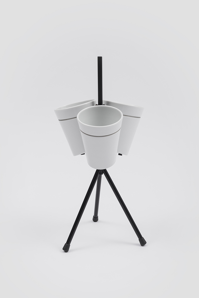 窗花园餐桌是 BIG 为水培栽培而设计的花瓶系列的一部分。三个高压铸造的白瓷花瓶安装在薄金属三脚架底座上。以自己的创新方式,该作品代表了当代城市生活方式,室内装饰带有绿色口音。