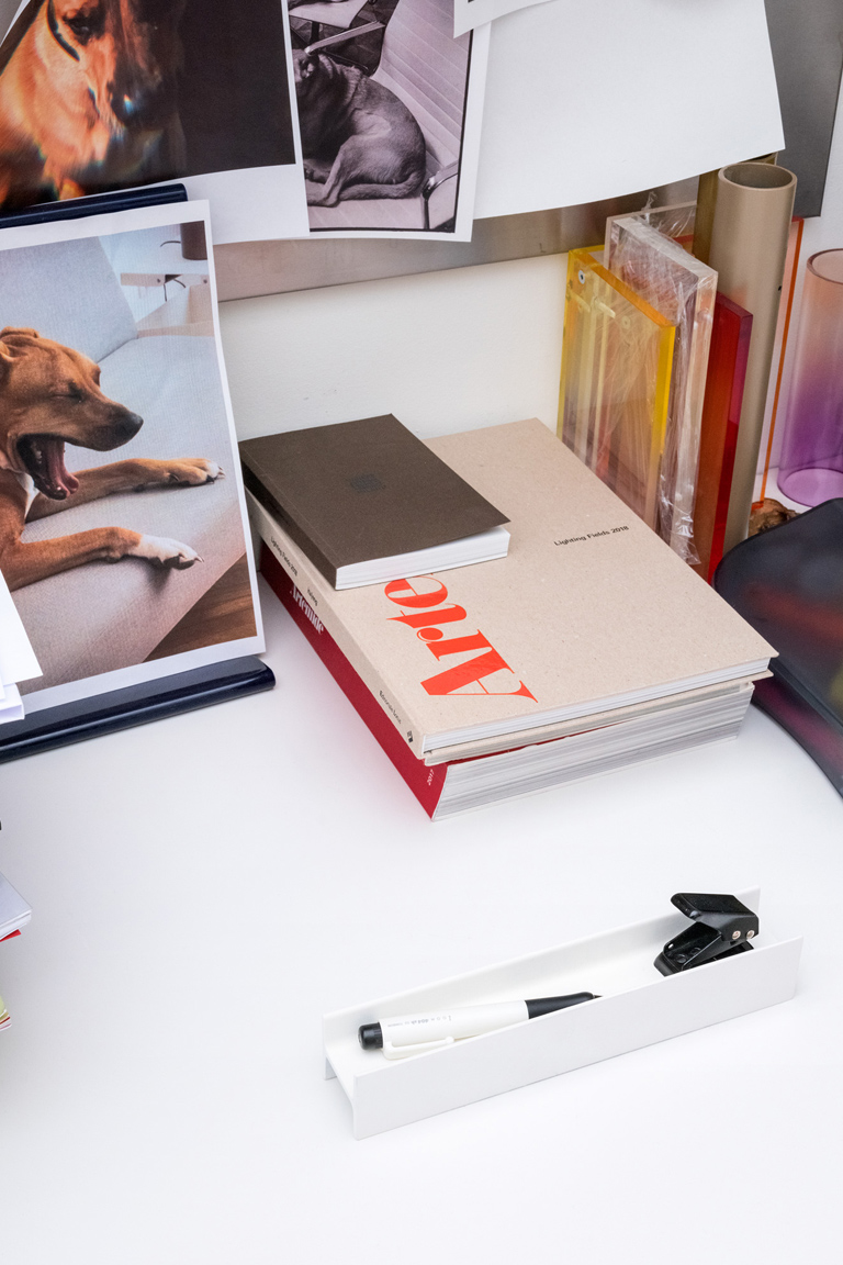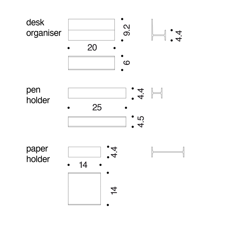 该集由三个元素组成:铅笔架、对象支架和信封支架。他们的部分设计,从Ipe型光束,允许这些元素在办公桌表面承担不同的位置,成为照片持有人,电话架或支持表面的小物体,必要时。