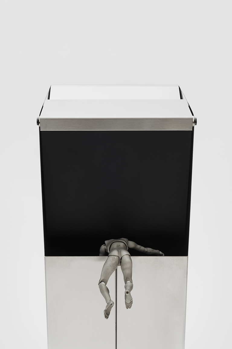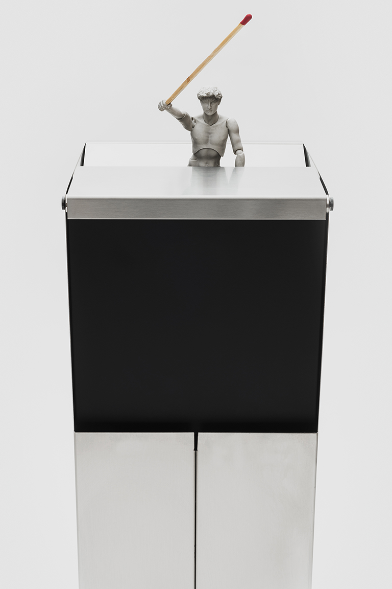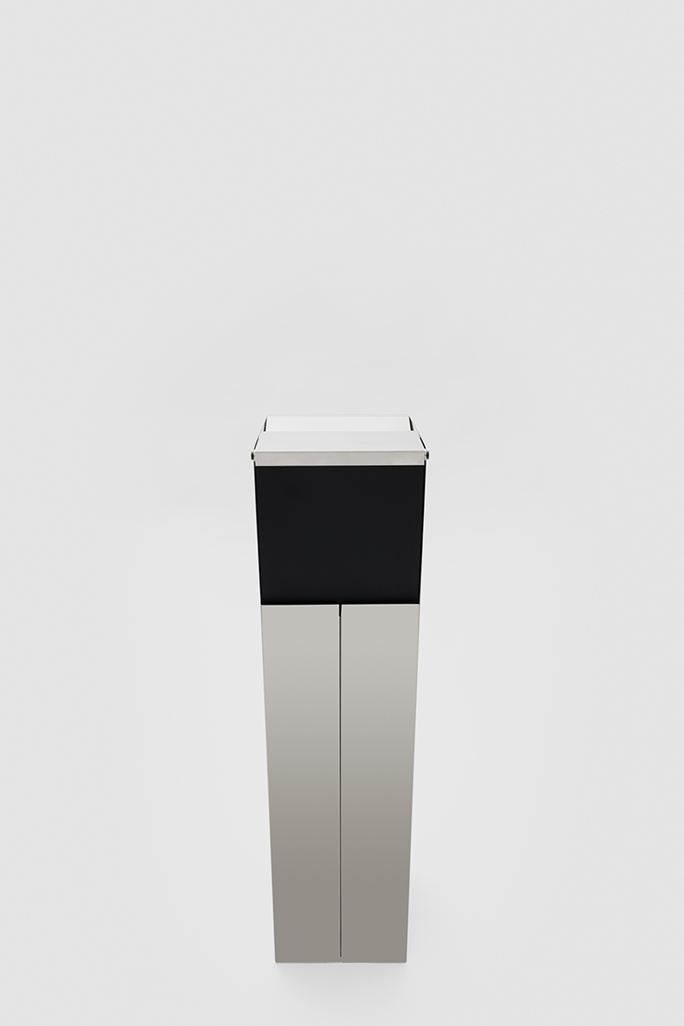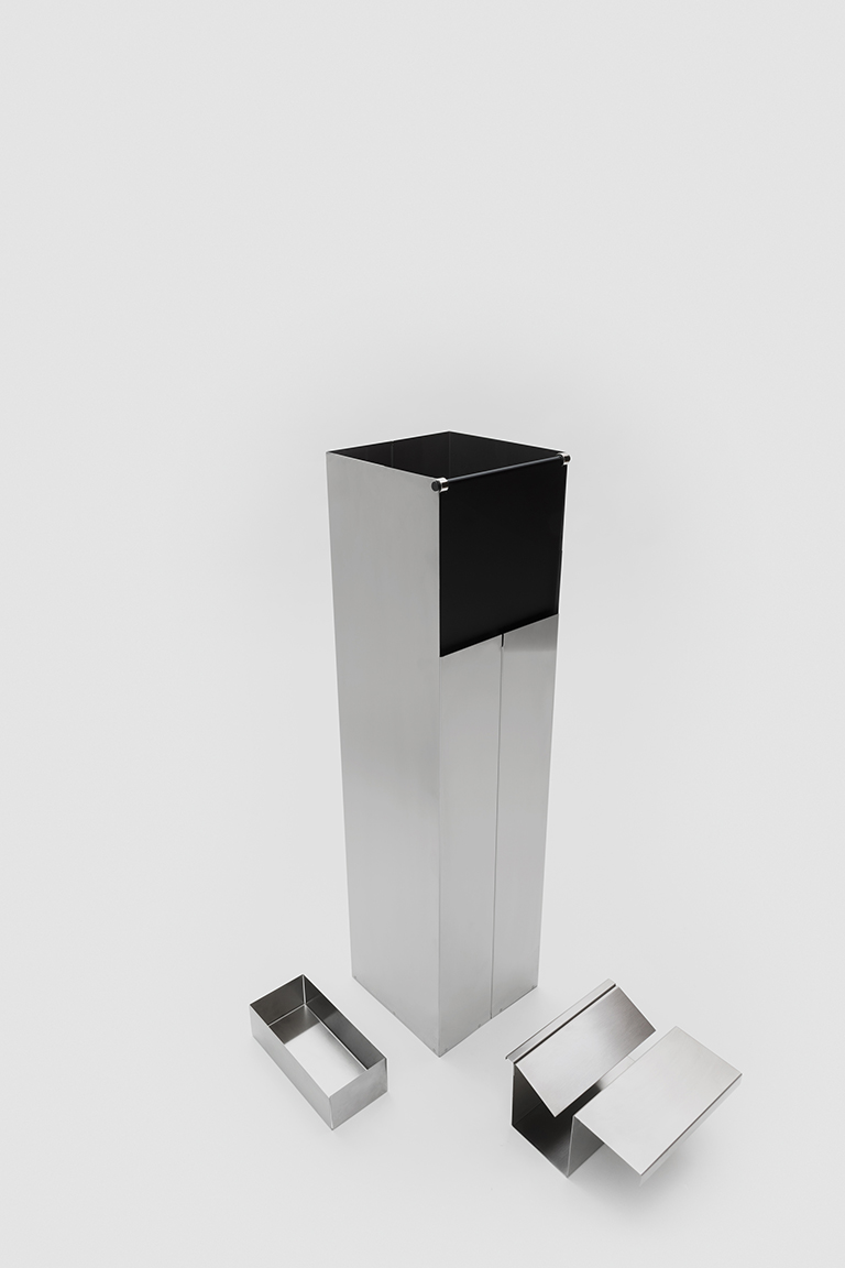 Levanzo 是一个站立的地板烟灰缸,内置在垃圾箱中,内置缎面成品不锈钢和气化铝。