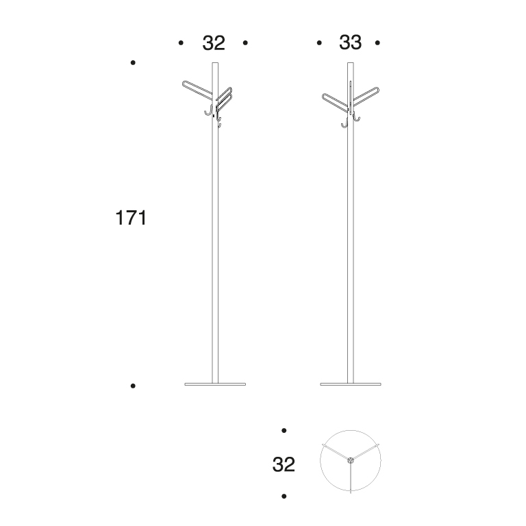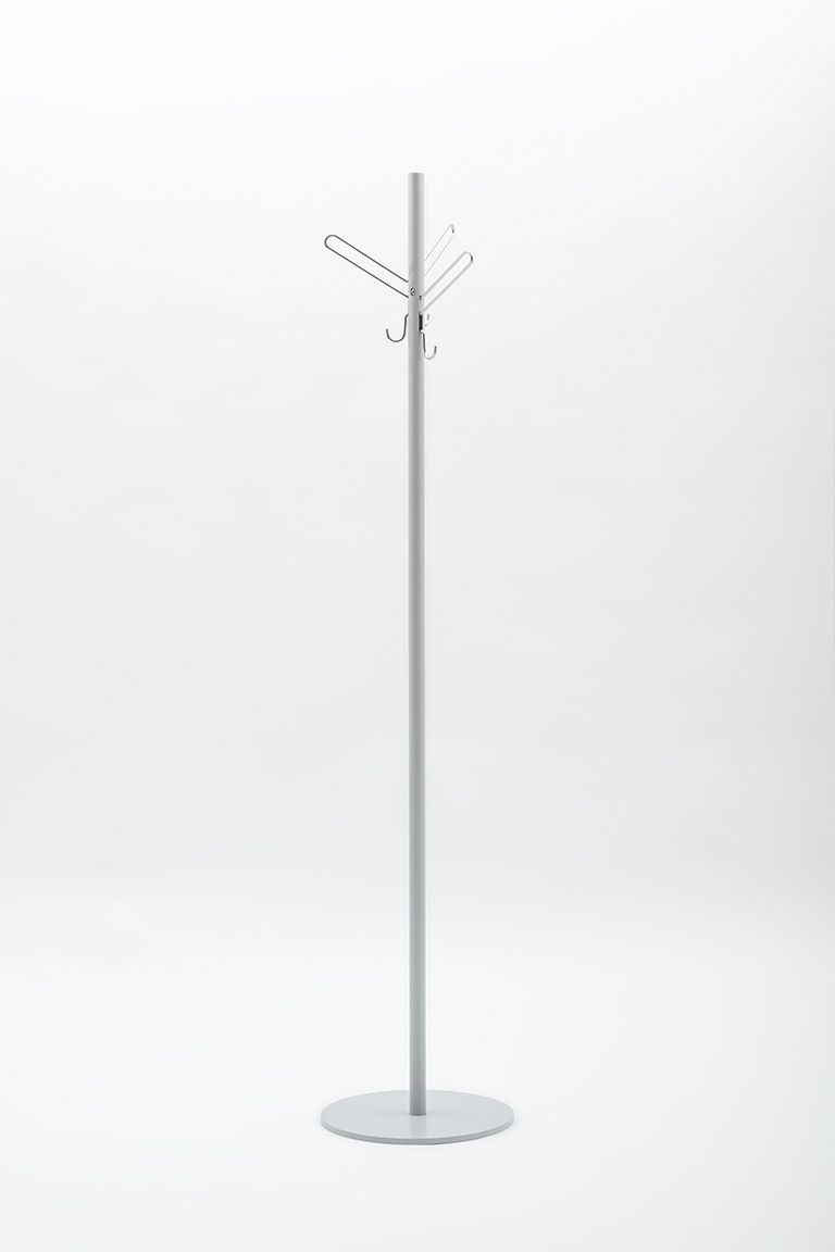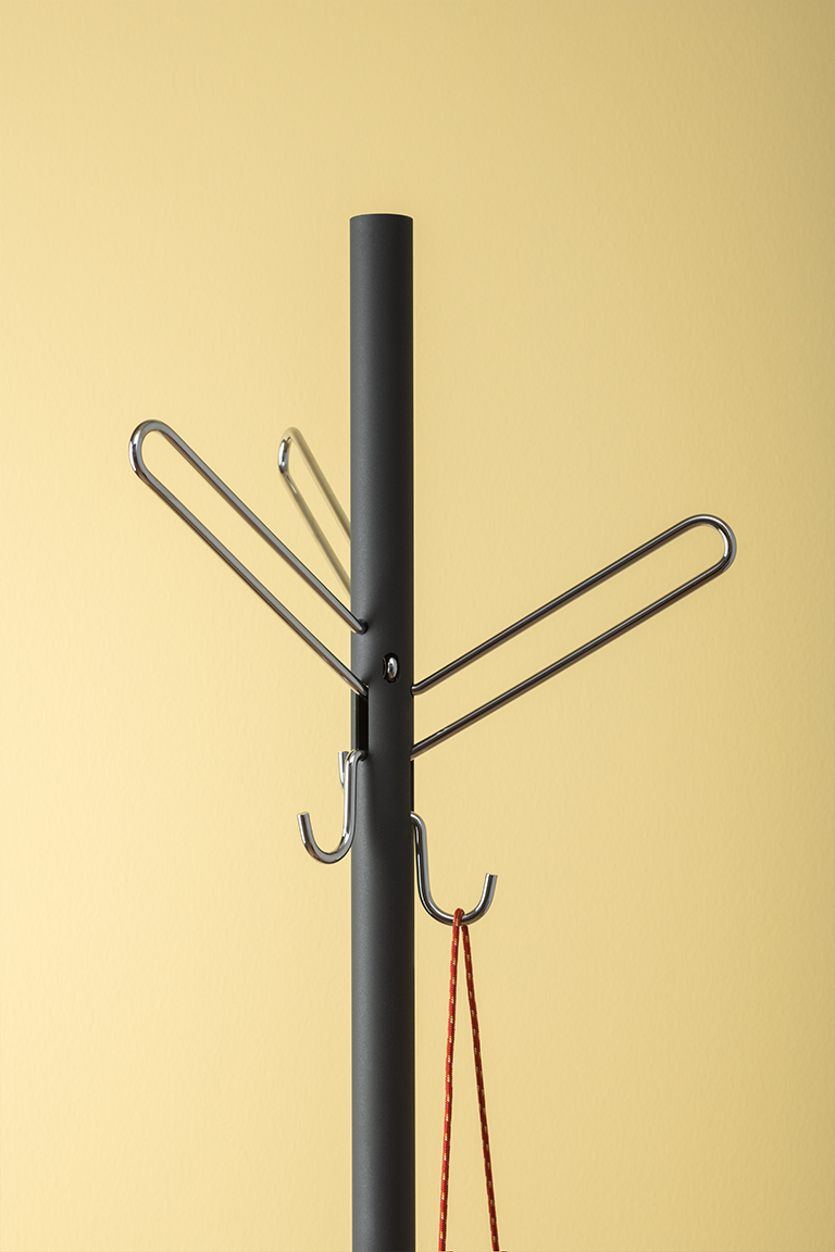 形状的钢丝画出两个钩子,并扣在杆或墙支撑上,以创建衣架系统。地板版本有三个支持在不同的高度,而墙壁版本有3或5个元素与相同的双钩几何形状,但在较小的规模。这两个版本都提供无烟煤灰色或银色,再次与铬钢丝钩。
