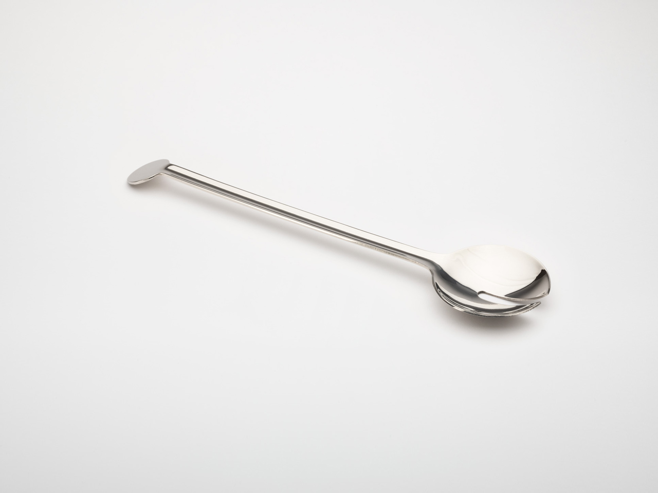 用抛光不锈钢制成的沙拉勺和叉子。它们具有相同的纯几何形状,切口改变了函数。