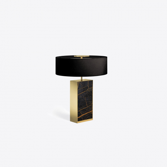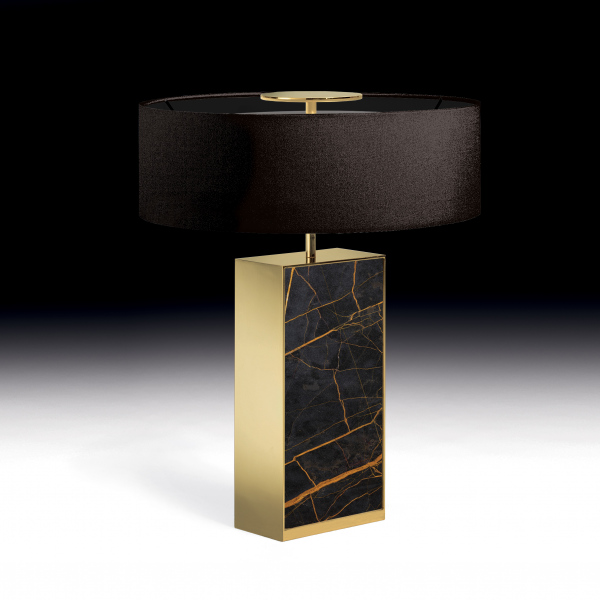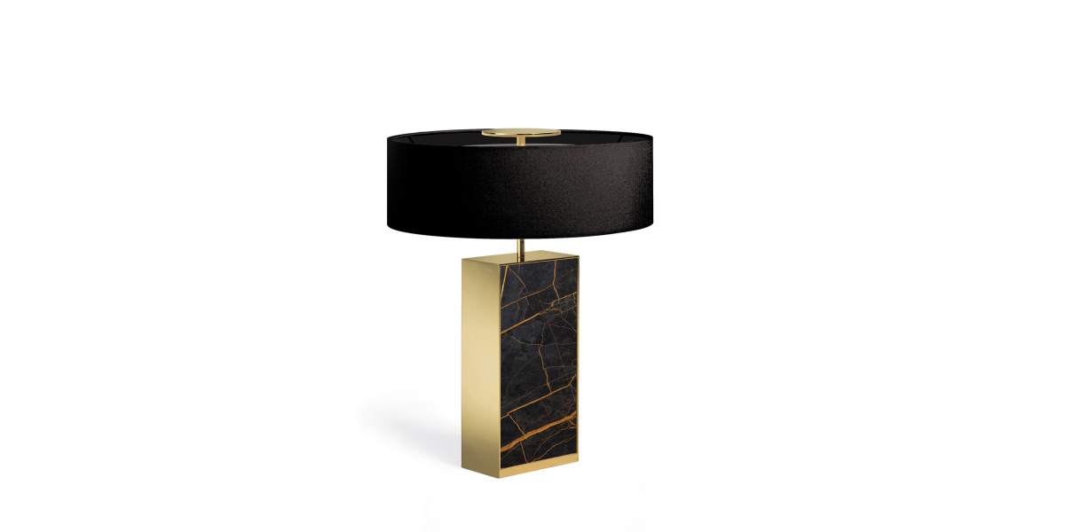 Thelma Couture,台灯,可在最多样化的环境中作为独特的家具。它的中央主体由 Port Laurent 大理石制成,而金属元素则采用哑光金色饰面。黑色硬质面料的灯罩使构图更加珍贵。