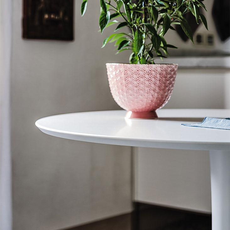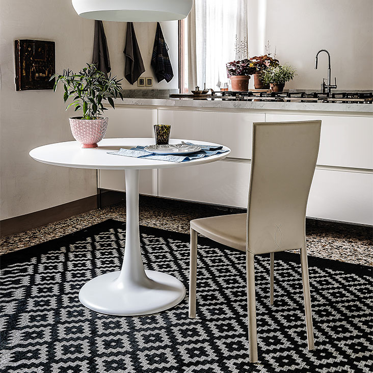 带有白色或黑色压花硬质聚氨酯底座的小酒馆桌。顶部采用 12 毫米透明钢化玻璃、白色 (OP7) 或黑色 (OP17) 涂漆 MDF。