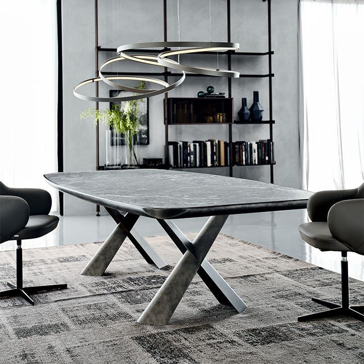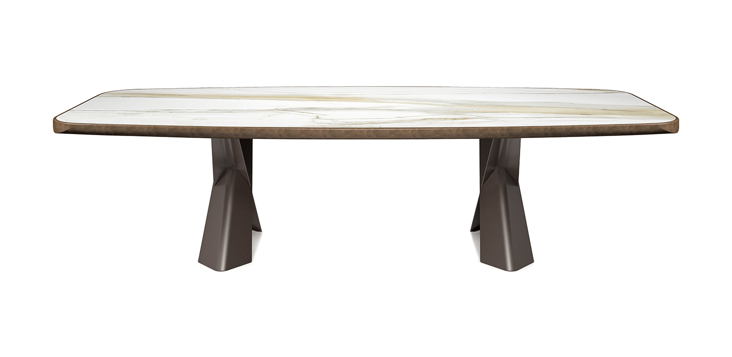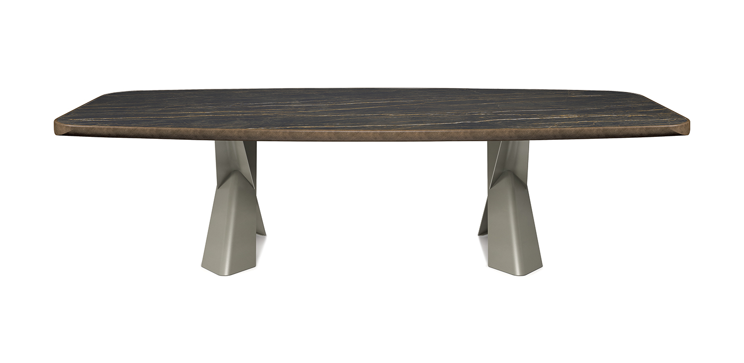 桌子采用钛 (GFM11)、青铜 (GFM18)、石墨 (GFM69) 或黑色 (GFM73) 压纹漆钢、拉丝青铜或拉丝灰色底座。陶瓷上衣 Marmi Alabastro (KM02)、Supreme (KM03)、Ardesia (KM04)、哑光 Golden Calacatta (KM05)、亮面 Golden Calacatta (KM06)、哑光 Portoro (KM07)、亮面 Portoro (KM08)、亮面 Sahara Noir (KM09) )、Emperador (KM10)、Makalu (KM11)、Breccia (KM12) 或 Arenal (KM13) 与拉丝青铜或拉丝灰色漆面和圆形下部轮廓。300x128 版本的顶部厚度为 6 厘米,240x120 版本的顶部厚度为 5 厘米。