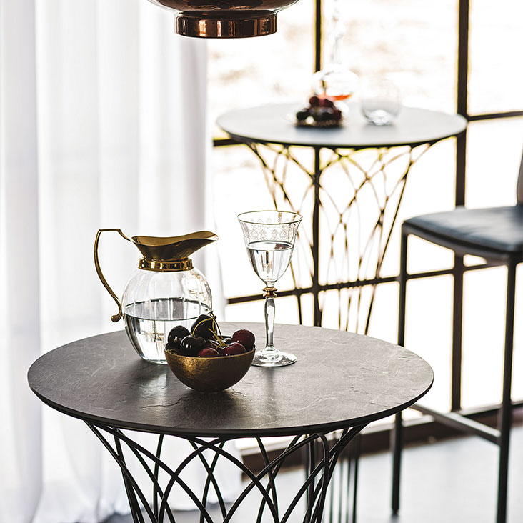 在爱妮岛KERAMIK Bistrot餐厅表,由Brogliato特拉韦尔索工作室设计的,是自然的灵感和优秀的生产技术的完美结合。由涂漆钢底座创造的图案具有轻盈和谐的设计,增强了这款精致吧台Marmi陶瓷台面的众多精致细微差别。最初被设想为用于合同室内设计项目的咖啡桌,它们有两种高度可供选择。根据不同的造型需求,它们可以与椅子相结合,也可以为优雅的小酒馆提供带凳子的高桌。