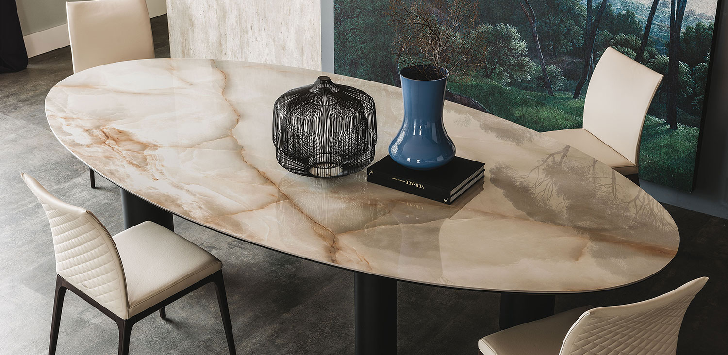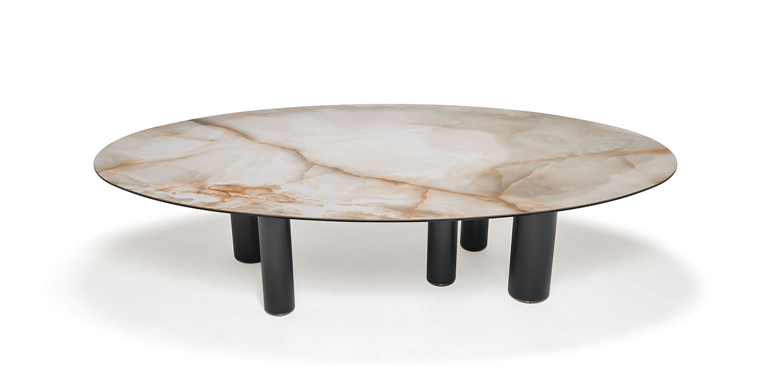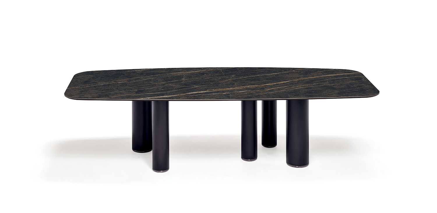 钛 (GFM11) 或黑色 (GFM73) 压纹漆钢桌腿和黑色铬钢 (06) 细节。顶级陶瓷 Marmi in Alabastro (KM02)、Supreme (KM03)、Ardesia (KM04)、哑光 Golden Calacatta (KM05)、亮面 Golden Calacatta (KM06)、哑光 Portoro (KM07)、亮面 Portoro (KM08)、亮面 Sahara Noir ( KM09)、Emperador (KM10)、Makalu (KM11)、Breccia (KM12) 或 Arenal (KM13)。1大2小腿3款,2大2小腿4款。可选的附加小腿。