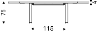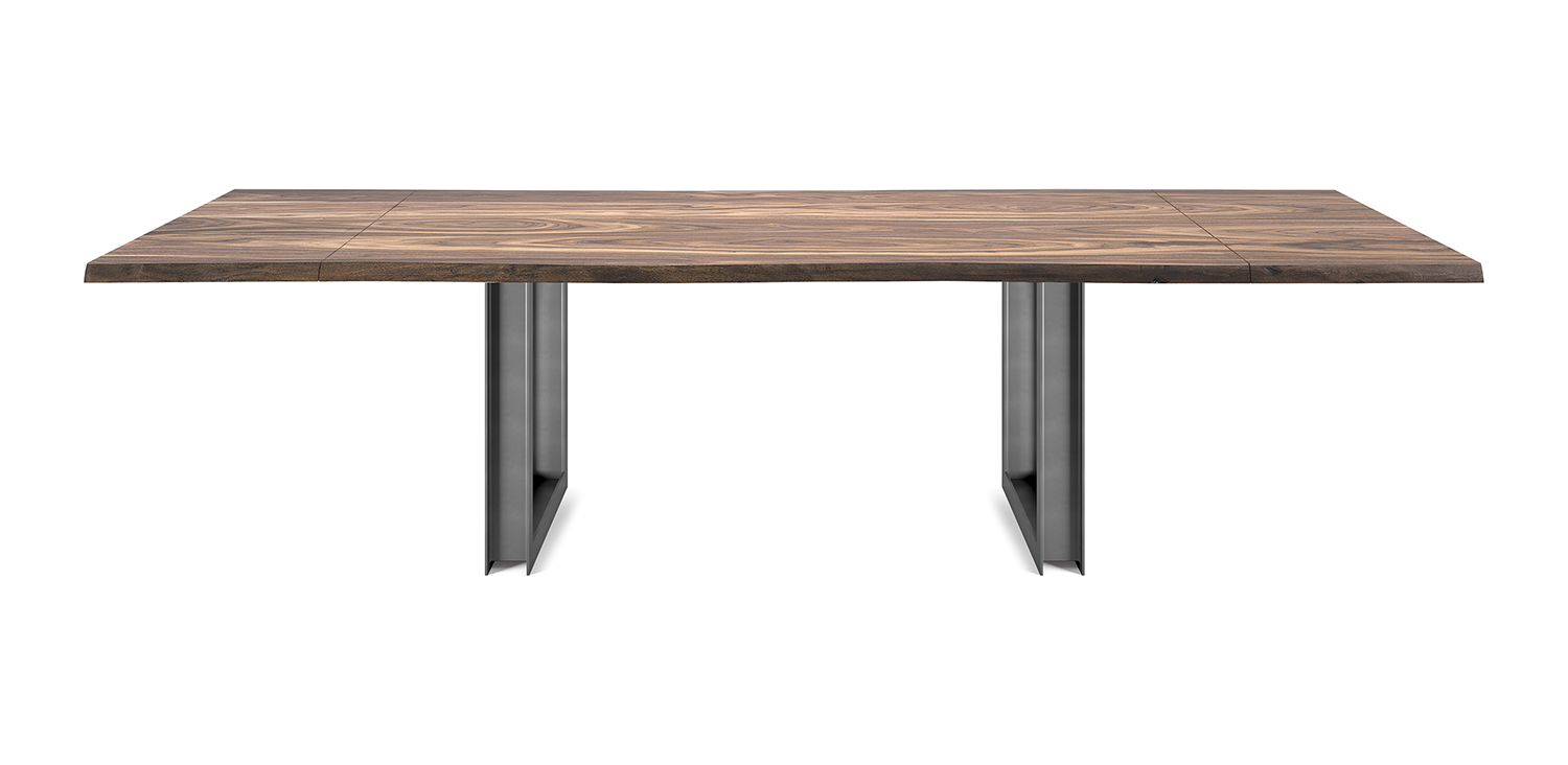 带透明漆金属 (OP0) 底座的可伸缩桌子。卡纳莱托胡桃木 (NC)、烧橡木 (RB) 或天然橡木 (RN) 的顶部和延伸部分,边缘不规则。