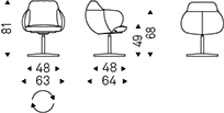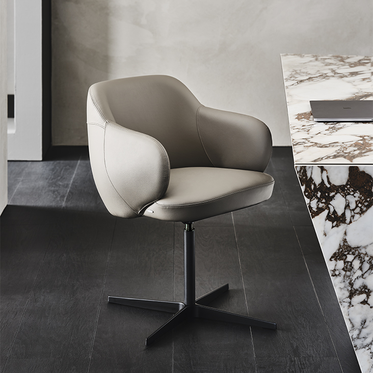 带有 4 个辐条底座的转椅,材质为钛 (GFM11)、青铜 (GFM18)、石墨 (GFM69) 或黑色 (GFM73) 压纹漆钢。座椅和靠背采用织物、合成正绒面革、合成皮革或软皮革制成,如样品卡所示。盖子不可拆卸。