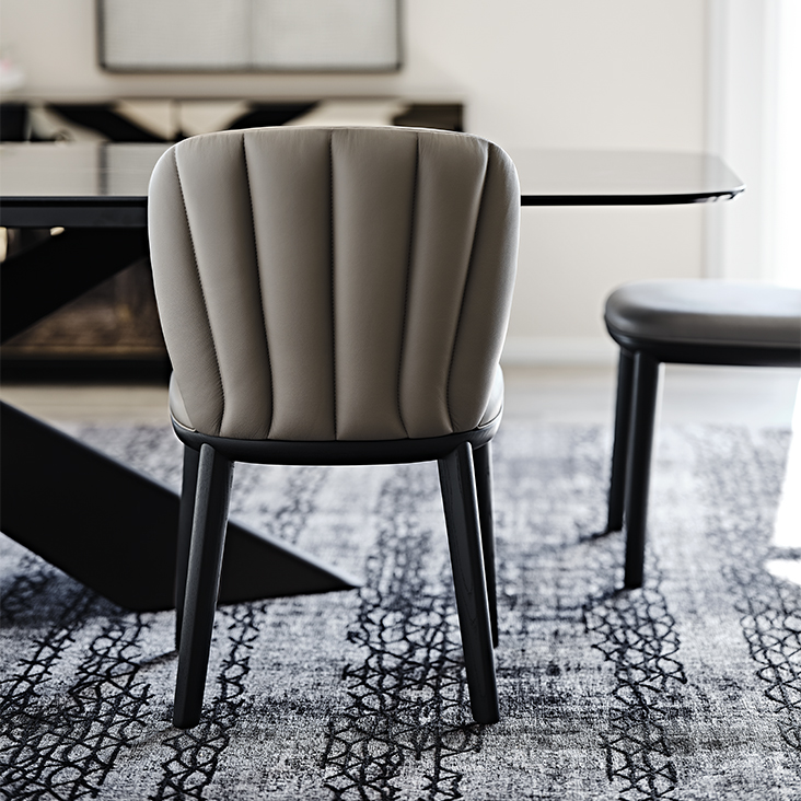 椅子采用天然白蜡木 (frN)、卡纳莱托胡桃木染色白蜡木 (frNC)、烧橡木染色白蜡木 (frRB) 或开孔亚光黑 (fr73) 白蜡木。根据样品卡覆盖织物、合成正绒面革、微型正绒面革、合成革或软皮革。绗缝座椅靠背套。盖子不可拆卸。