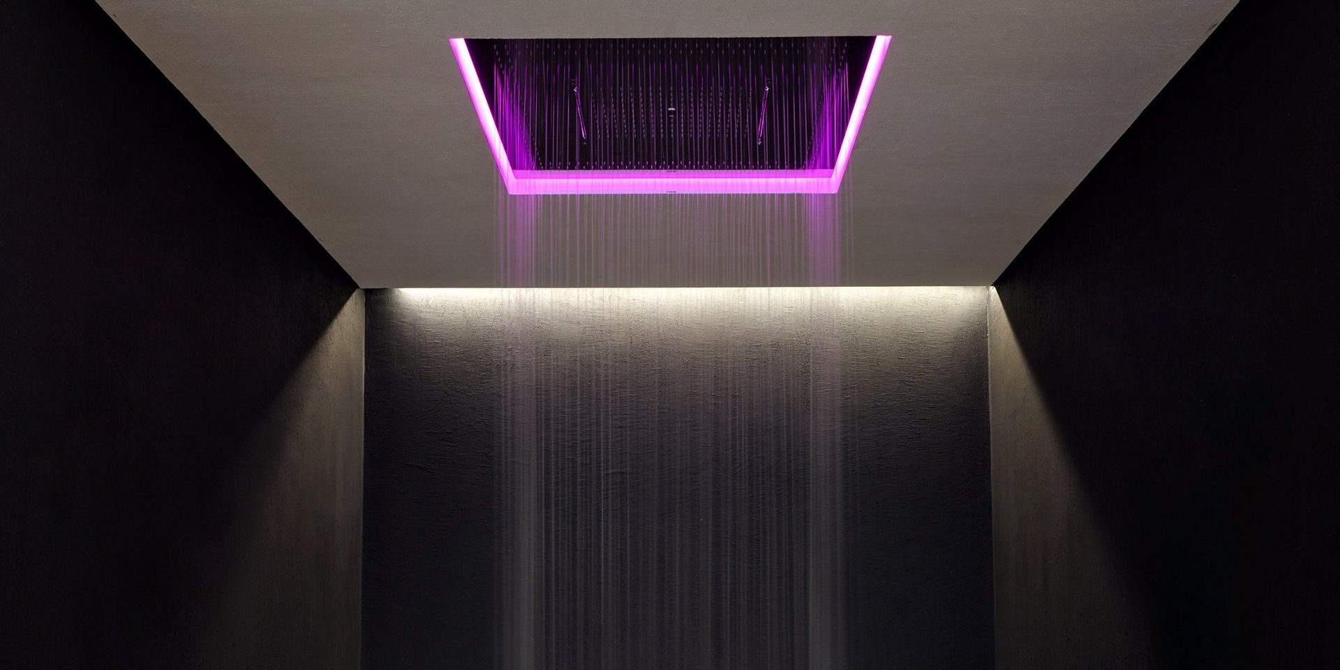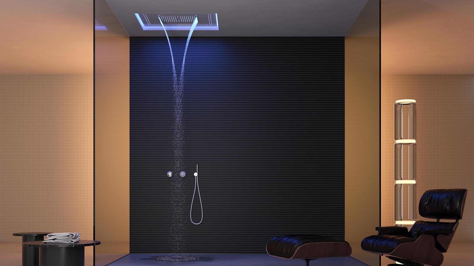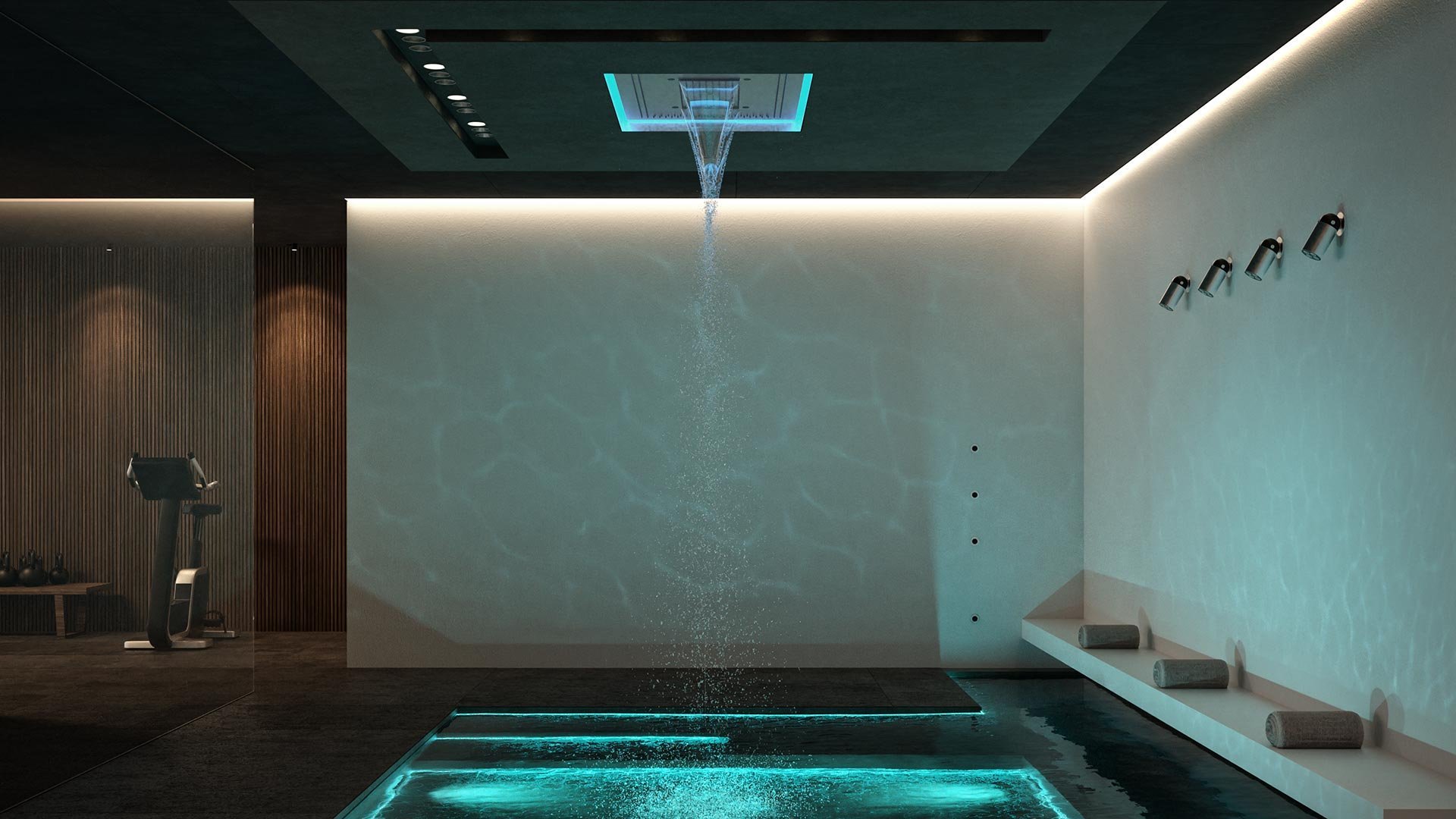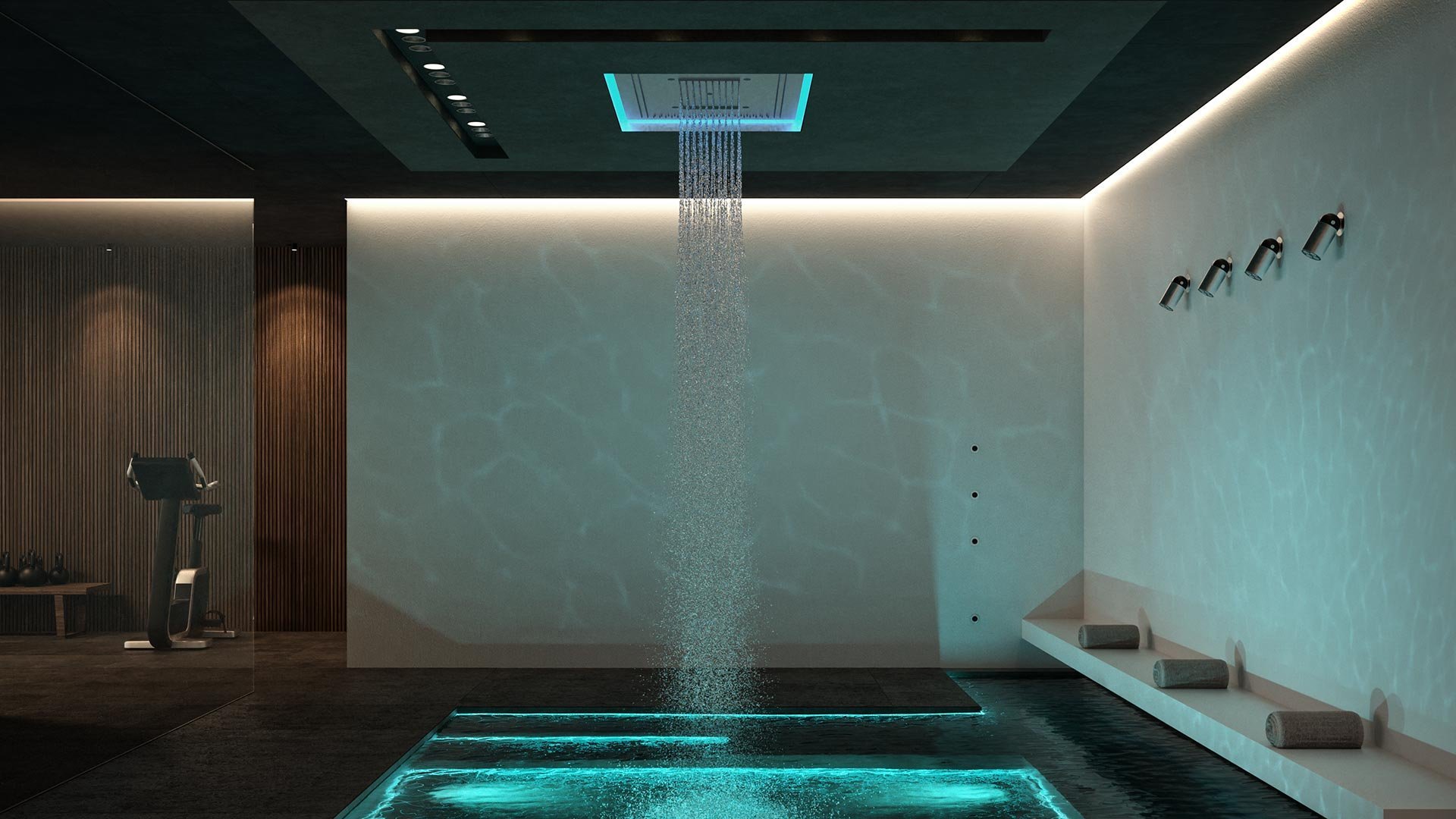 体贴的尺寸使 Meteo XXL 能够容纳传统模块:两个瀑布、4 个雾化器和一个由双排交错喷嘴制成的周边屏障。这种配置增加了系统的功能性,并通过分隔屏障促进了在没有传统淋浴间的位置的安装。这两个瀑布有一个斜射流,在中心相遇,并且在中心是一个特殊的喷嘴,可以产生非常强烈的射流。内置淋浴喷头采用不锈钢材质,镜面或白色饰面,RGB LED 集成照明(色光疗法功能),包括遥控器。光线增加了空间的体积并传达了感性。Meteo 是一个空旷的空间,水和光来自于此,可以实现极致的个性化放松。
