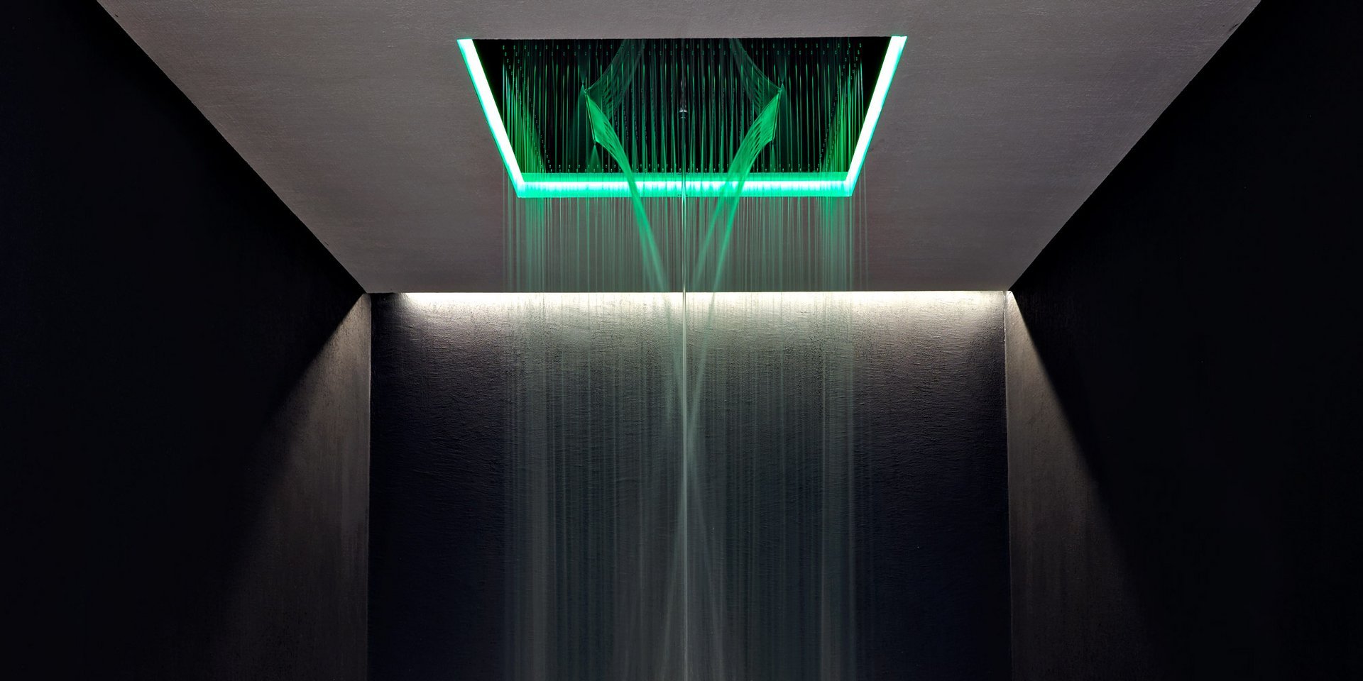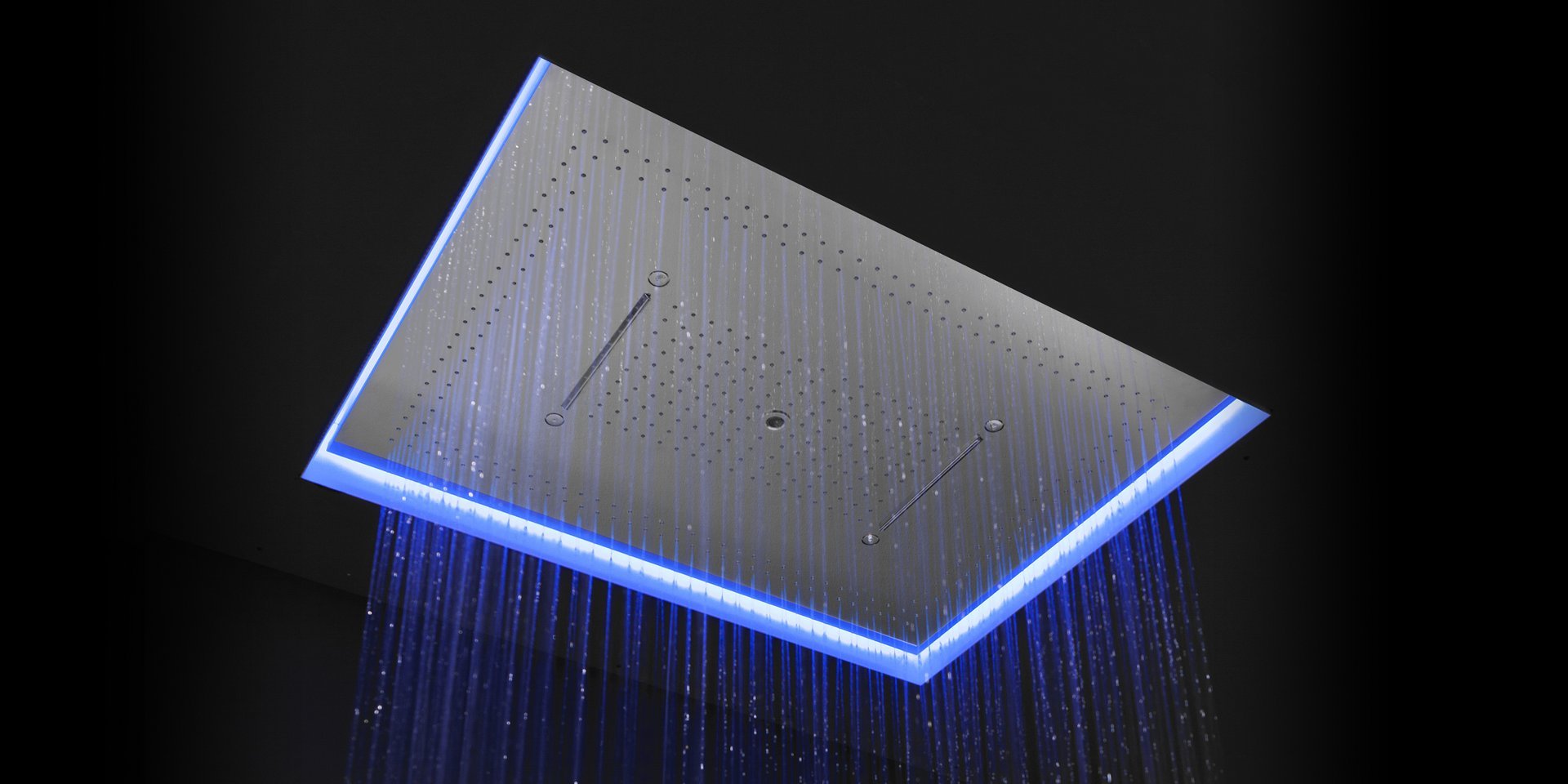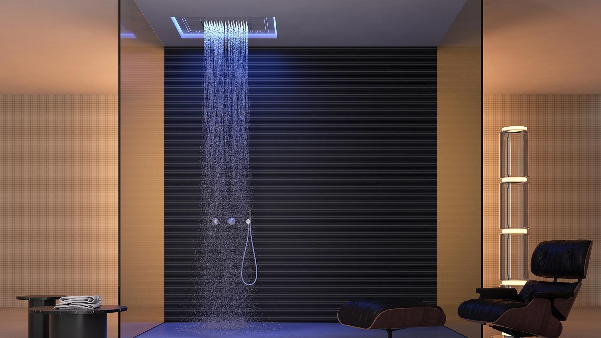 体贴的尺寸使 Meteo XXL 能够容纳传统模块:两个瀑布、4 个雾化器和一个由双排交错喷嘴制成的周边屏障。这种配置增加了系统的功能性,并通过分隔屏障促进了在没有传统淋浴间的位置的安装。这两个瀑布有一个斜射流,在中心相遇,并且在中心是一个特殊的喷嘴,可以产生非常强烈的射流。内置淋浴喷头采用不锈钢材质,镜面或白色饰面,RGB LED 集成照明(色光疗法功能),包括遥控器。光线增加了空间的体积并传达了感性。Meteo 是一个空旷的空间,水和光来自于此,可以实现极致的个性化放松。