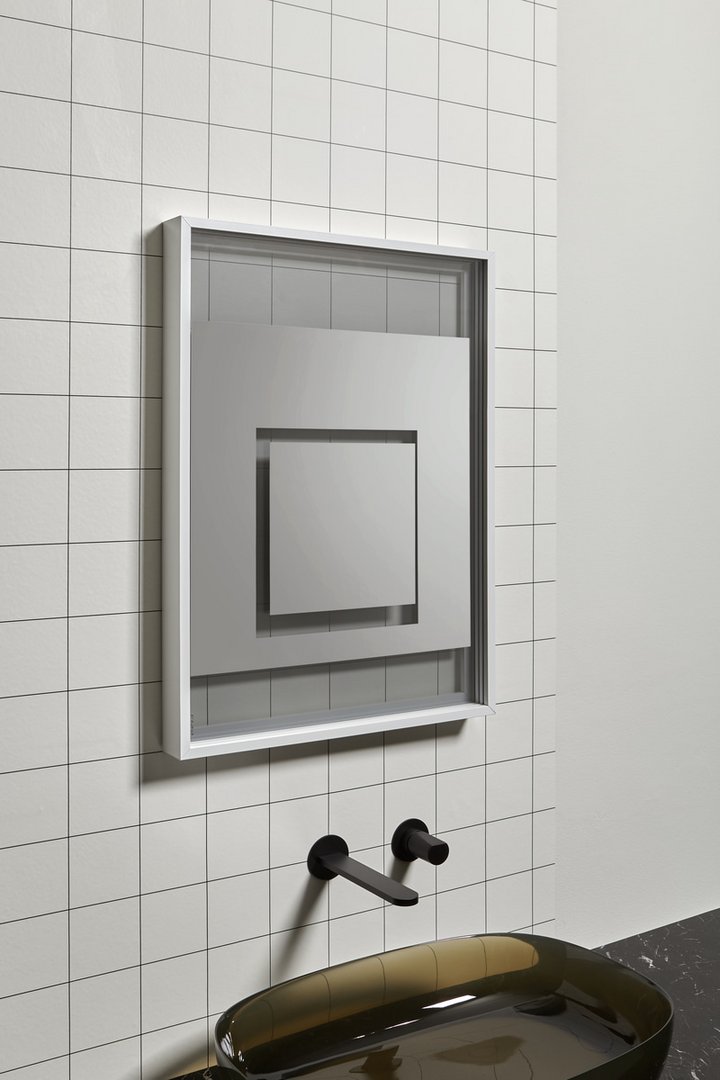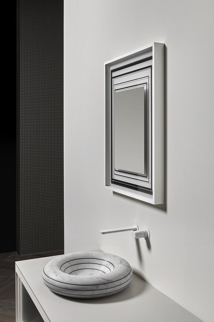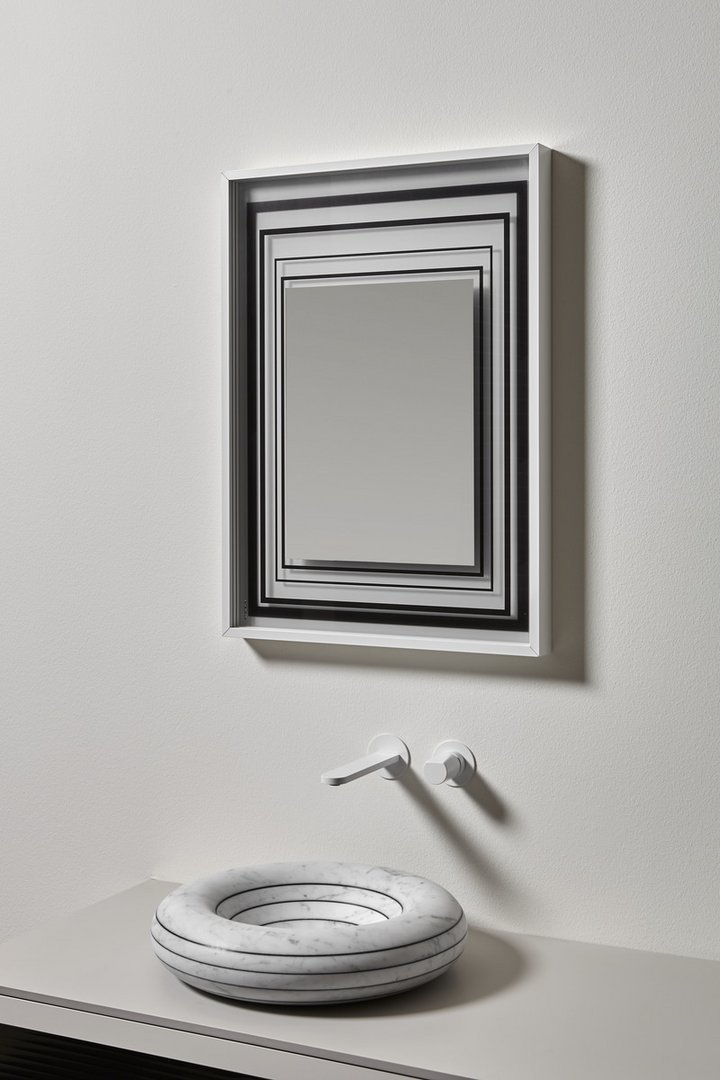 白色是三层镜面,其中两层是印刷的,一层是镜面的,这为二维表面赋予了深度。生成同心框的线条围绕镜子的一部分,绘制规则路径并定义区域和交叉点,允许您装饰反射表面,自定义放置它的区域。