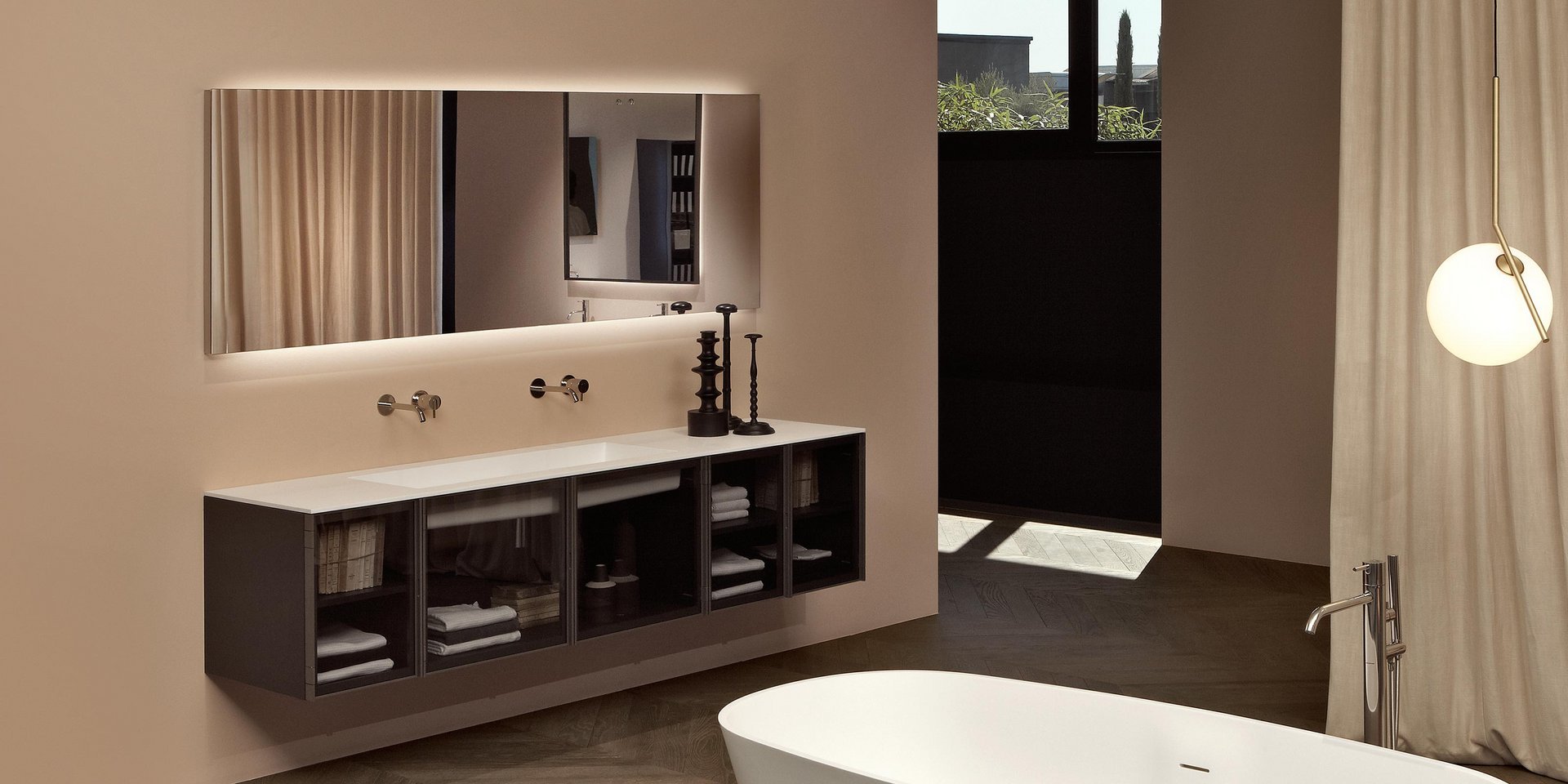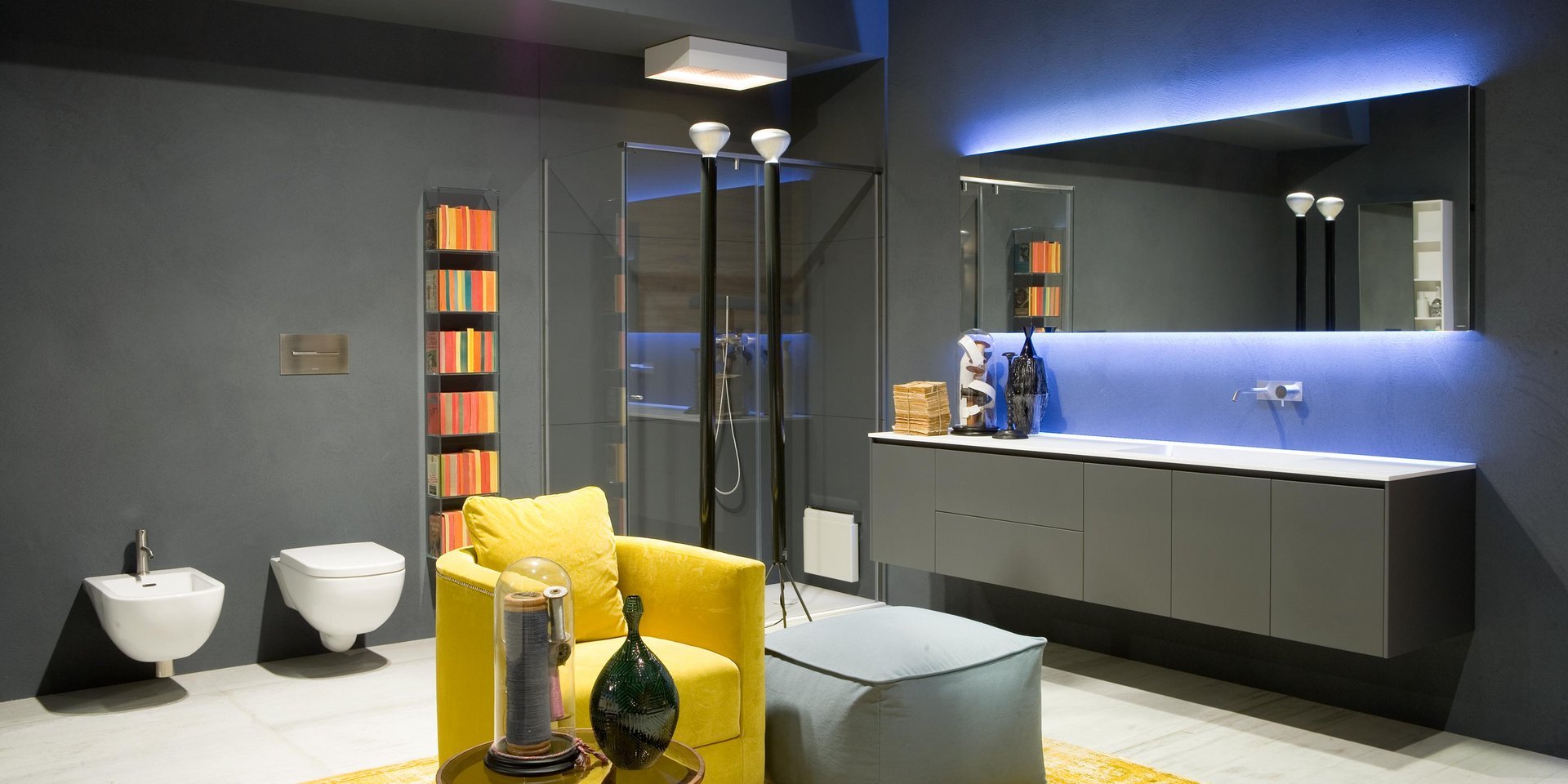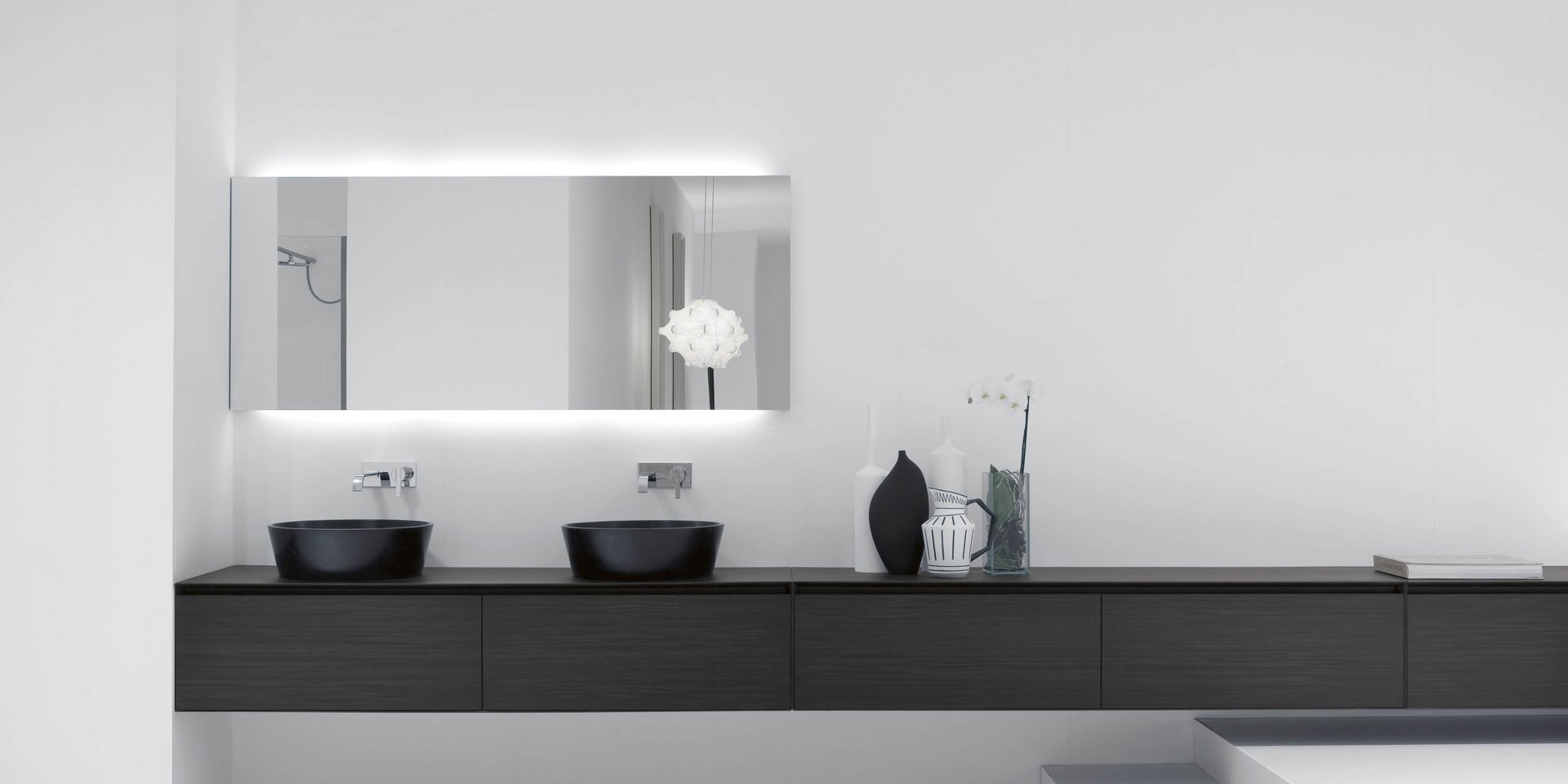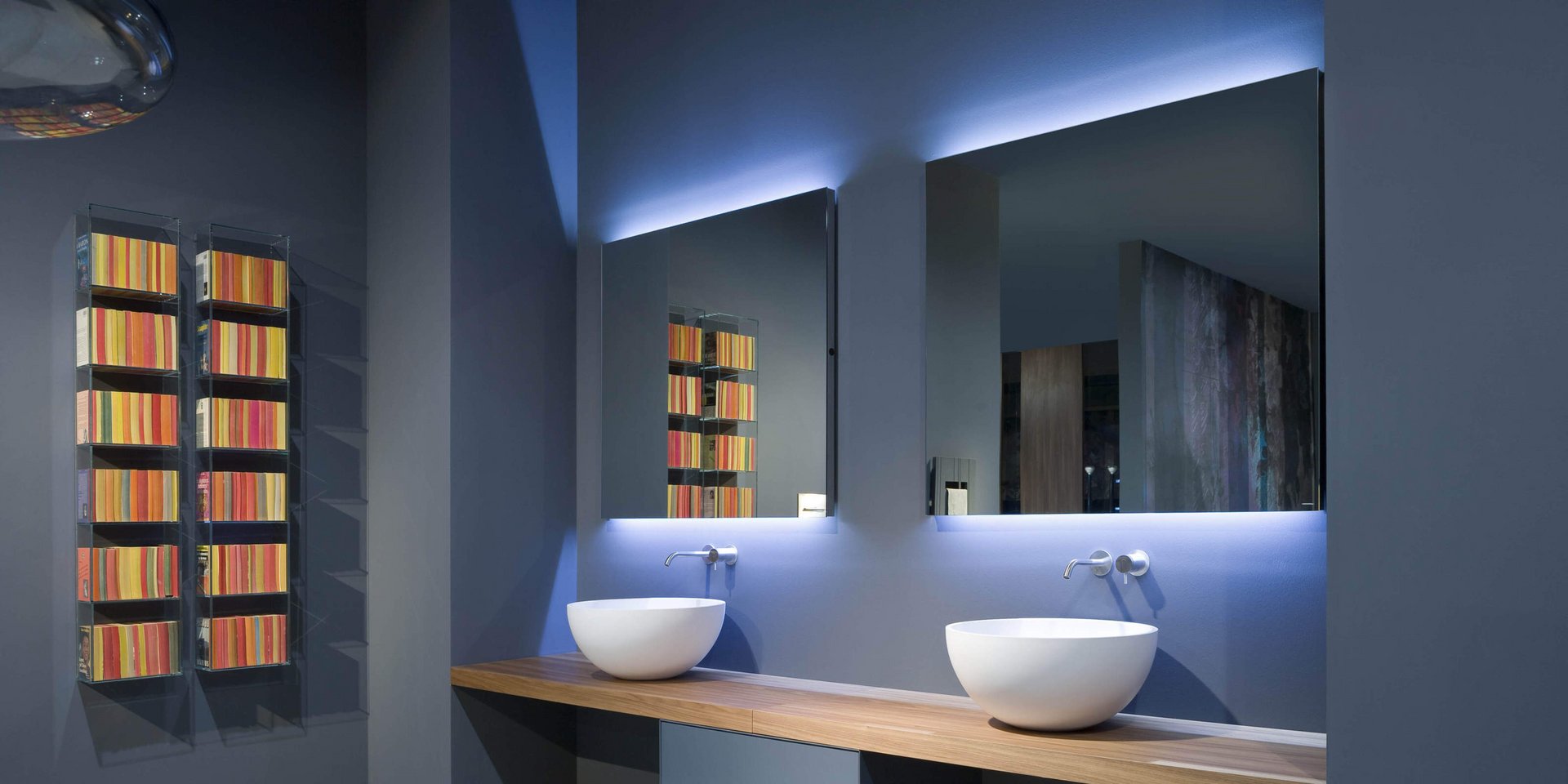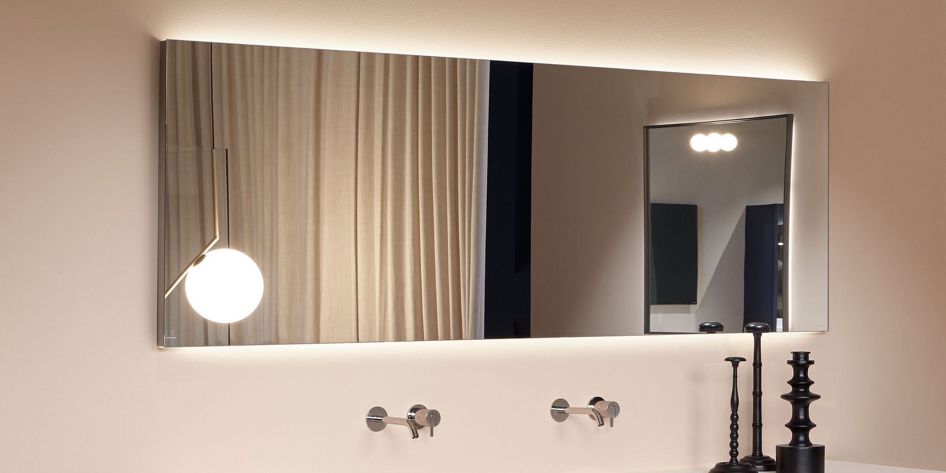 完美的表面,干净的周边,绝对的,没有可见的框架实际上只能从侧面看到。前视图令人惊叹且必不可少,白色或蓝色 LED 照明的微妙影响以柔和和漫射的方式突出了镜子的上部和下部。