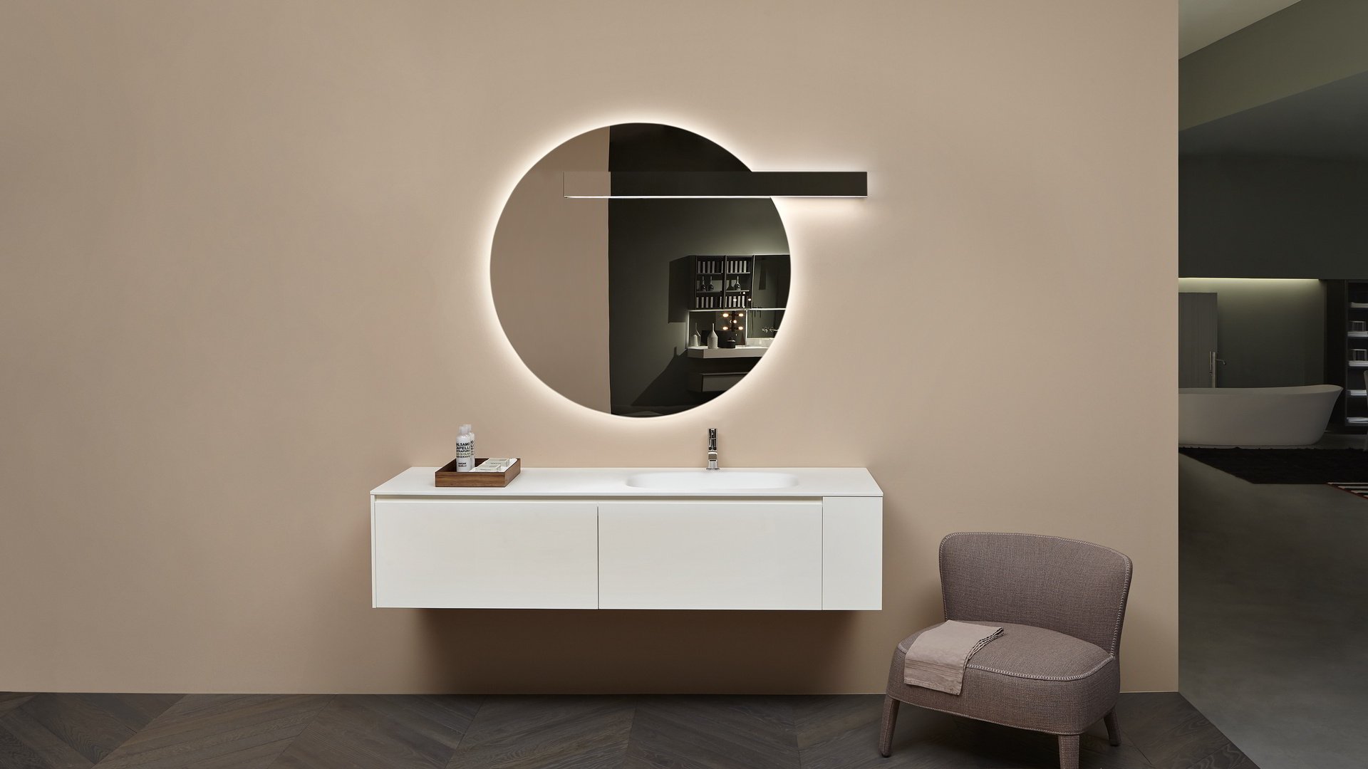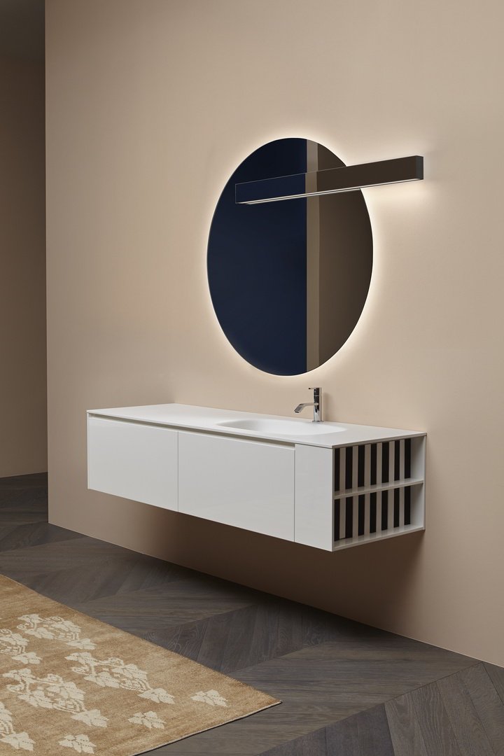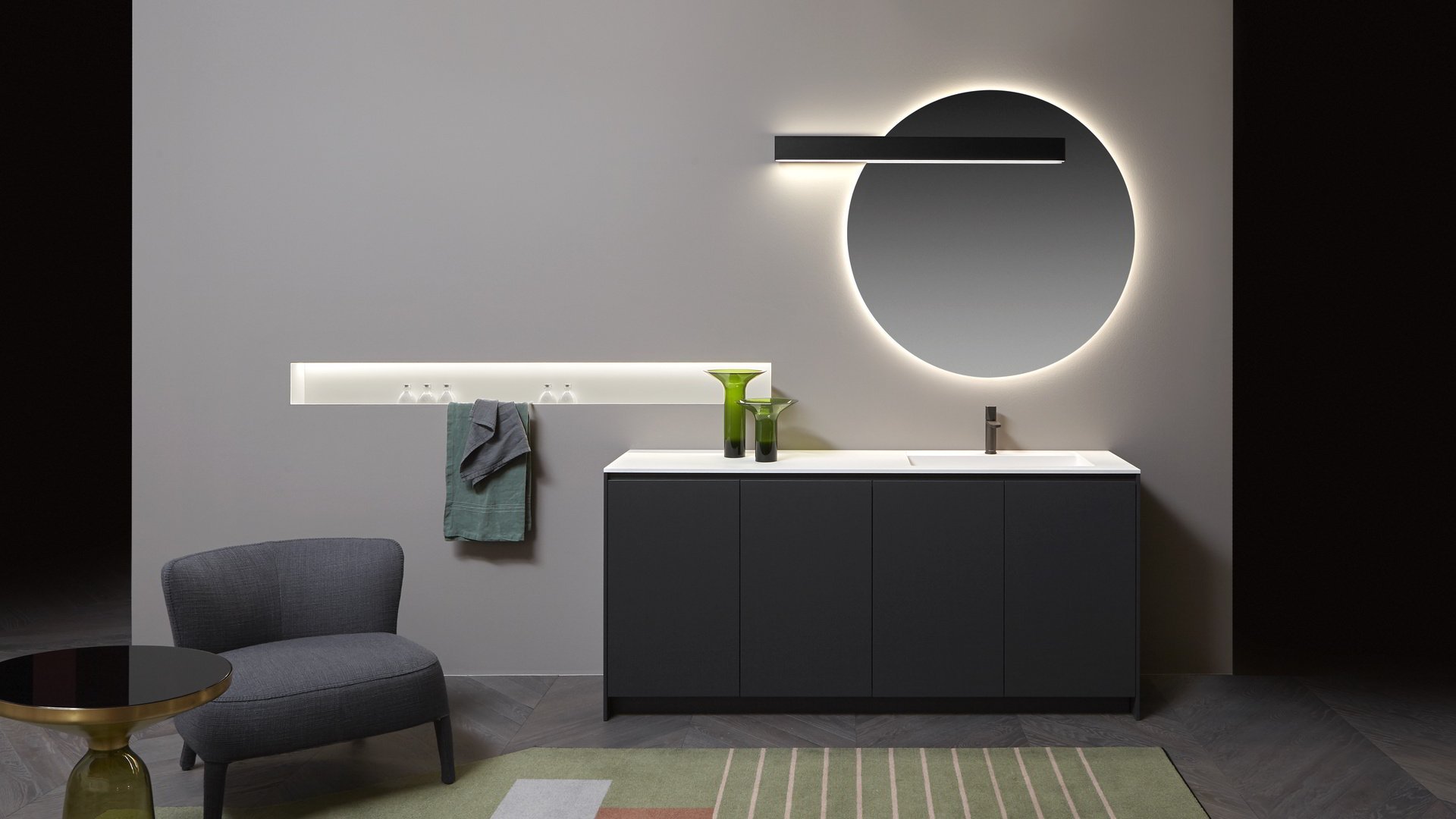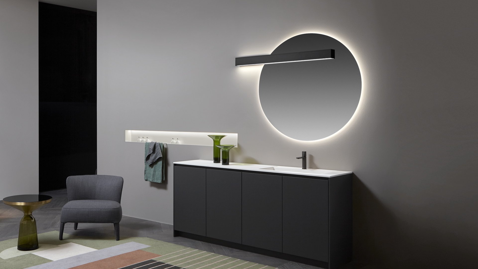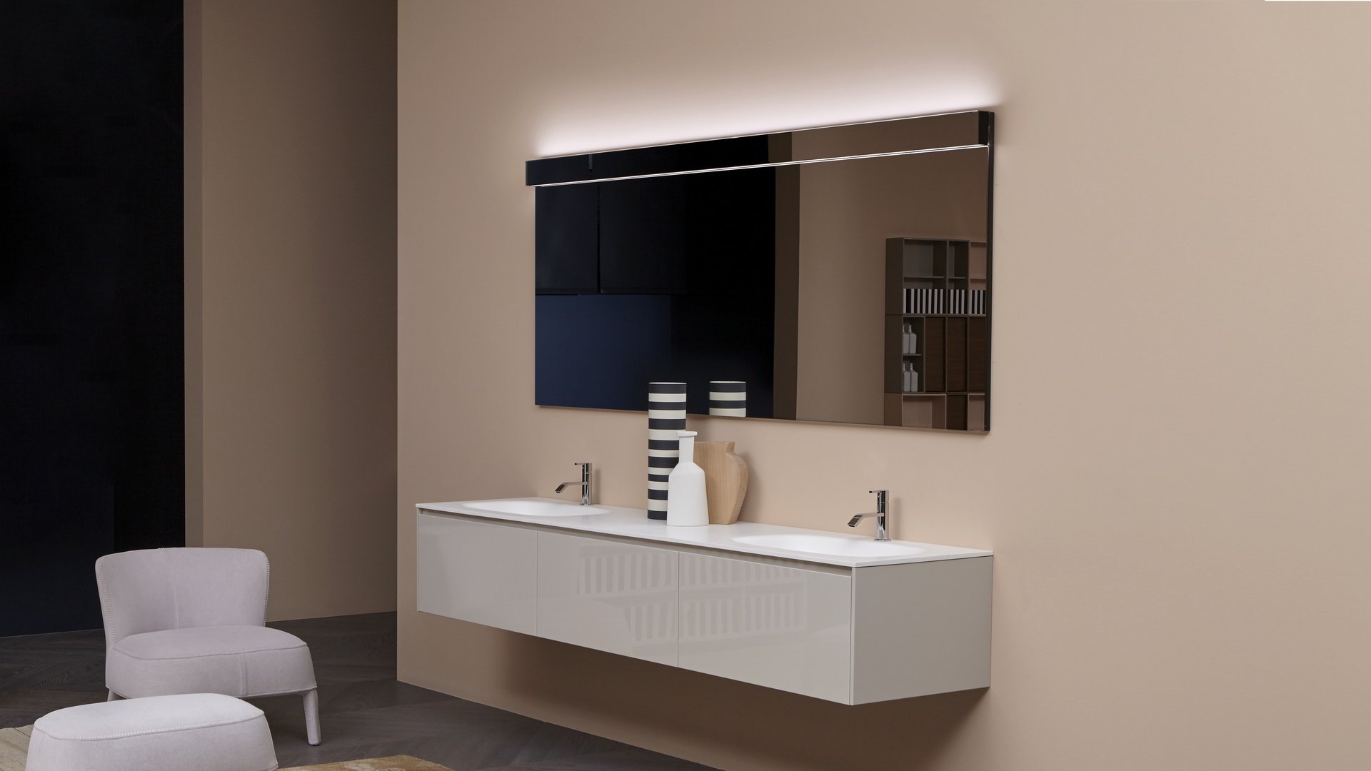 配备直接和间接 LED 照明,它可以呈现与镜子相同的宽度,真正完整地集成在一起。双灯让您可以在顶部营造氛围灯,并完美照亮下方的镜子。以光和反射为主角的最小解决方案。