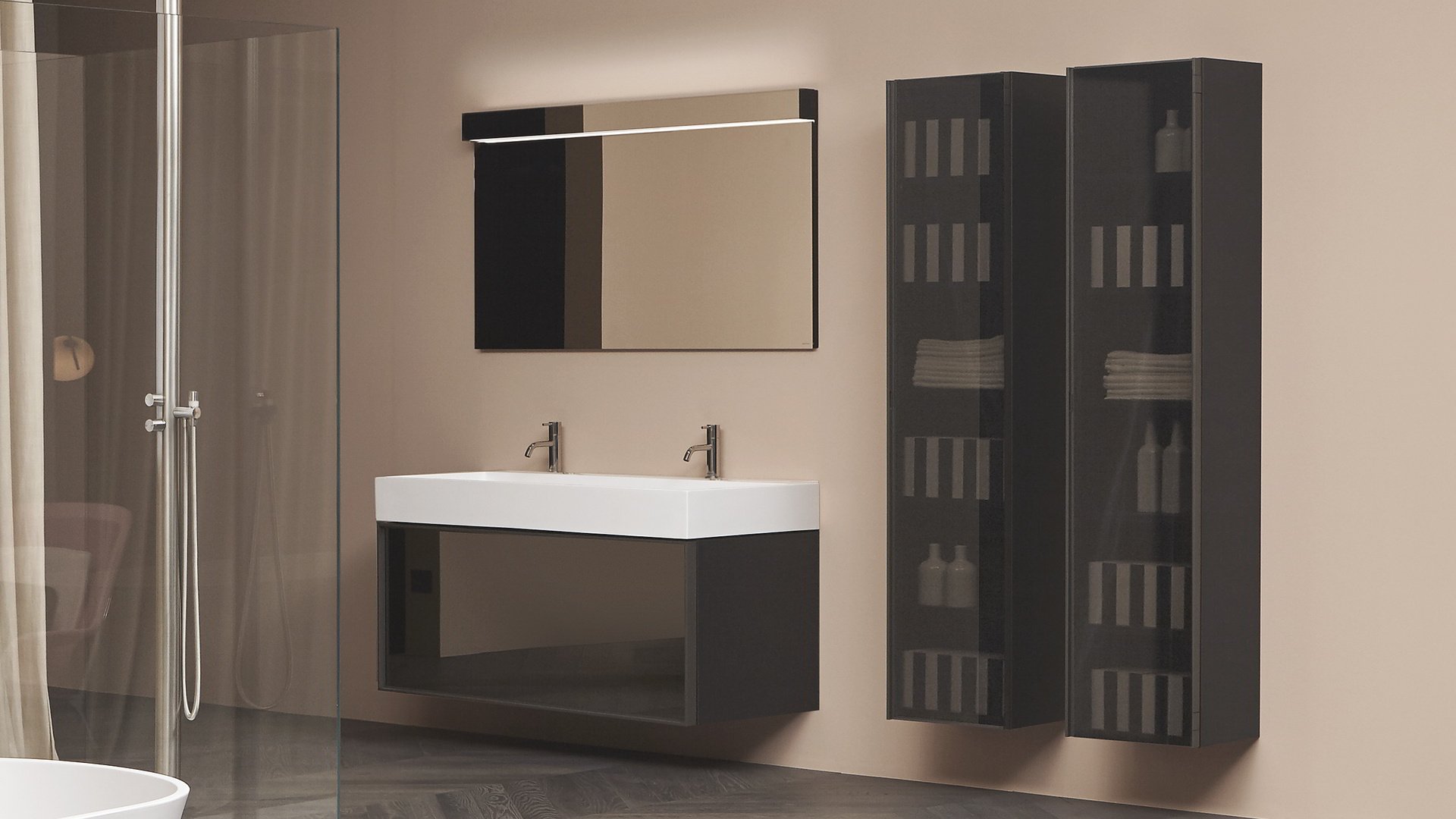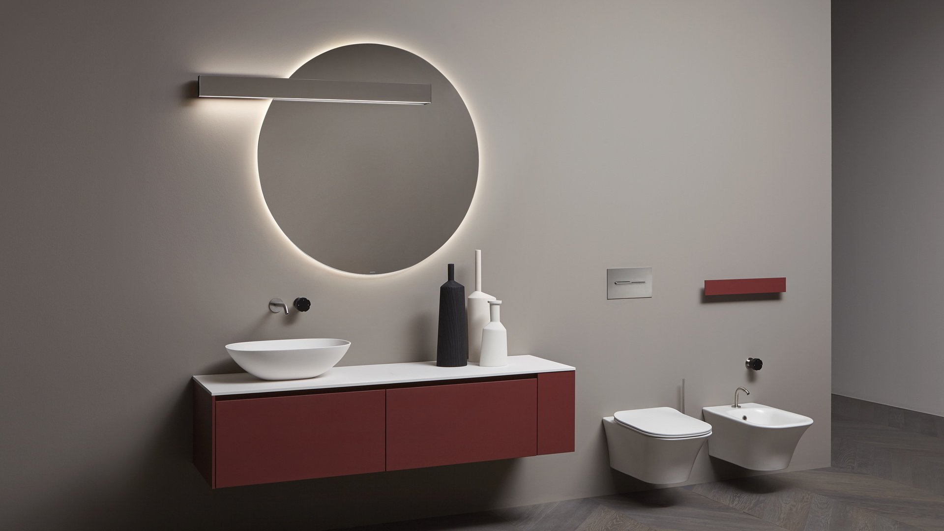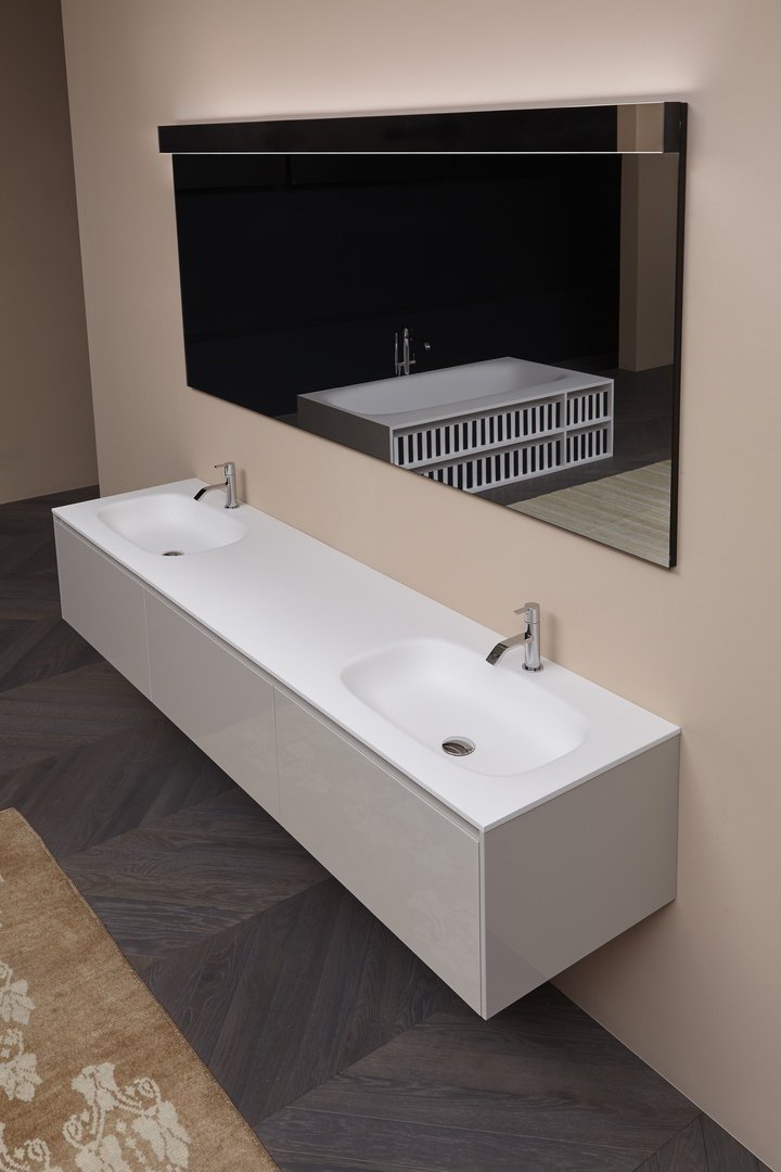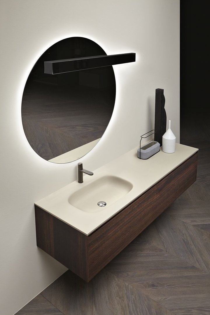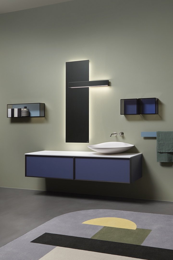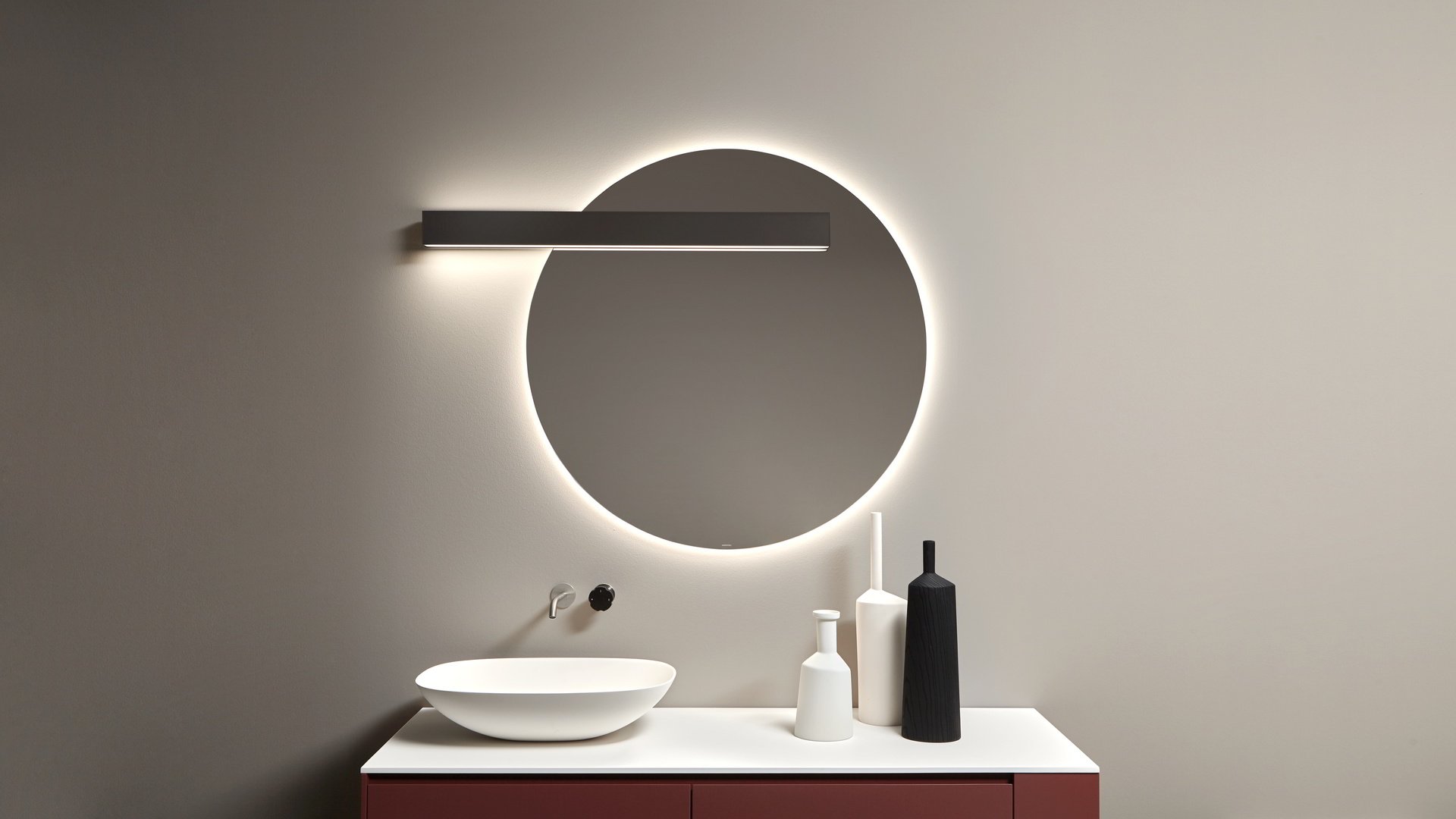 配备直接和间接 LED 照明,它可以呈现与镜子相同的宽度,真正完整地集成在一起。双灯让您可以在顶部营造氛围灯,并完美照亮下方的镜子。以光和反射为主角的最小解决方案。