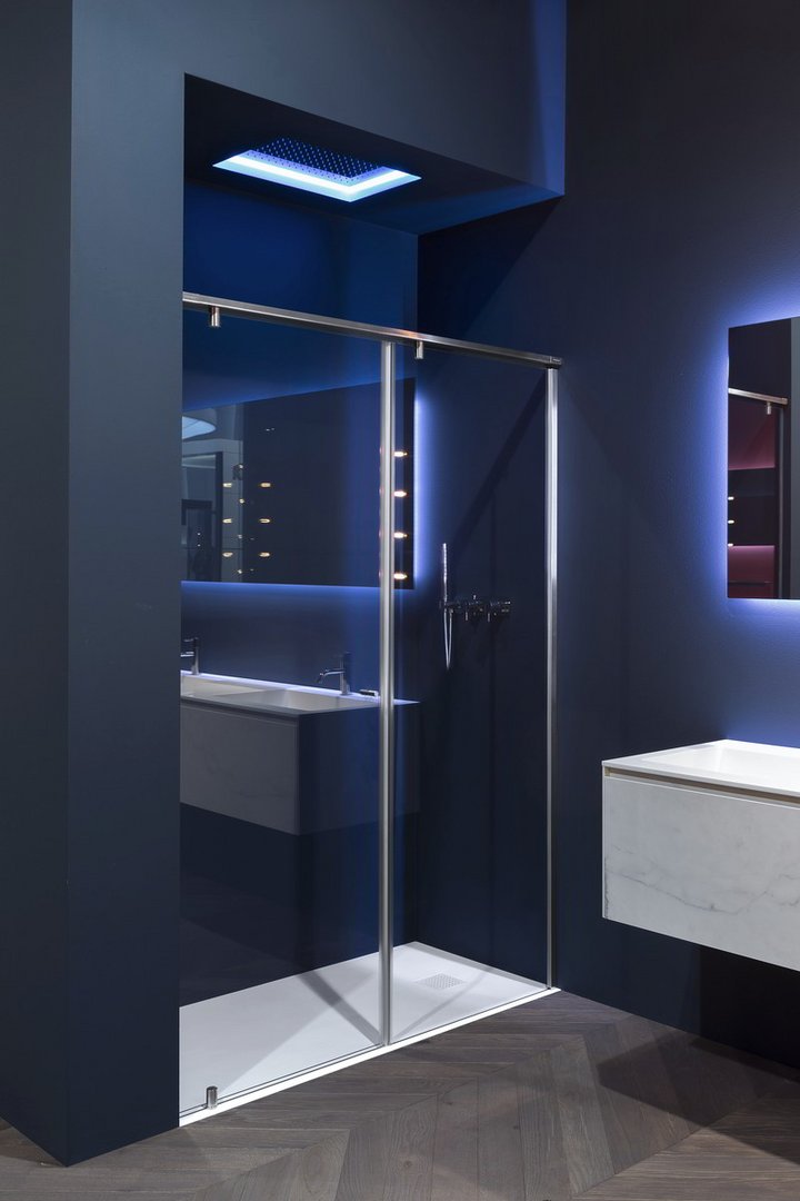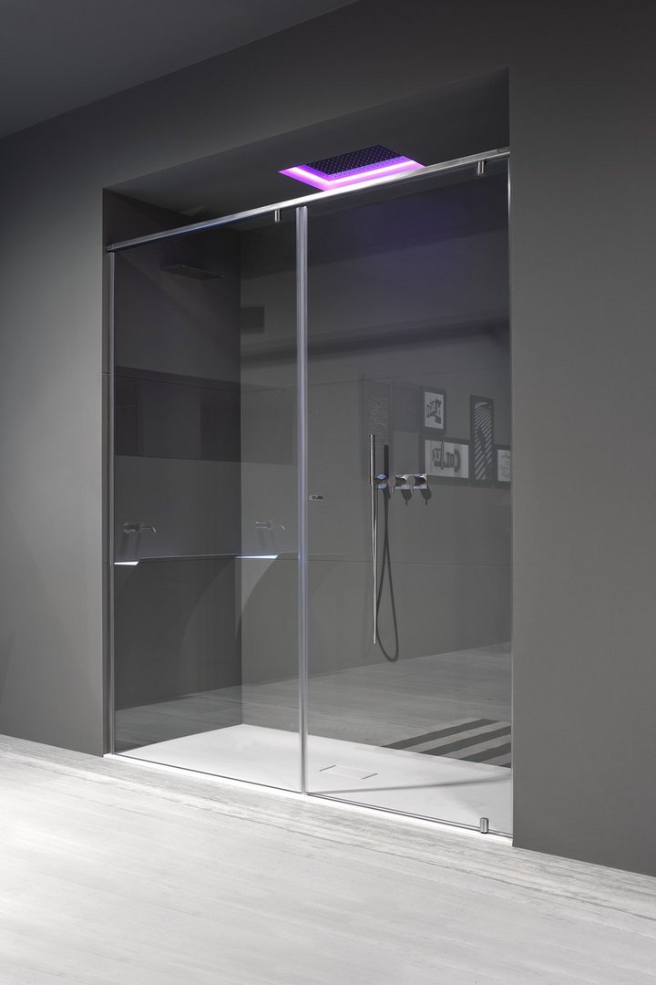 可用于多种尺寸或角落的凹陷区域。Bilico 有两种解决方案;一个带有偏心旋转,另一个中心用于较大的门。移动门可以与固定玻璃结合使用,既可以采用印有原始装饰的丝网,也可以用于 ILBagno 系列。
