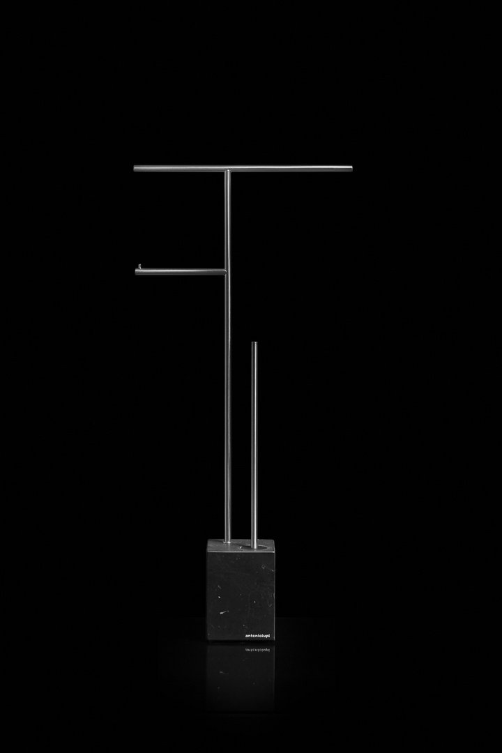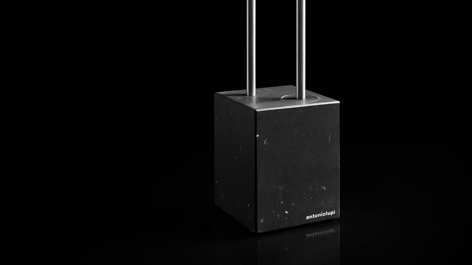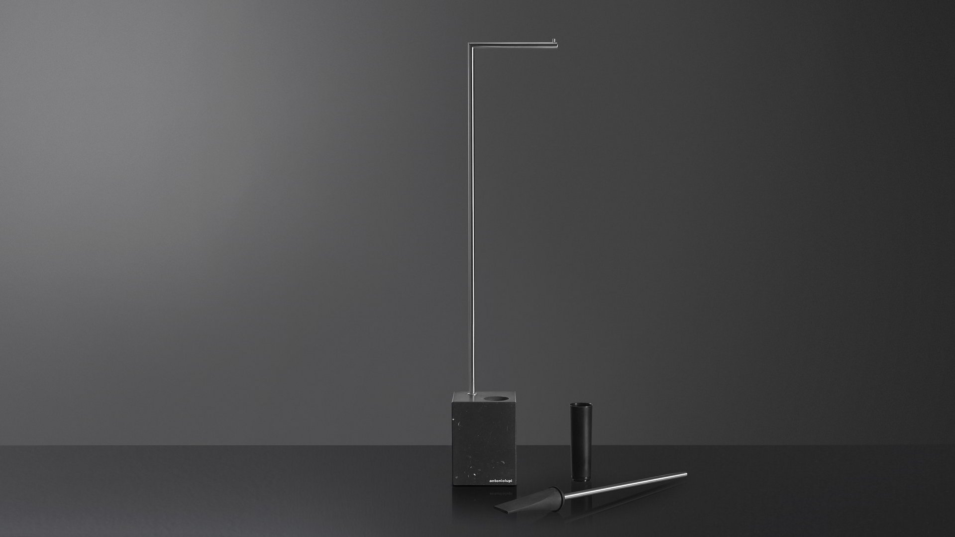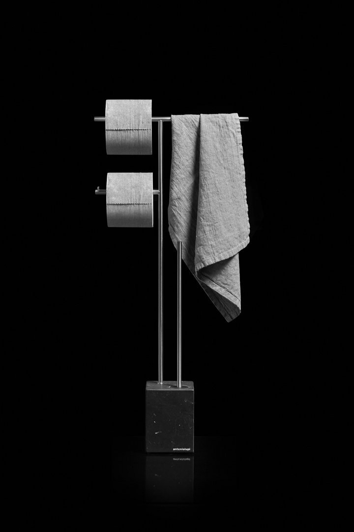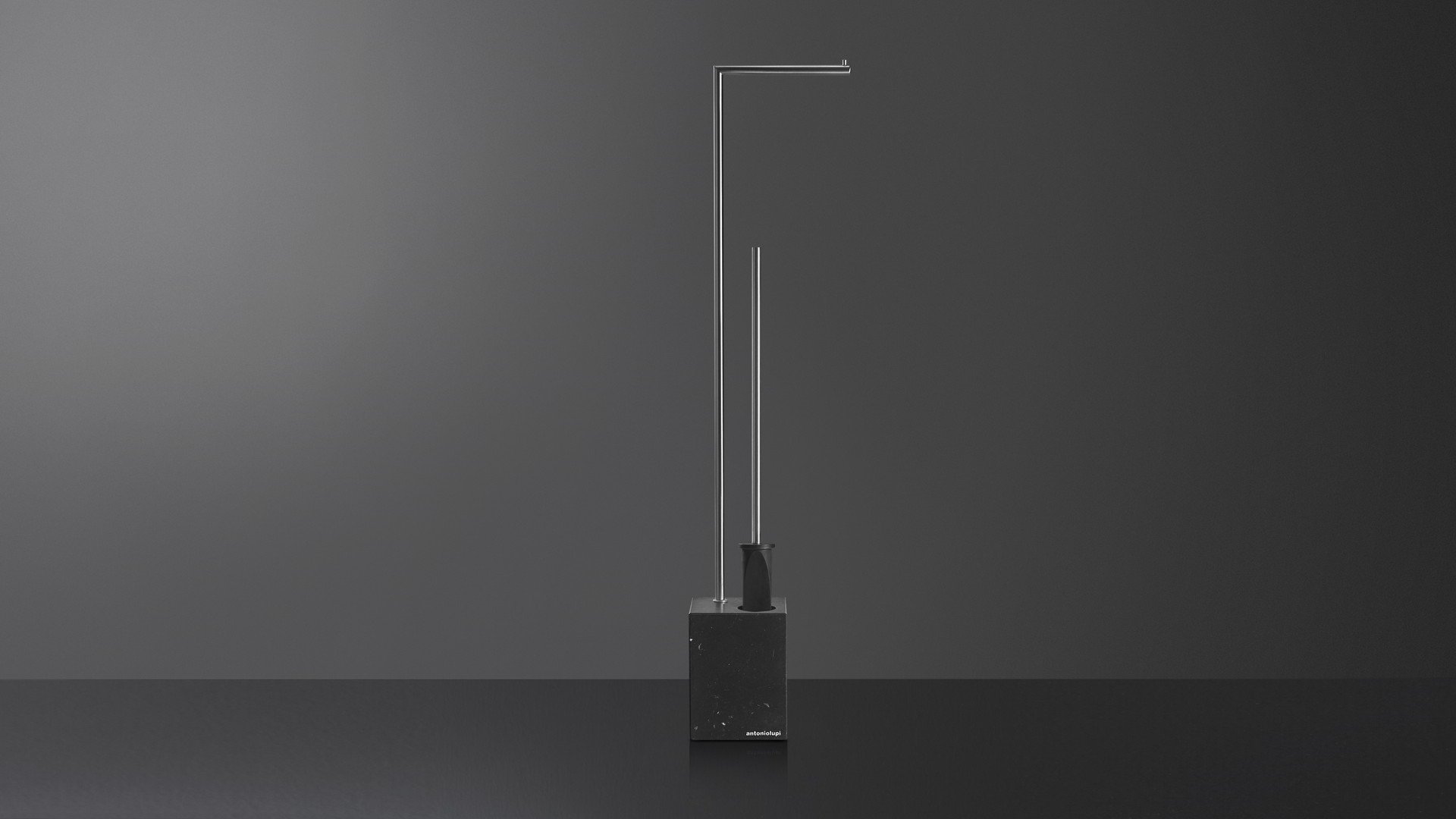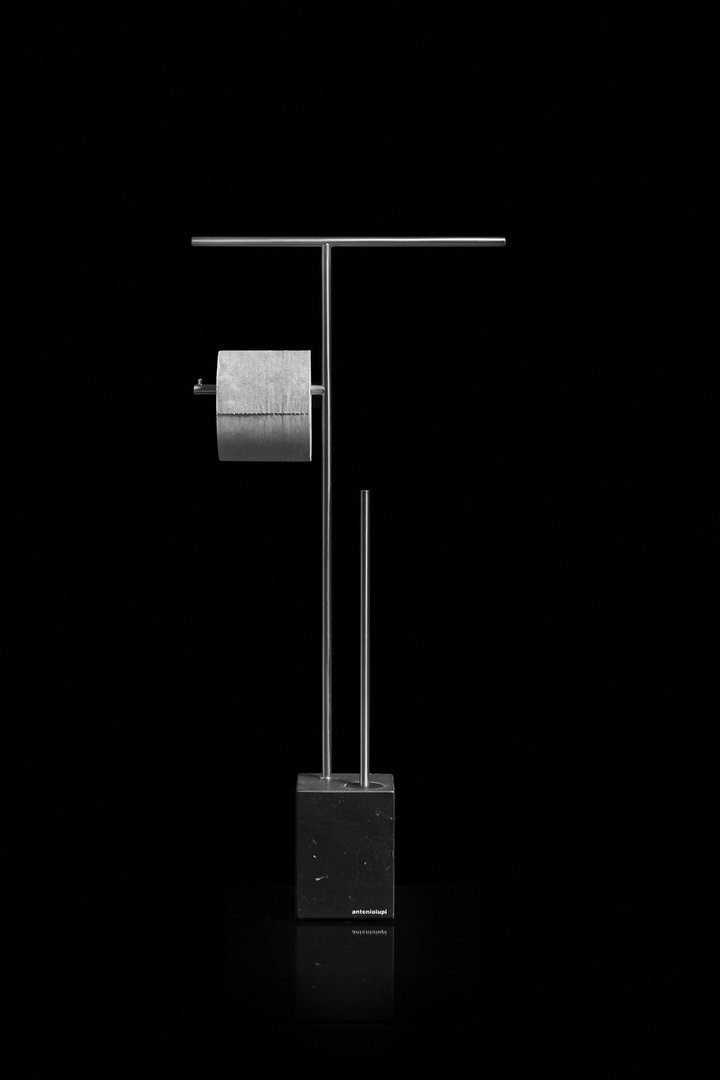 Bivio 系列有一个图形和严谨的标志,通过插入黑色硅胶刮刀刷架完成,确保完美的卫生并赋予对象一个创新的概念。Carrara Marble 或 Nero Marquinia 的立方底座代表地球的宝贵遗产,金属结构采用黄铜和缎面钢饰面,可根据要求提供各种颜色。