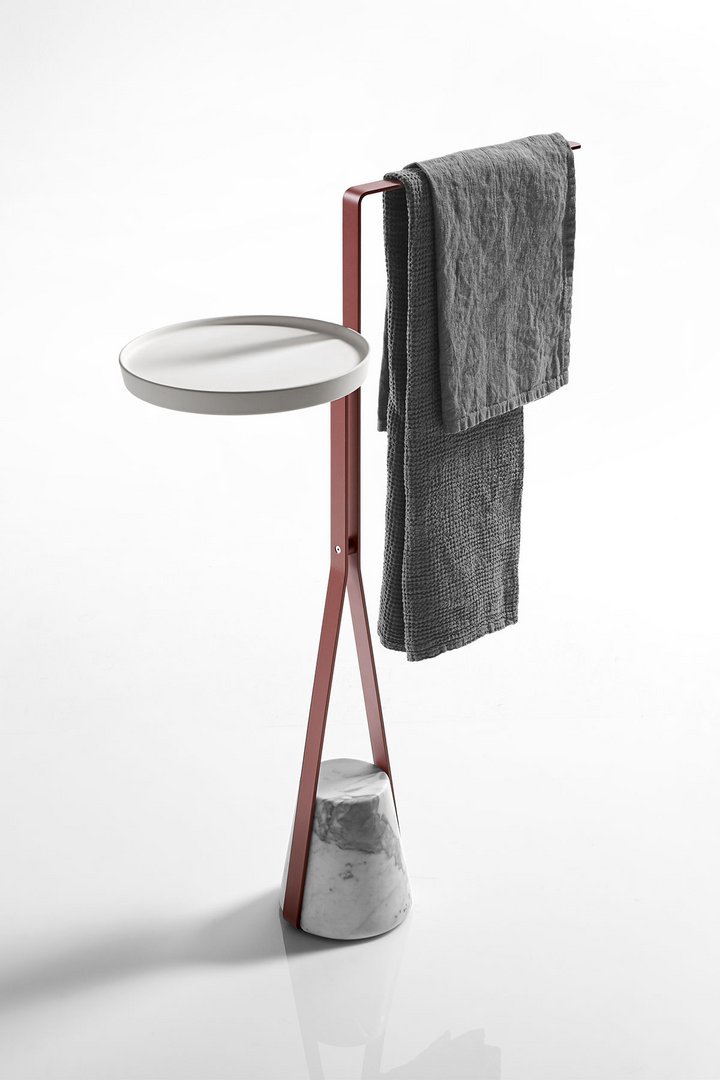 以缎面 Carrara 大理石制成的截锥形底座作为身份特征,黄铜金属结构,提供 antoniolupi 提供的不同颜色,以及在特定高度找到交汇点的轮廓,从中可以开发不同的配置。例如,在桌面版本中,由 Flumood 或 Colormood 制成的圆形托盘提供了一个方便的支撑表面,用于放置用于个人护理和进行个性化健康仪式的物品。