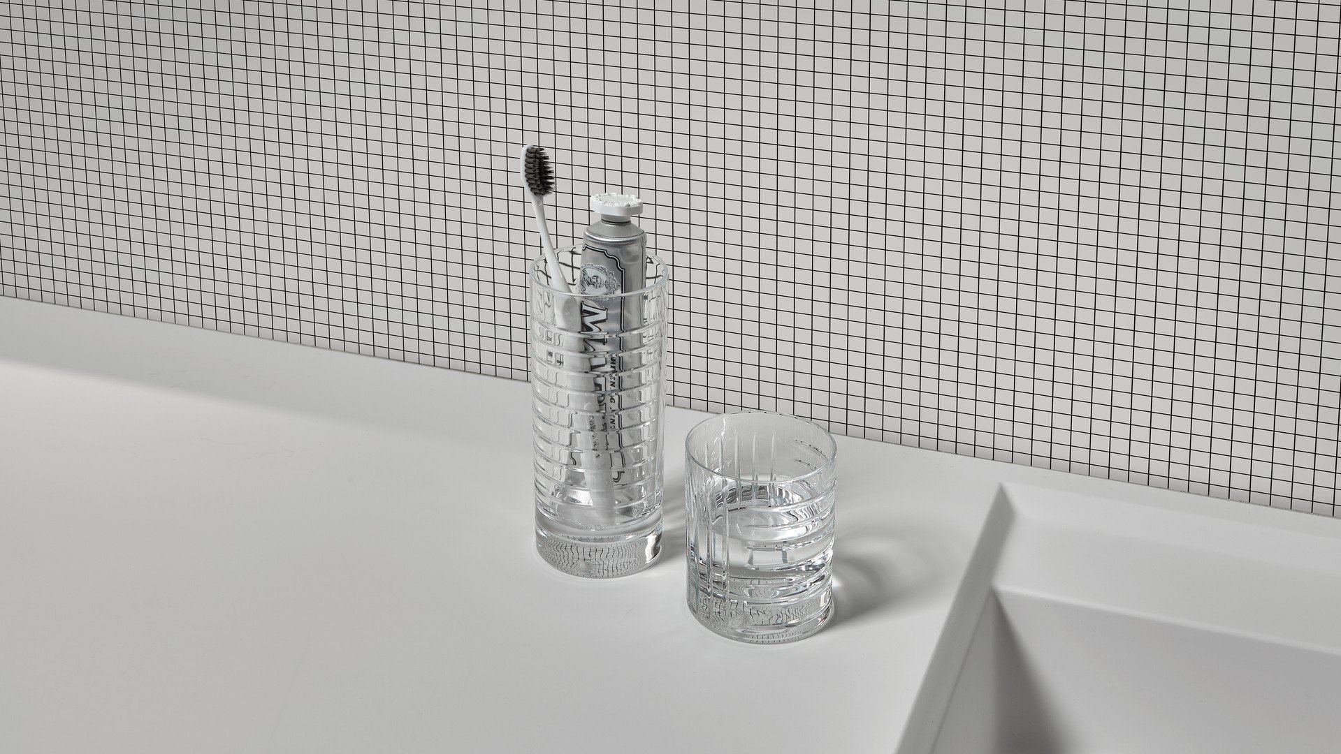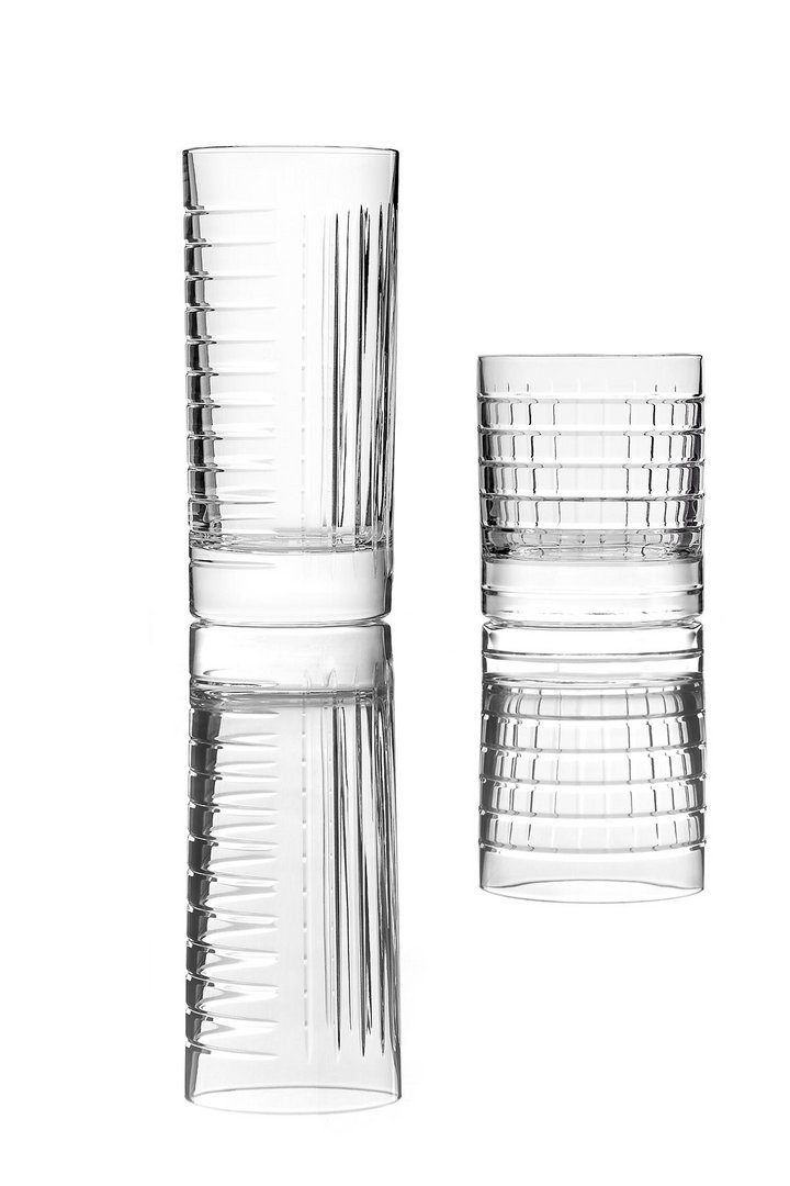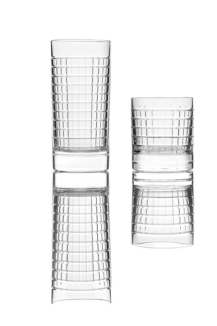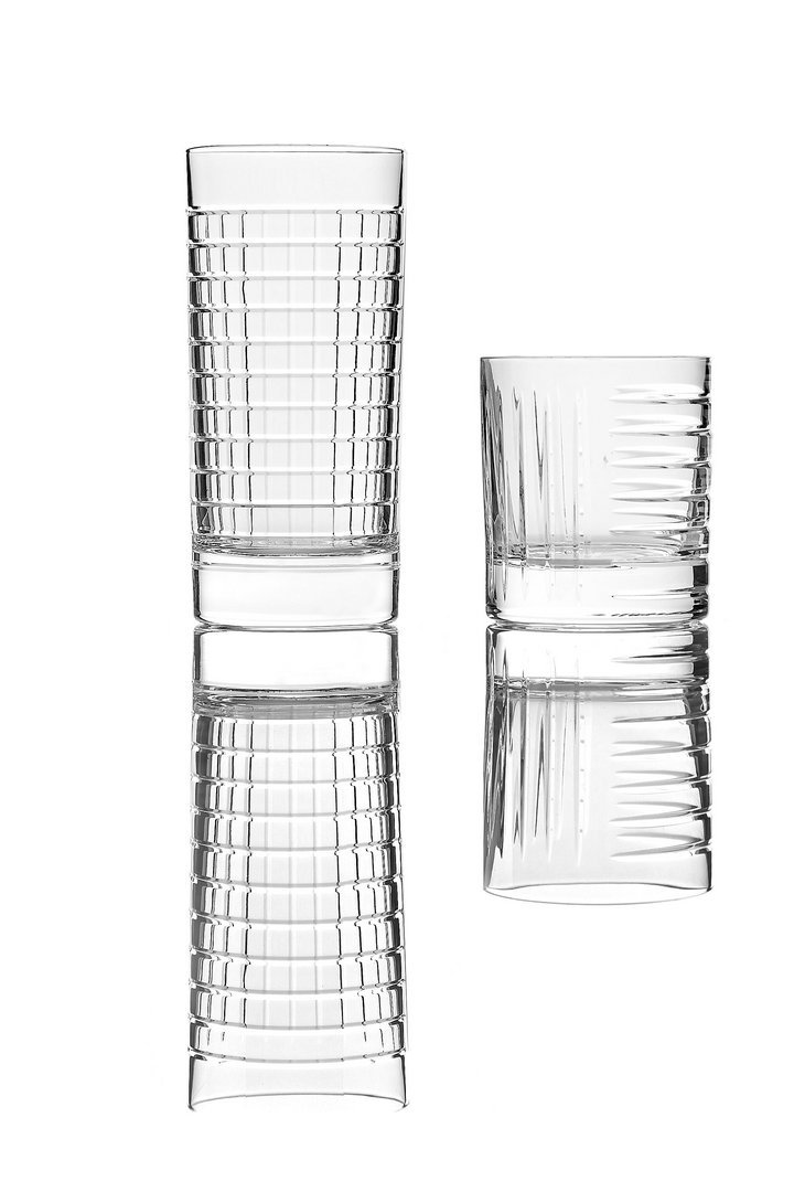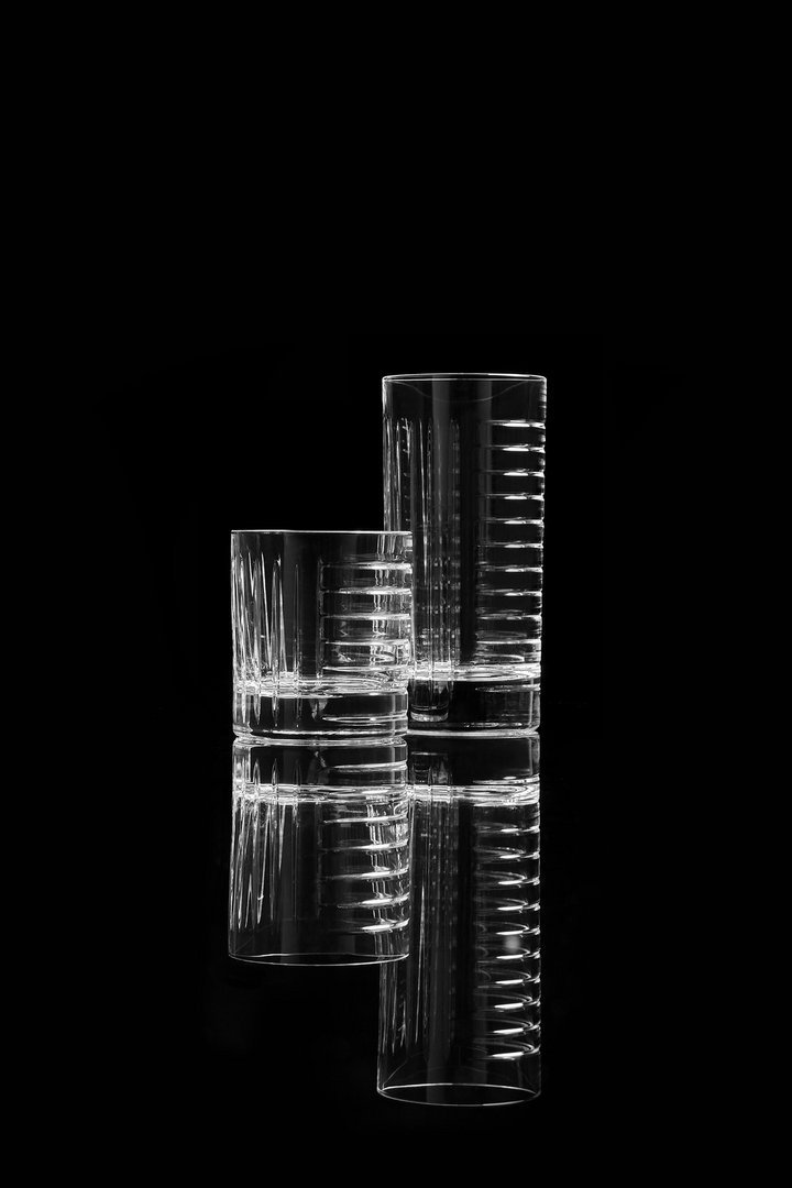 水槽、镜子、墙纸、地毯,现在也是物品,其特点是严谨但不稀薄的几何形状和通过简单、线性、通用的图形线表达的表现力。两杯不同高度,洗碗机安全,可在浴室用作牙刷架,也可用于厨房或客厅。水晶的垂直标志和复杂的手工雕刻允许痕迹深度的差异,这将决定体积的感知。由人类的手、他对材料和他的行为的知识、与地球的独特关系产生的痕迹,成为为项目服务的工具。就像光一样,它根据玻璃的不同位置,将其形象相乘,在不断进化中确定最终状态。