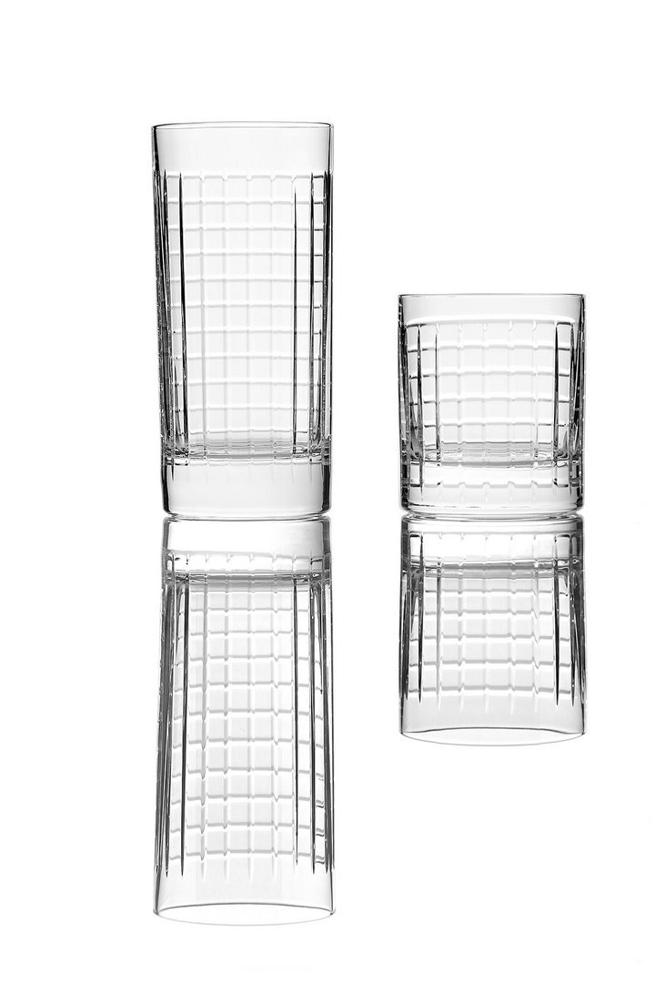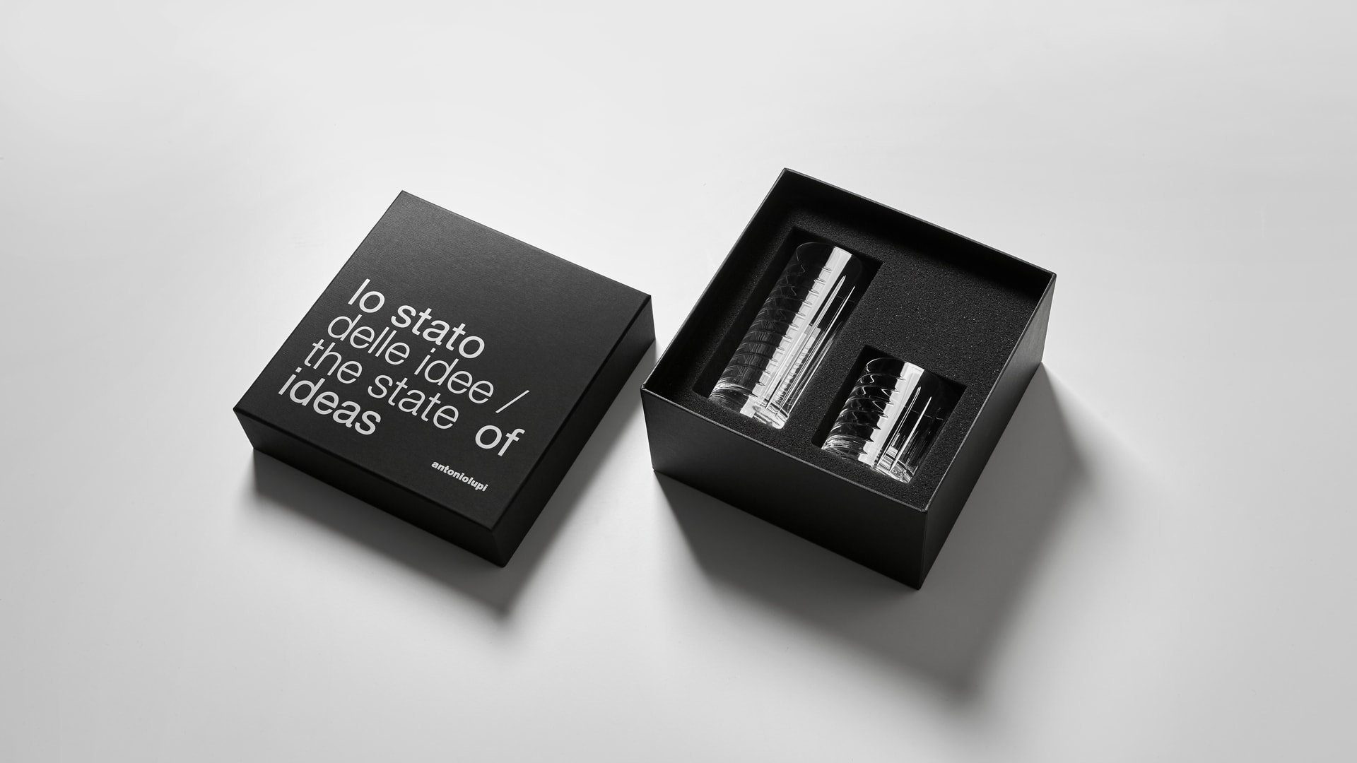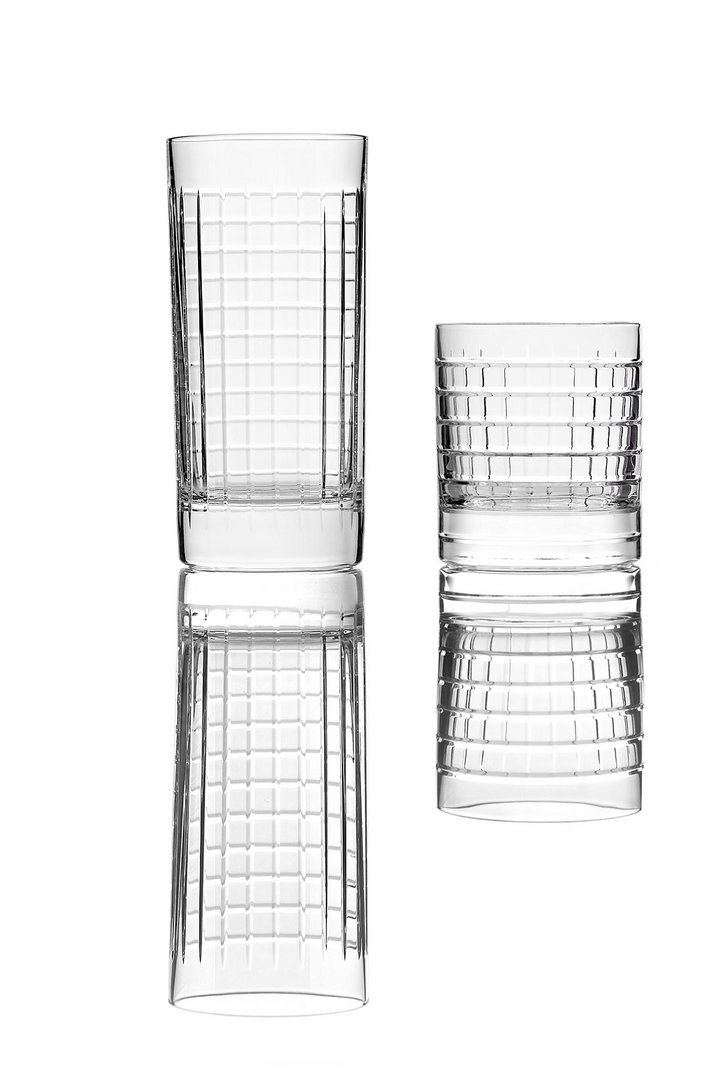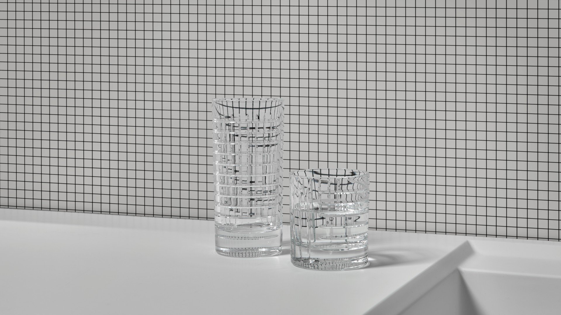 水槽、镜子、墙纸、地毯,现在也是物品,其特点是严谨但不稀薄的几何形状和通过简单、线性、通用的图形线表达的表现力。两杯不同高度,洗碗机安全,可在浴室用作牙刷架,也可用于厨房或客厅。水晶的垂直标志和复杂的手工雕刻允许痕迹深度的差异,这将决定体积的感知。由人类的手、他对材料和他的行为的知识、与地球的独特关系产生的痕迹,成为为项目服务的工具。就像光一样,它根据玻璃的不同位置,将其形象相乘,在不断进化中确定最终状态。