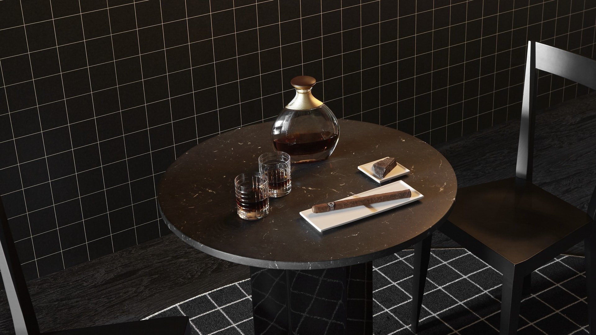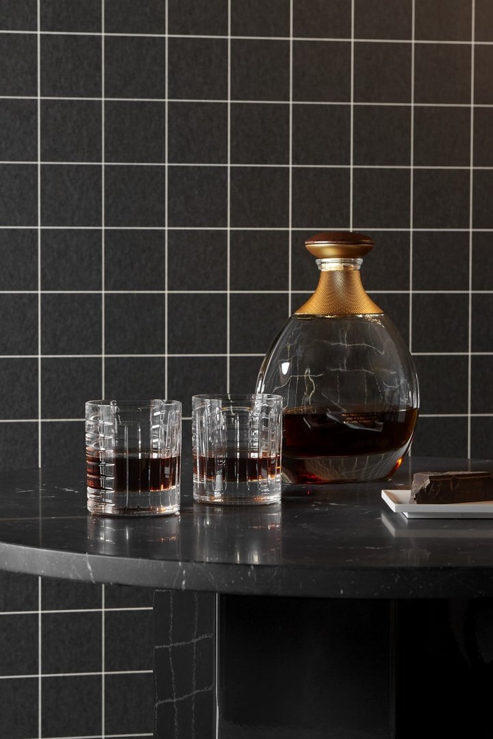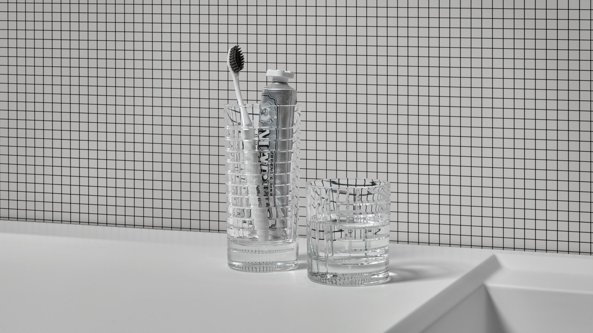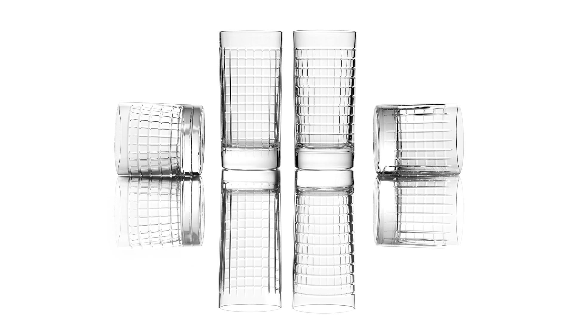 水槽、镜子、墙纸、地毯,现在也是物品,其特点是严谨但不稀薄的几何形状和通过简单、线性、通用的图形线表达的表现力。两杯不同高度,洗碗机安全,可在浴室用作牙刷架,也可用于厨房或客厅。水晶的垂直标志和复杂的手工雕刻允许痕迹深度的差异,这将决定体积的感知。由人类的手、他对材料和他的行为的知识、与地球的独特关系产生的痕迹,成为为项目服务的工具。就像光一样,它根据玻璃的不同位置,将其形象相乘,在不断进化中确定最终状态。